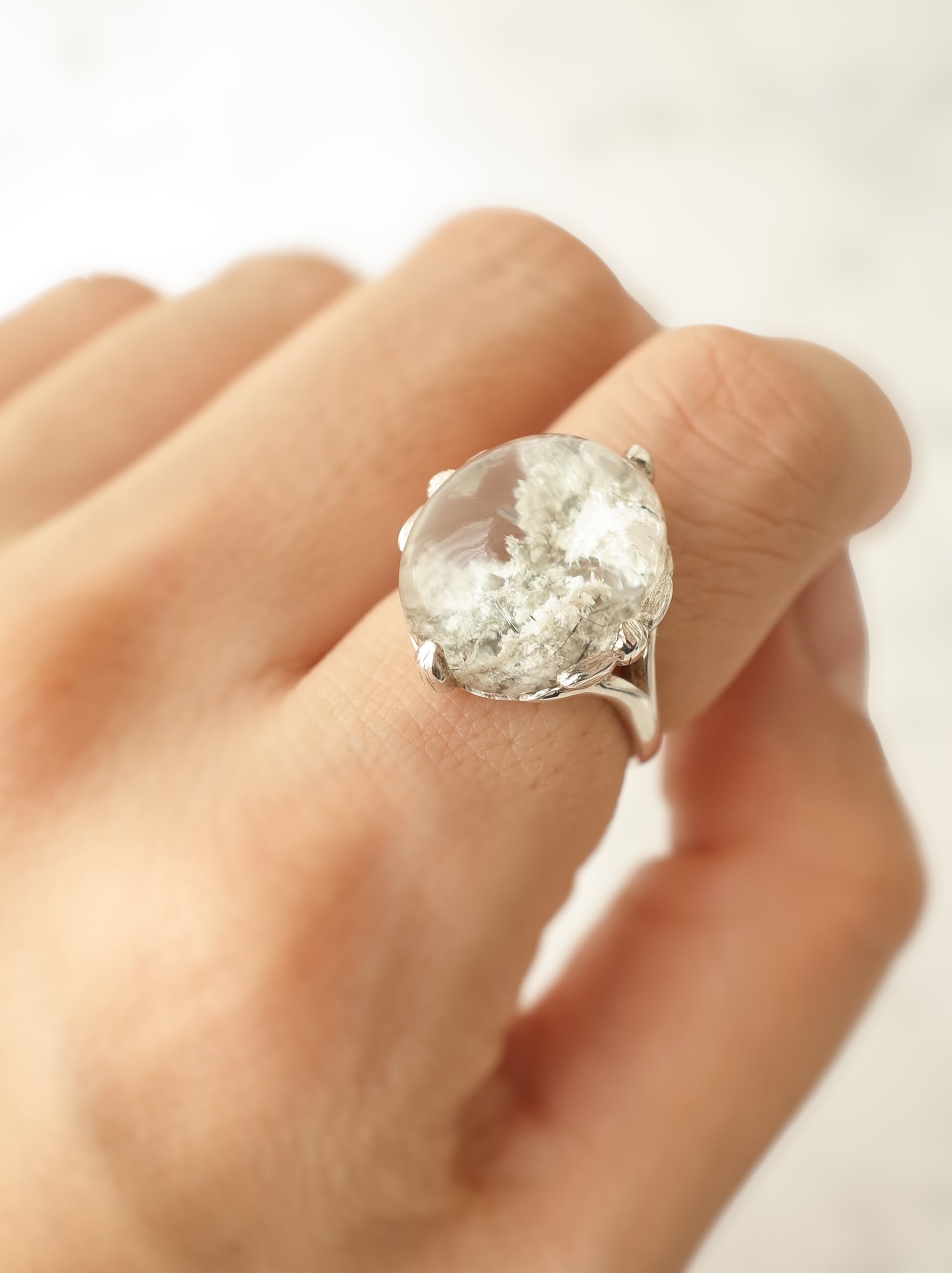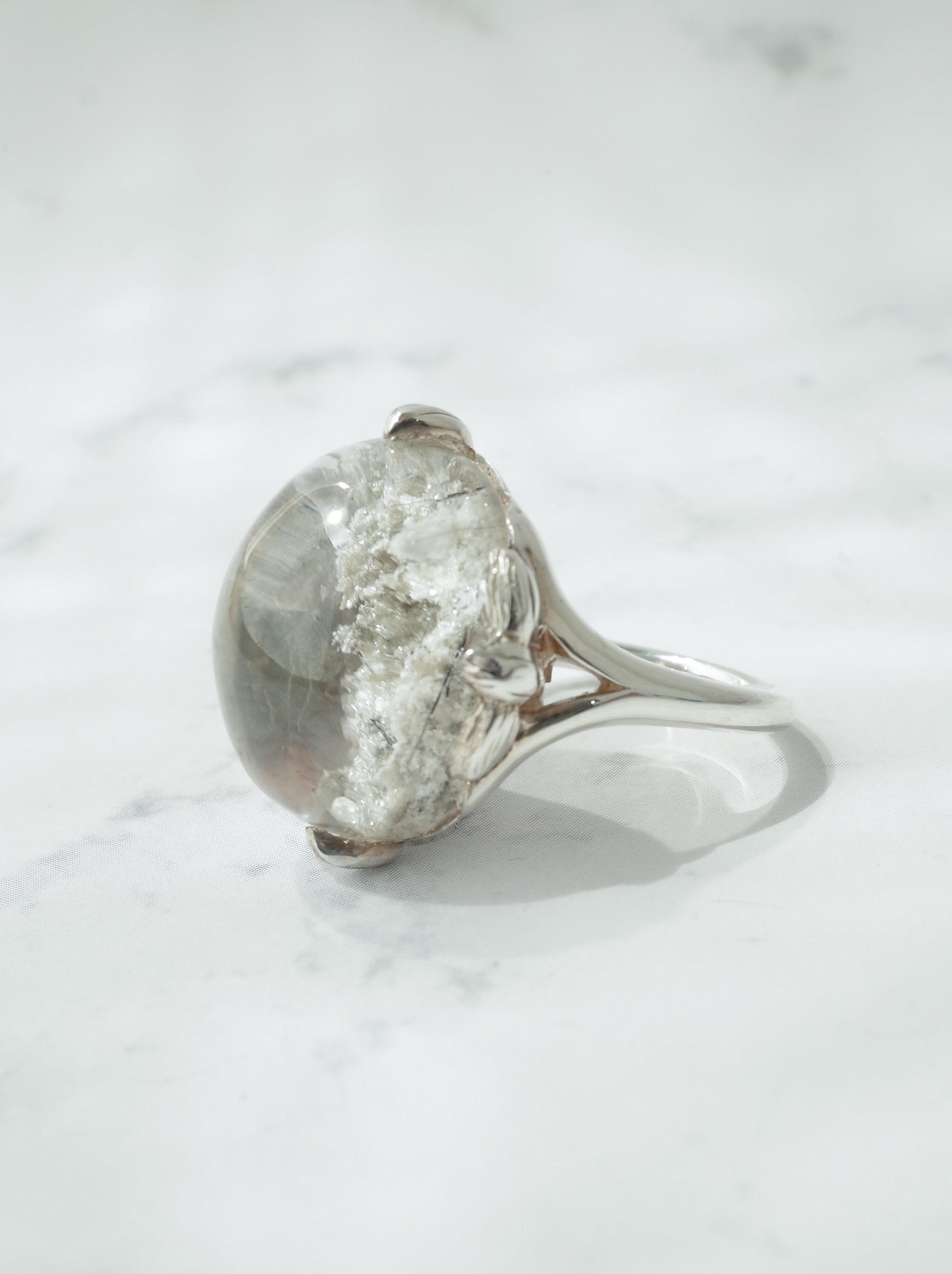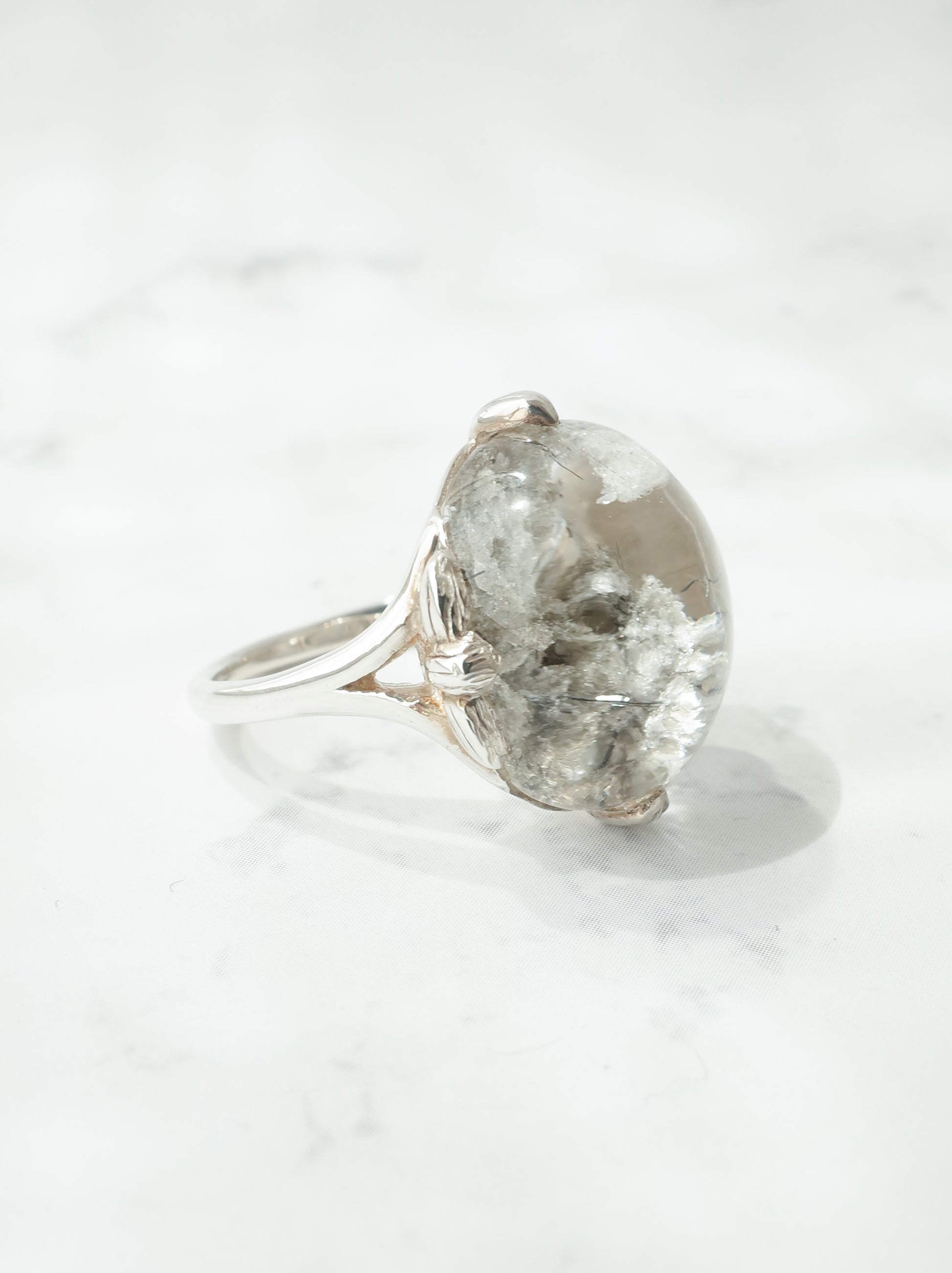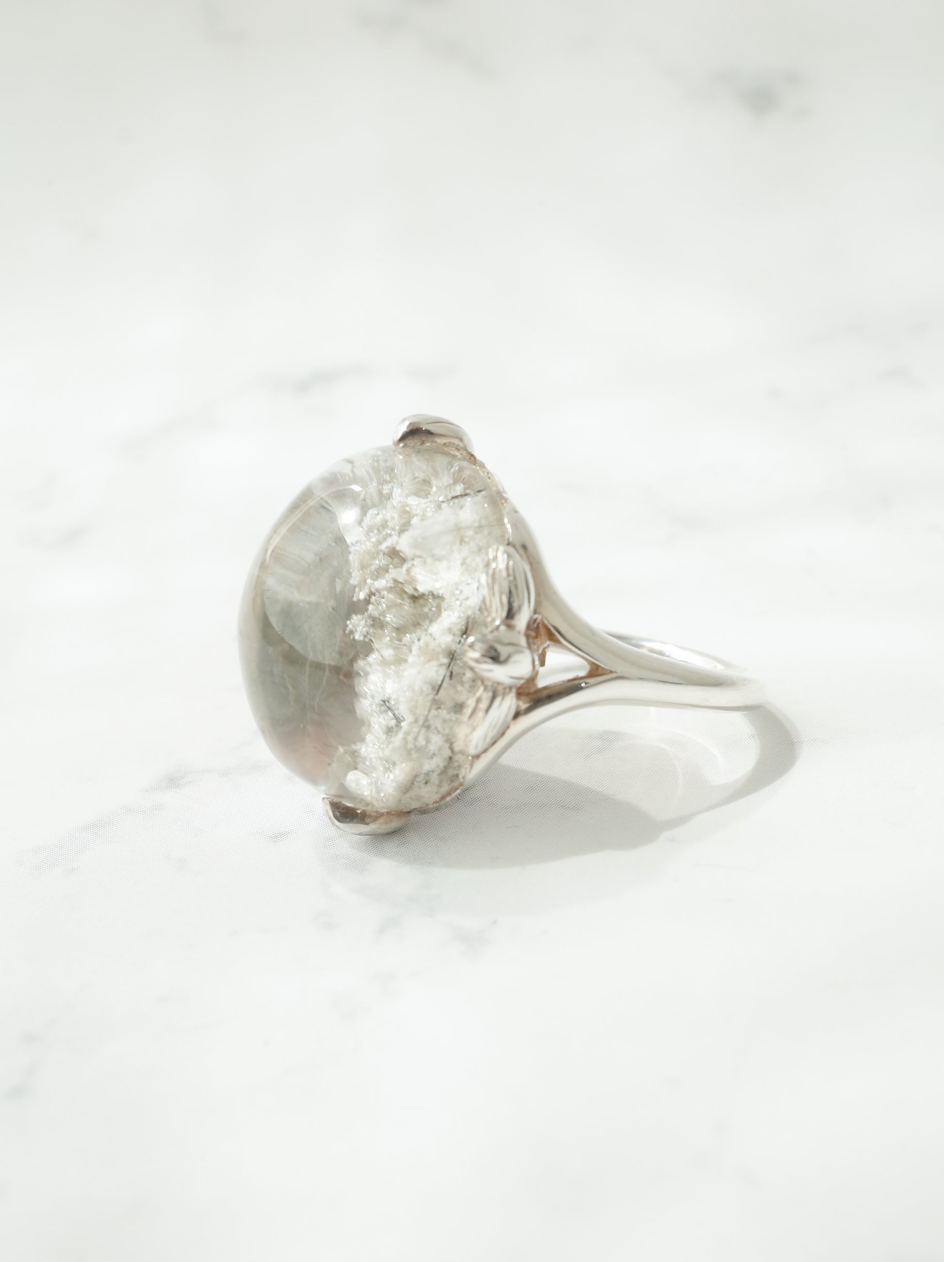 ナチュラルな雰囲気が魅力のガーデンクォーツを、蓮の花のデザインで包んだ「ロータスリング」。石を留める爪の部分が葉っぱの形になっていたり、石の景色をサイドからも楽しめるようになっています。シルバーの経年変化で葉の葉脈の模様がはっきりと出ると、より素敵な雰囲気の指輪になります。