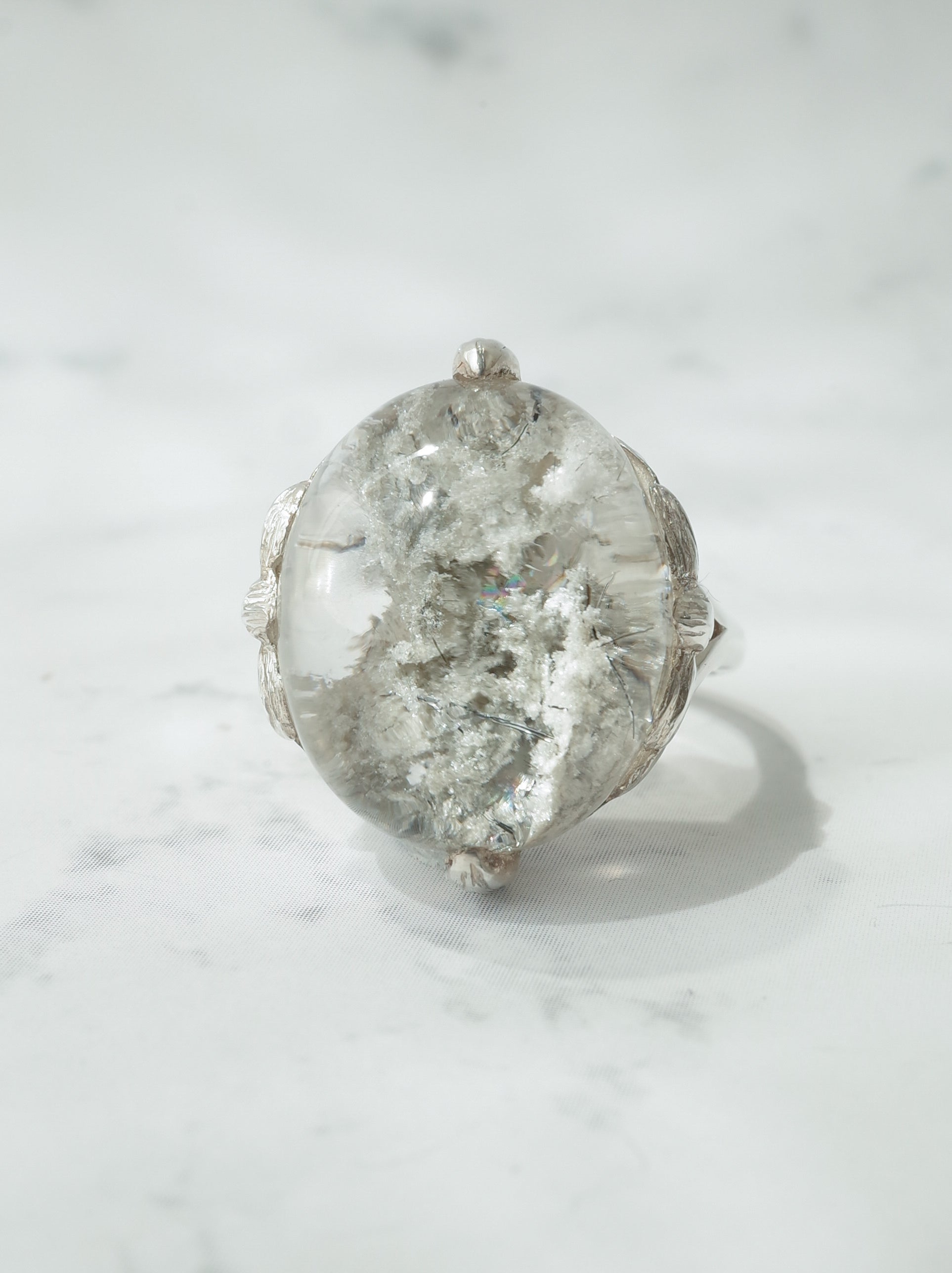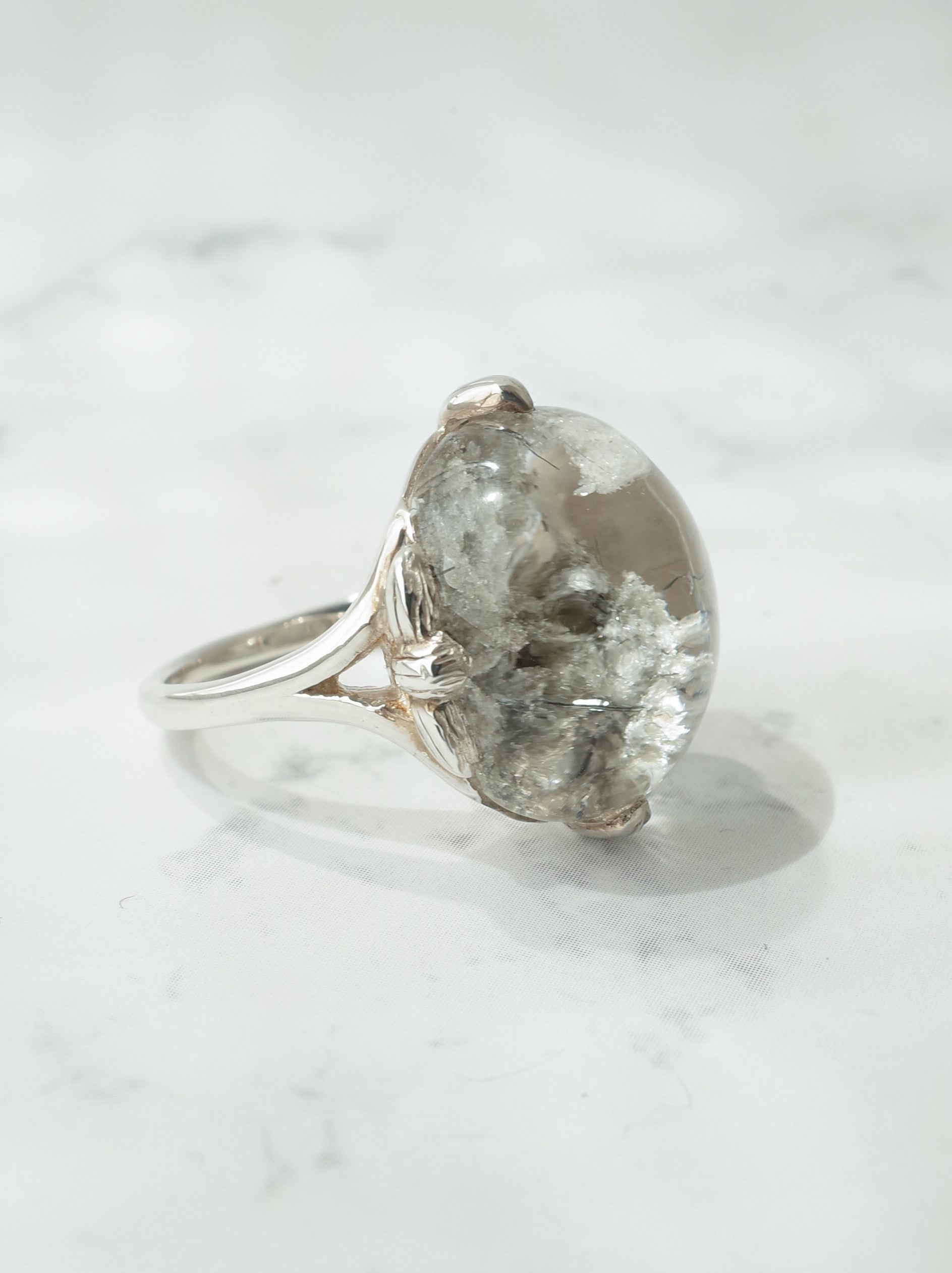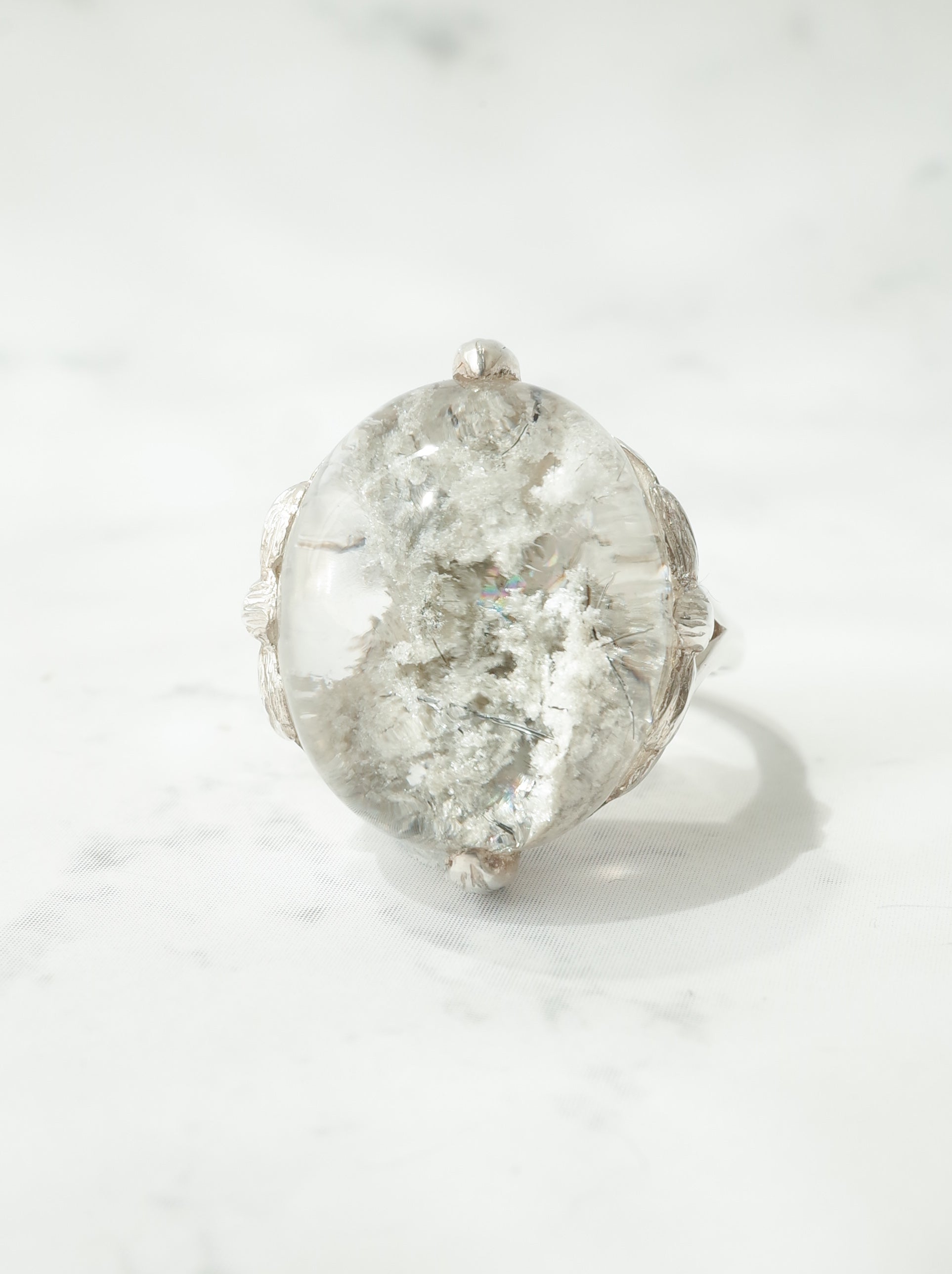 ナチュラルな雰囲気が魅力のガーデンクォーツを、蓮の花のデザインで包んだ「ロータスリング」。石を留める爪の部分が葉っぱの形になっていたり、石の景色をサイドからも楽しめるようになっています。シルバーの経年変化で葉の葉脈の模様がはっきりと出ると、より素敵な雰囲気の指輪になります。