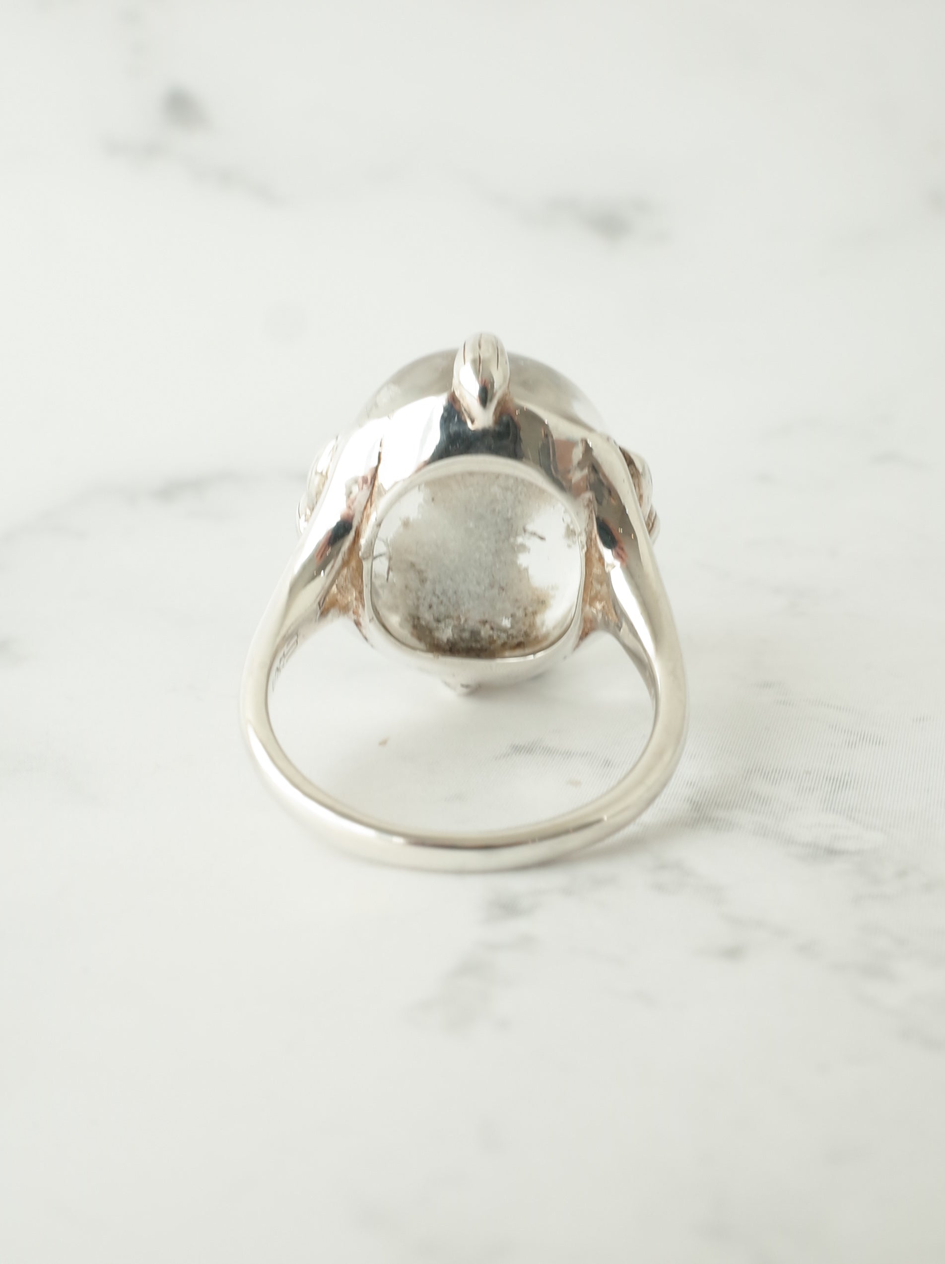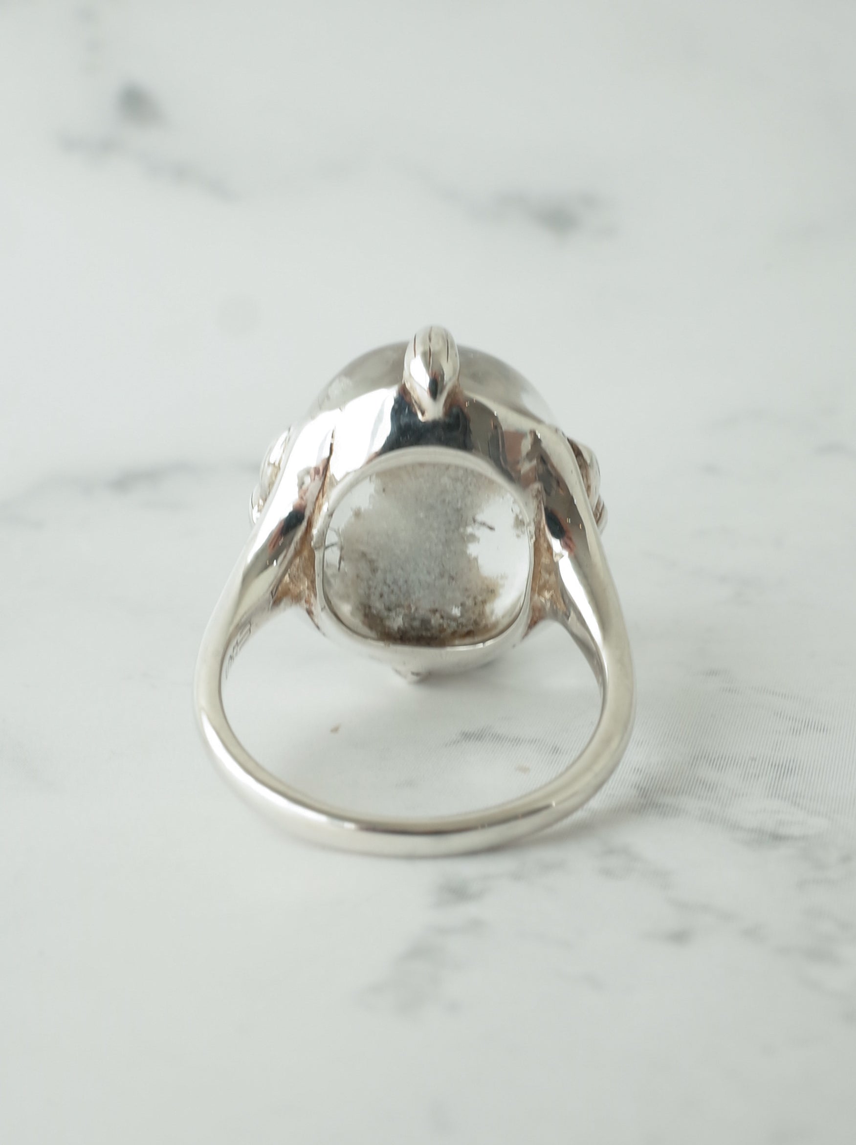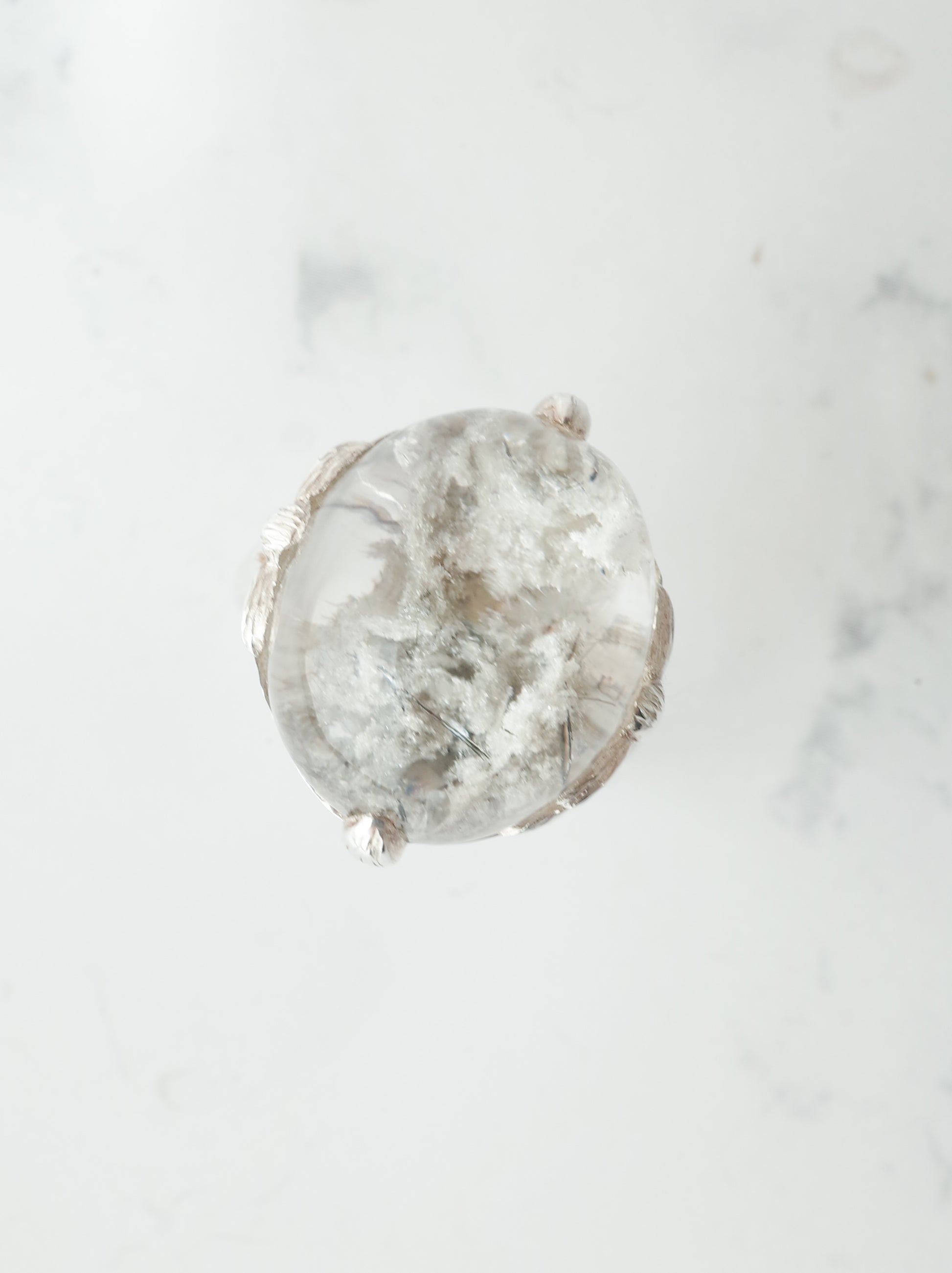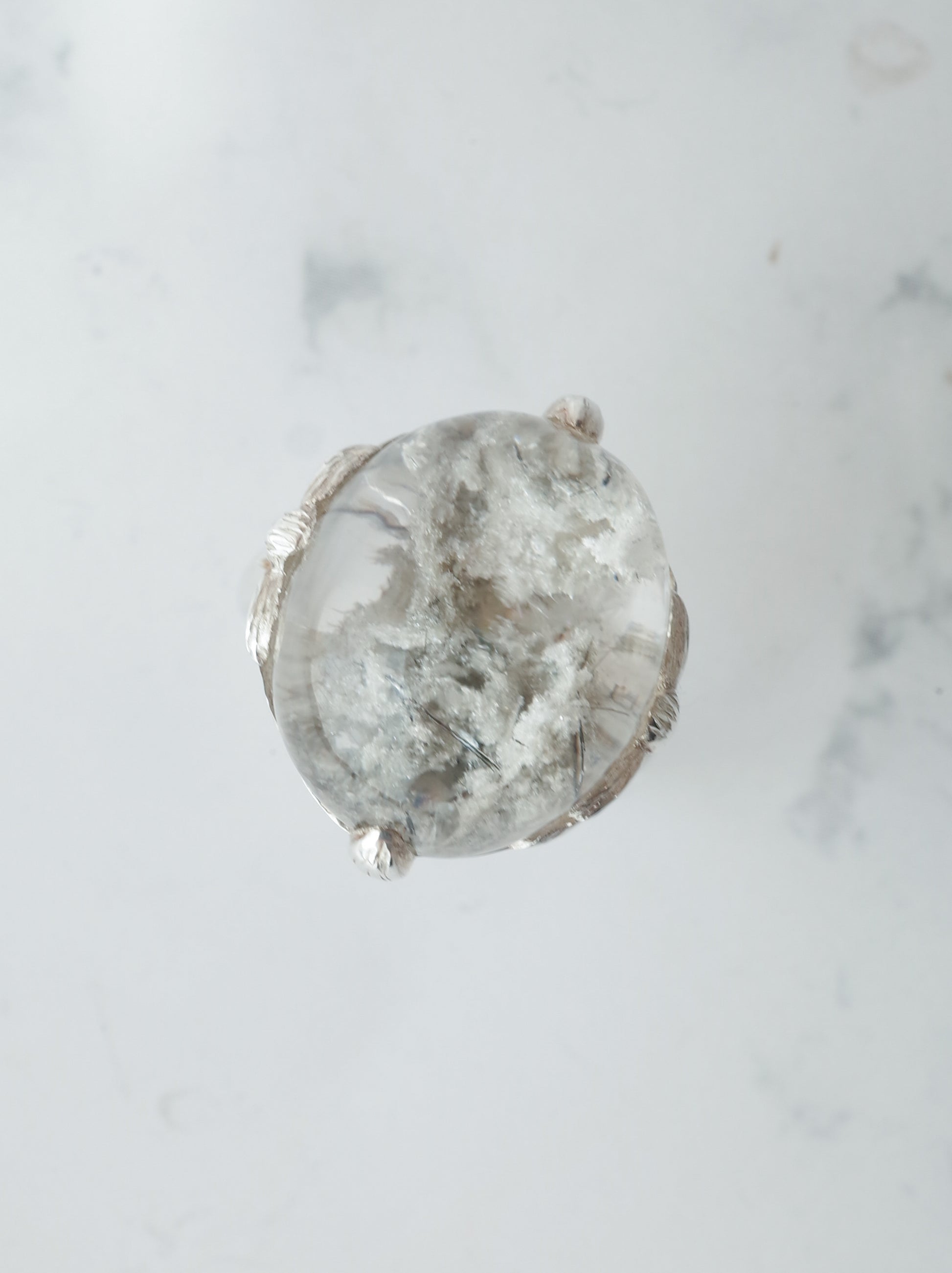 ナチュラルな雰囲気が魅力のガーデンクォーツを、蓮の花のデザインで包んだ「ロータスリング」。石を留める爪の部分が葉っぱの形になっていたり、石の景色をサイドからも楽しめるようになっています。シルバーの経年変化で葉の葉脈の模様がはっきりと出ると、より素敵な雰囲気の指輪になります。
