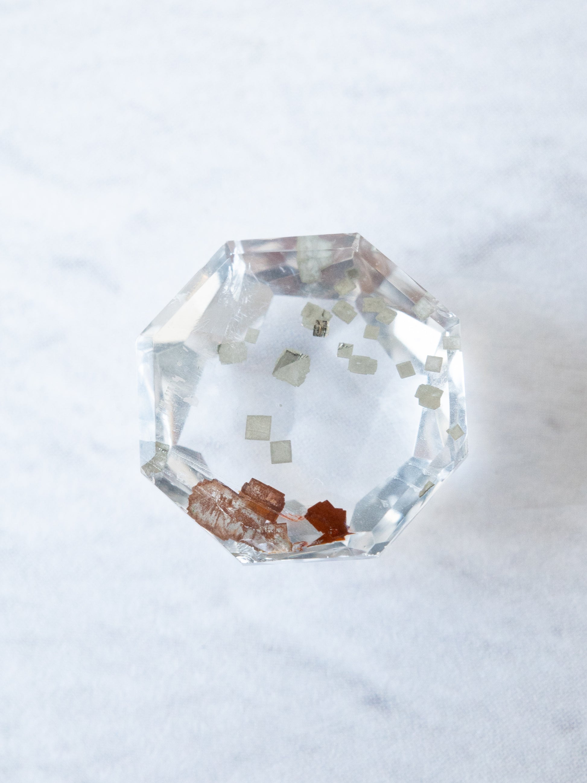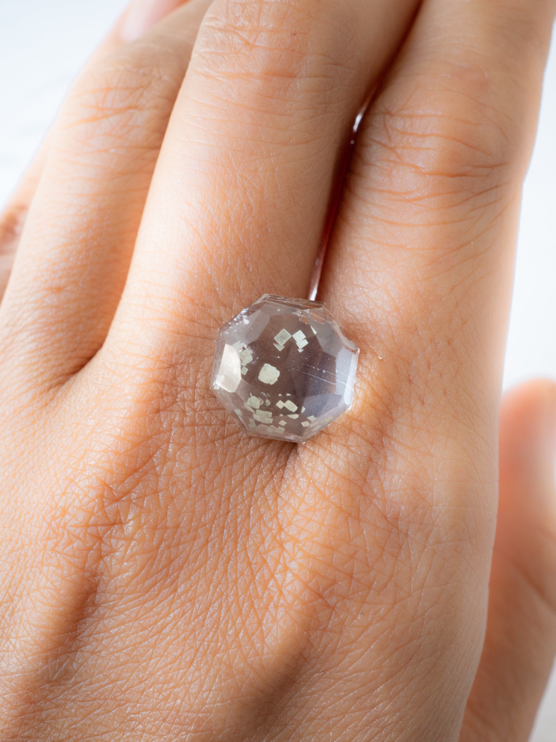 こちらは手磨り研磨師の大城かん奈さんがカットを担当してくださっている、通称『カンナカットシリーズ』。職人としての熟練した技術だけでなく、磨きながら石の個性と対話をし、一つ一つにフォーカスして魅力を引き出す素晴らしいセンスを持ち合わせた研磨師さんです。マニュアル化された研磨方法に囚われないダイナミックなカットは、唯一無二のモダンなフォルムがを生み出します。