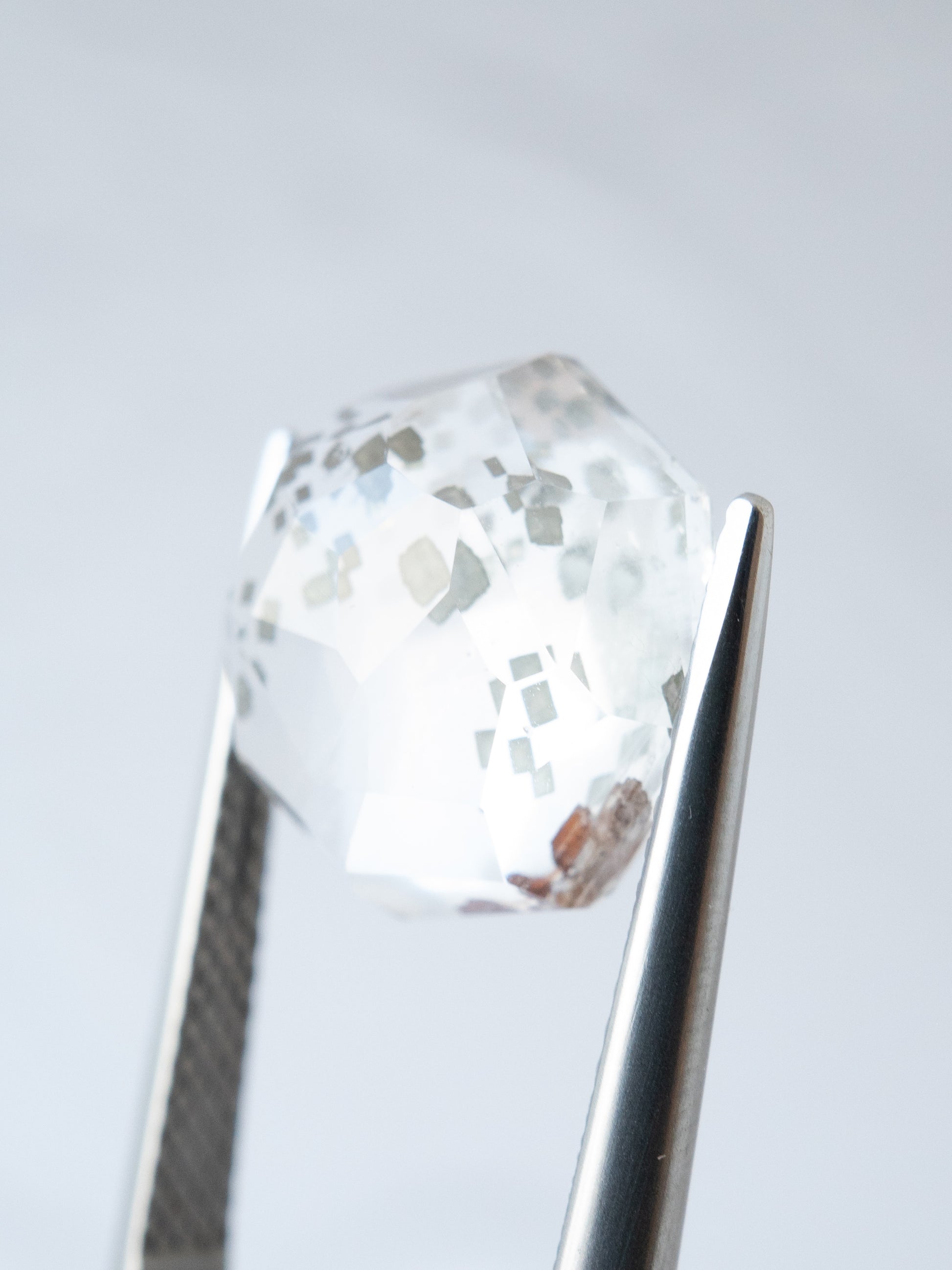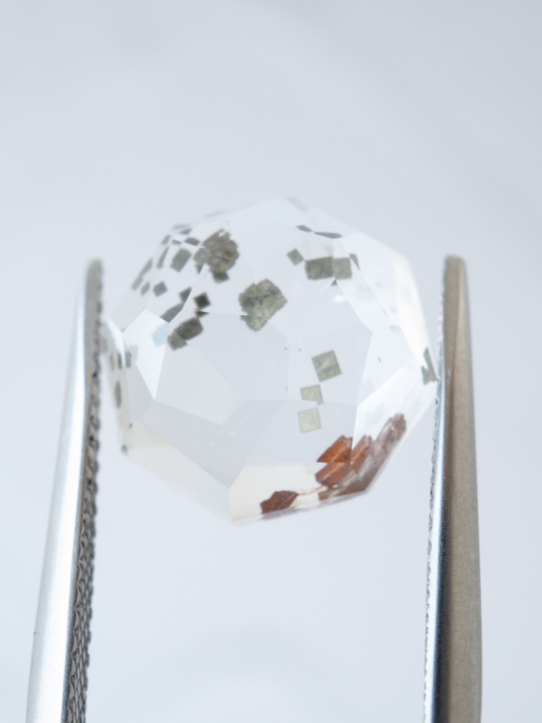 山梨県甲府市に伝統的に伝わる「手磨り」という技法は、高度な器具を使わずに手先の感覚のみで石を研磨していく昔ながらの研磨方法。計算された機械的なカットよりも臨機応変な対応ができるため、インクルージョンの魅力を最大限引き出せる手法でもあります。