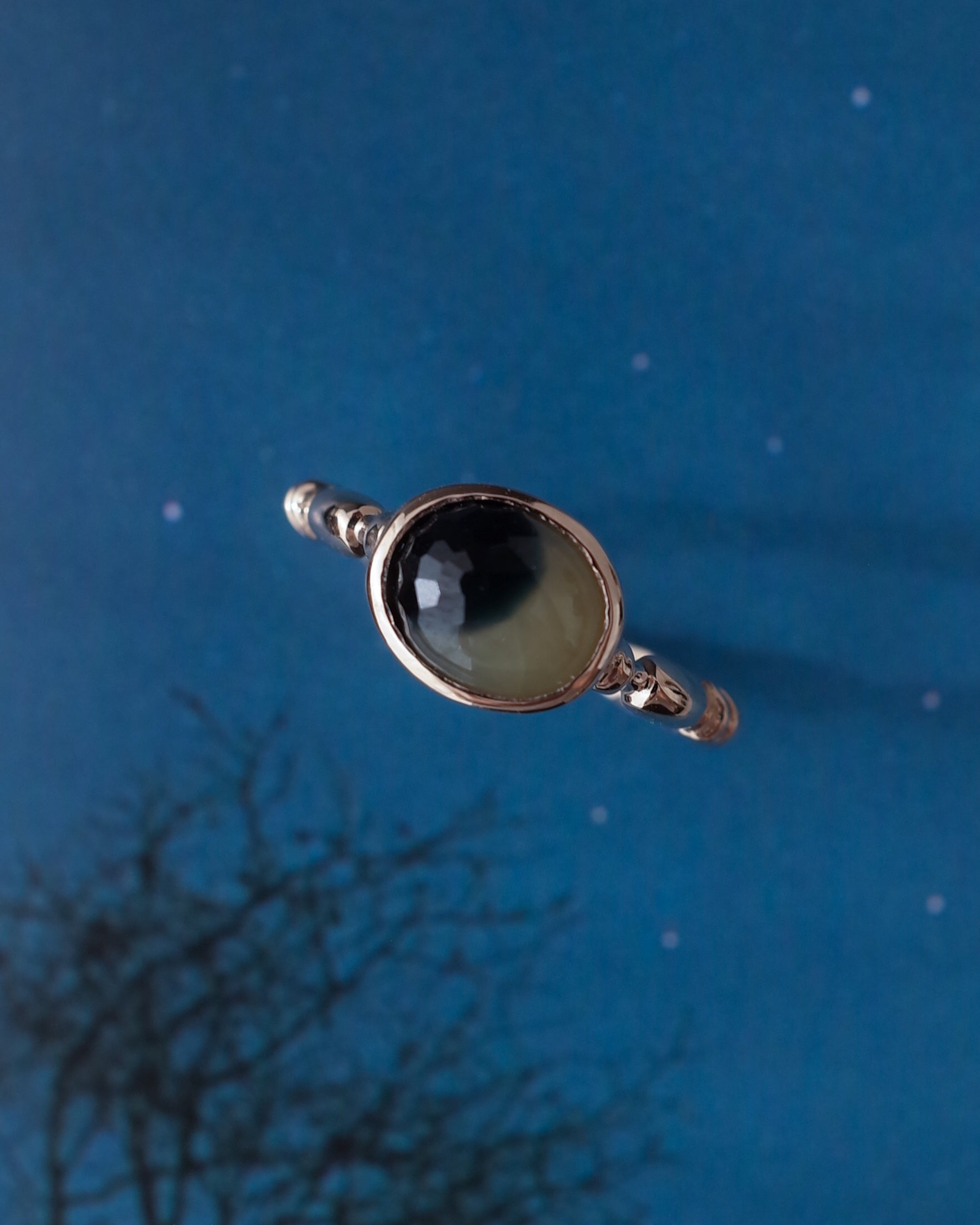 一つの小さな宝石に宿る壮大な空の景色。夜の深い静けさと優しく夜空を照らす月の神秘的な輝きが、指元であなたの日々を優しく照らしてくれますように。