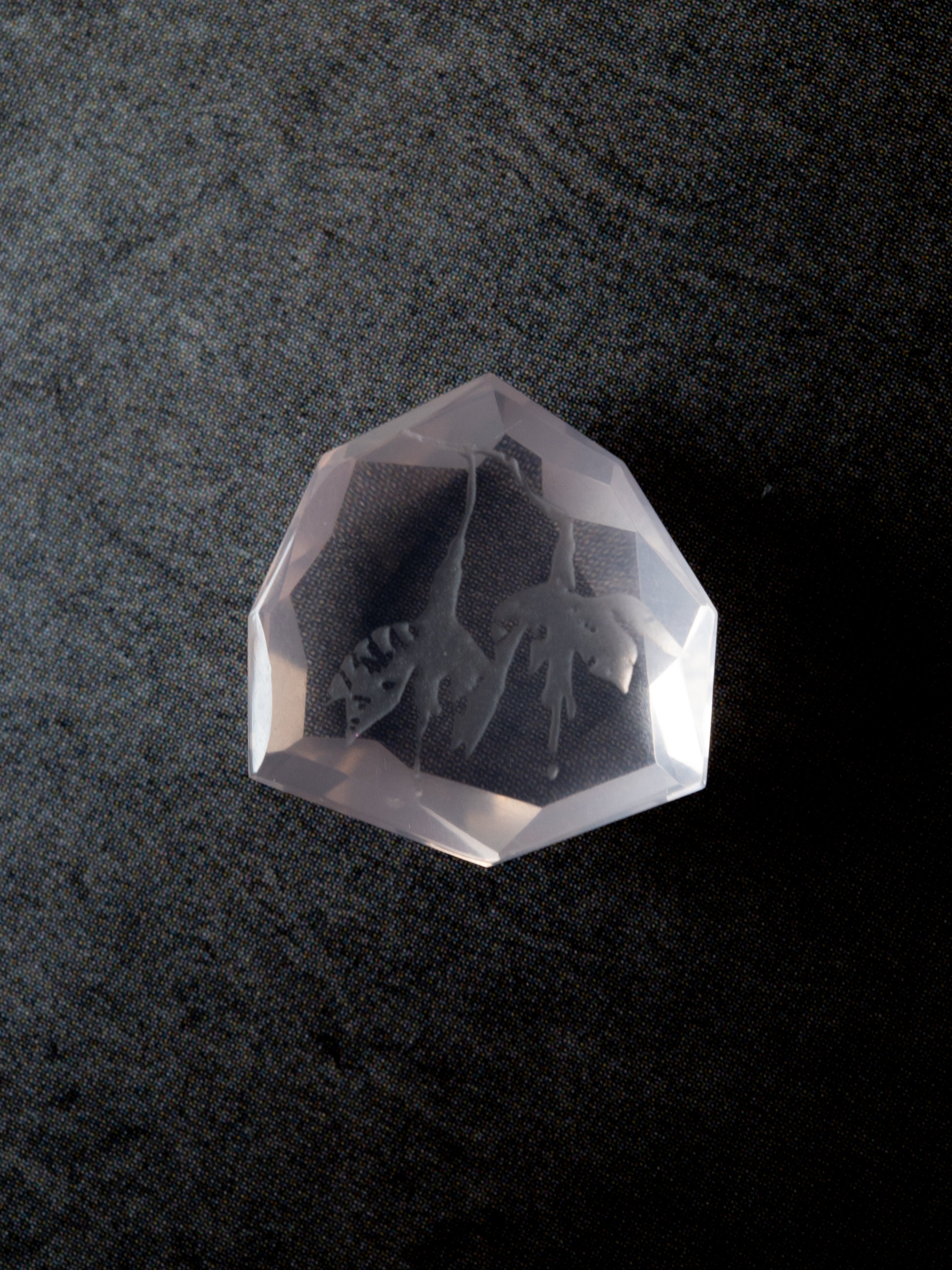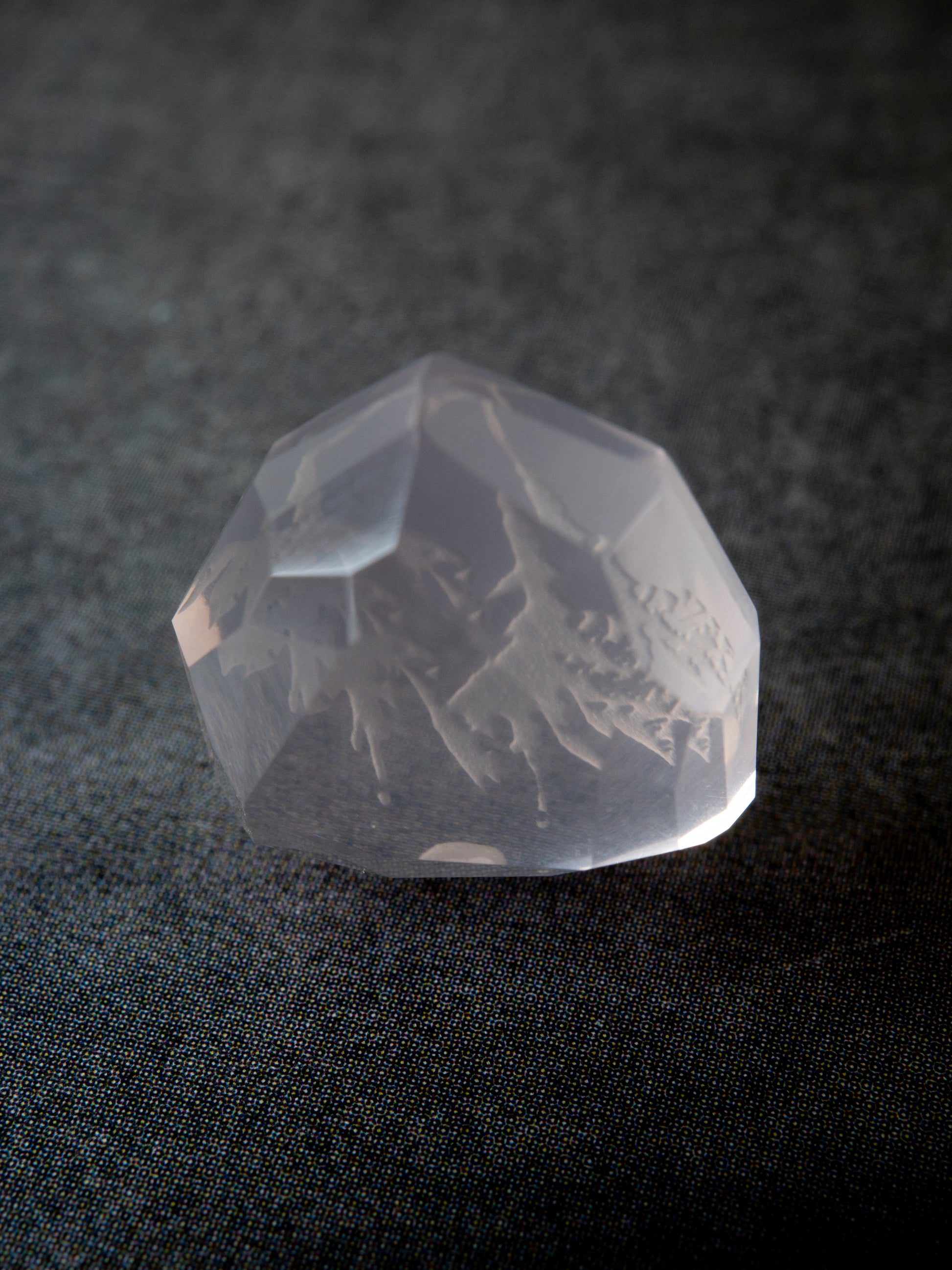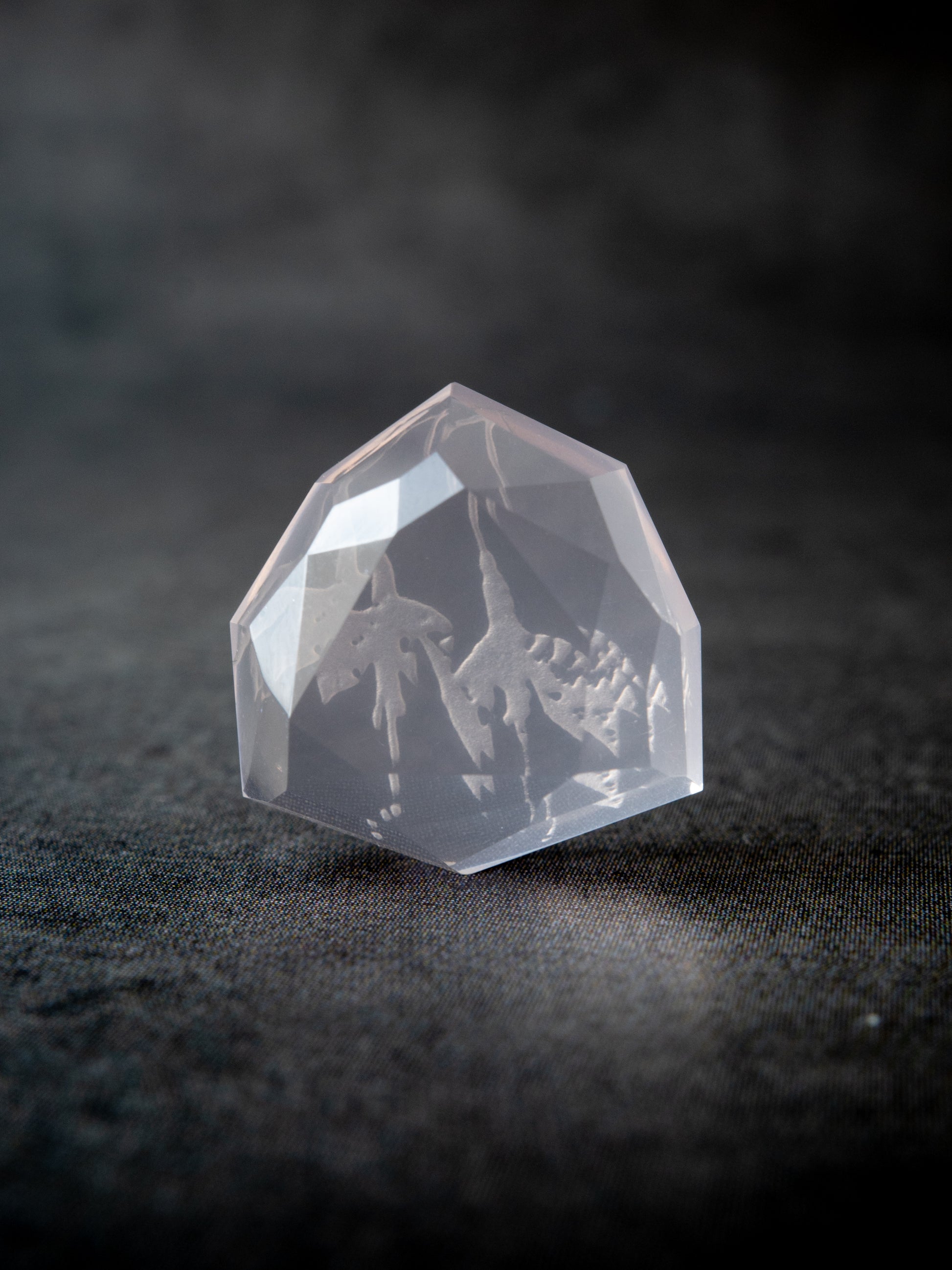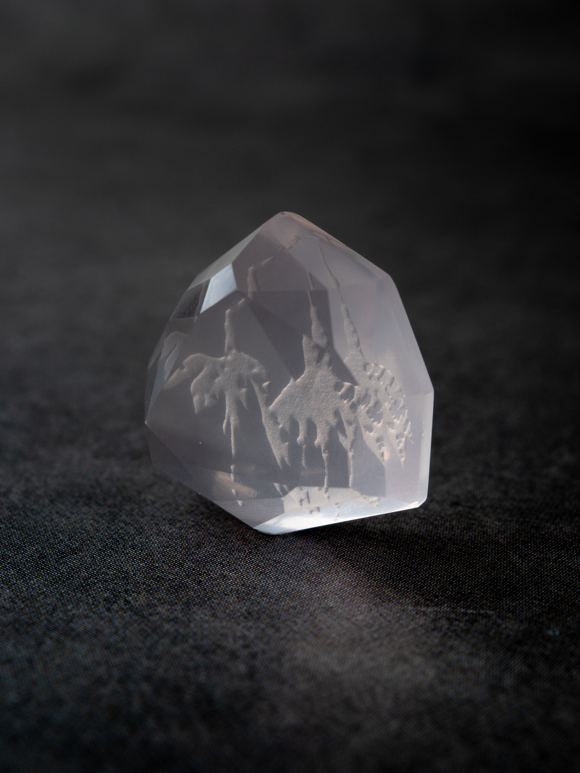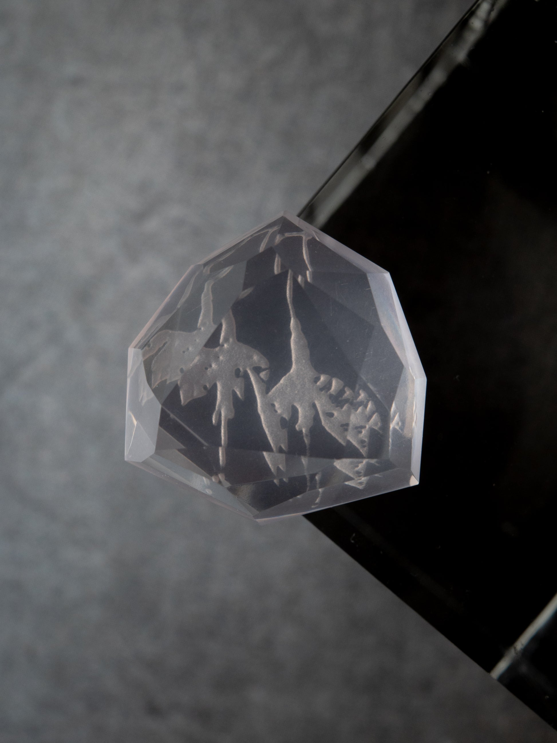 《 mirage 》とは「蜃気楼」という意味。裏面に施したカービングの模様が、カットの仕方次第で、あるいは見る角度によって如何様にも見え方が変わる。その "まやかし" によって本来の図案とは違う幻影が見える様子はまるで蜃気楼のようです。