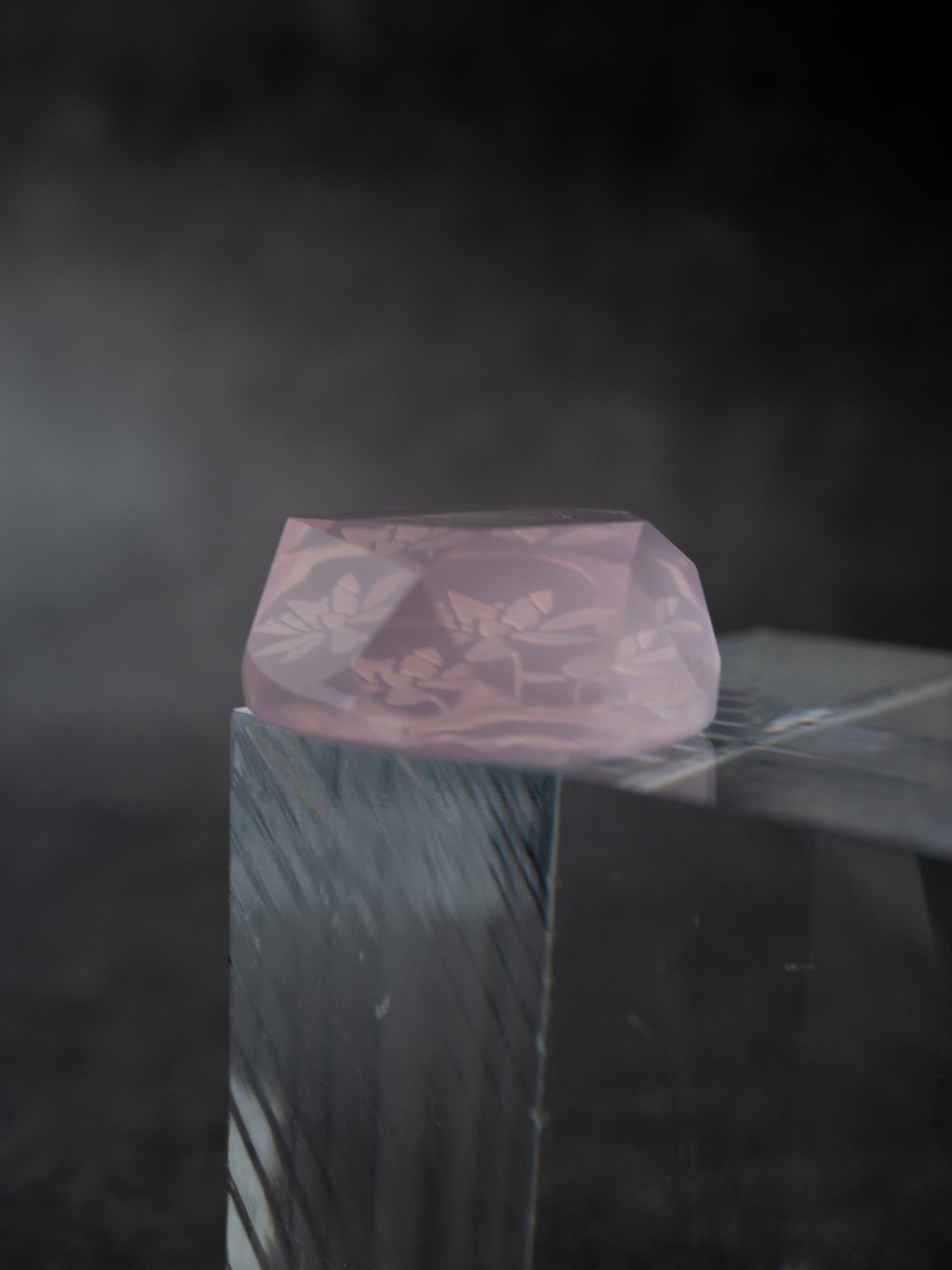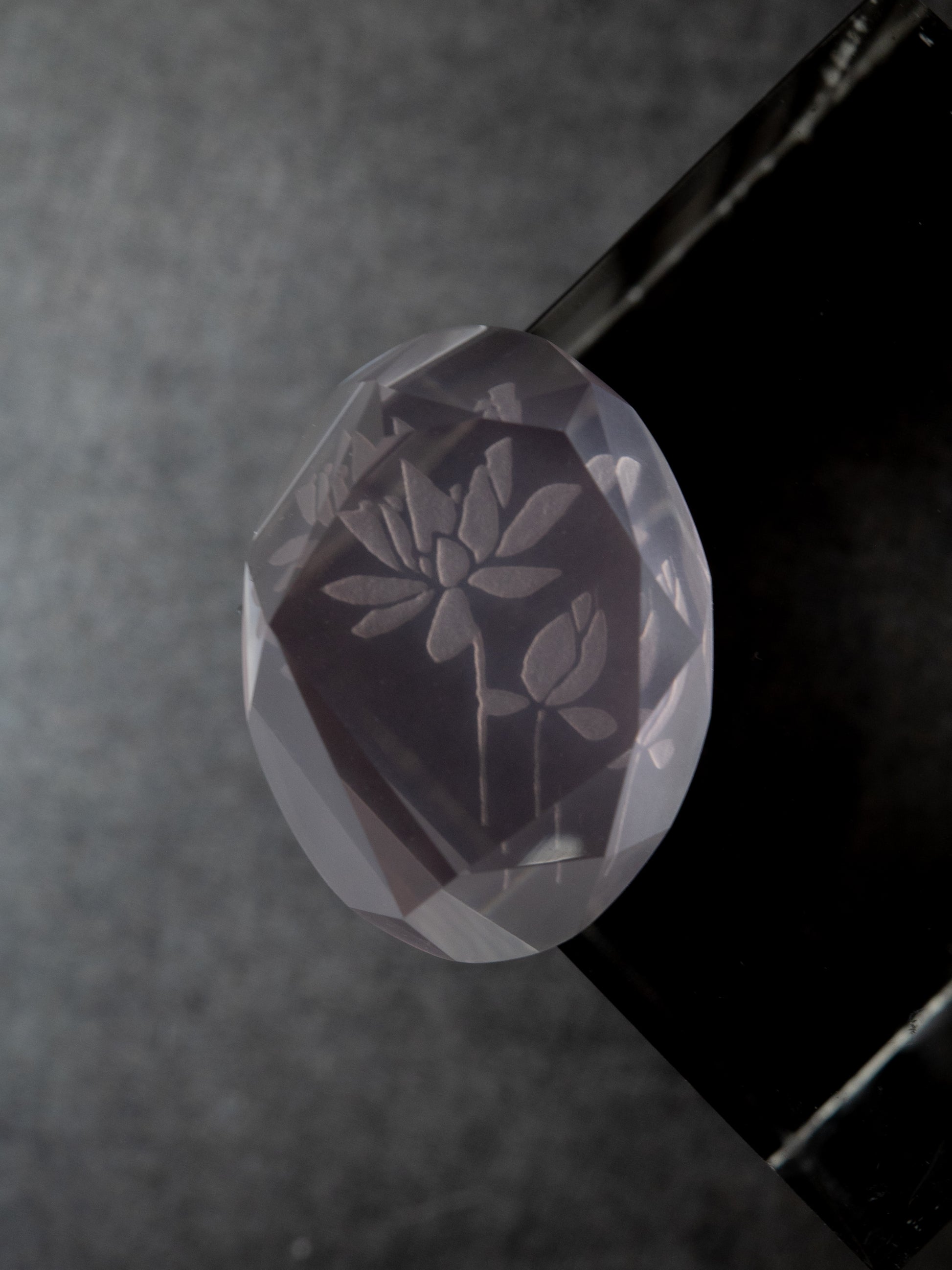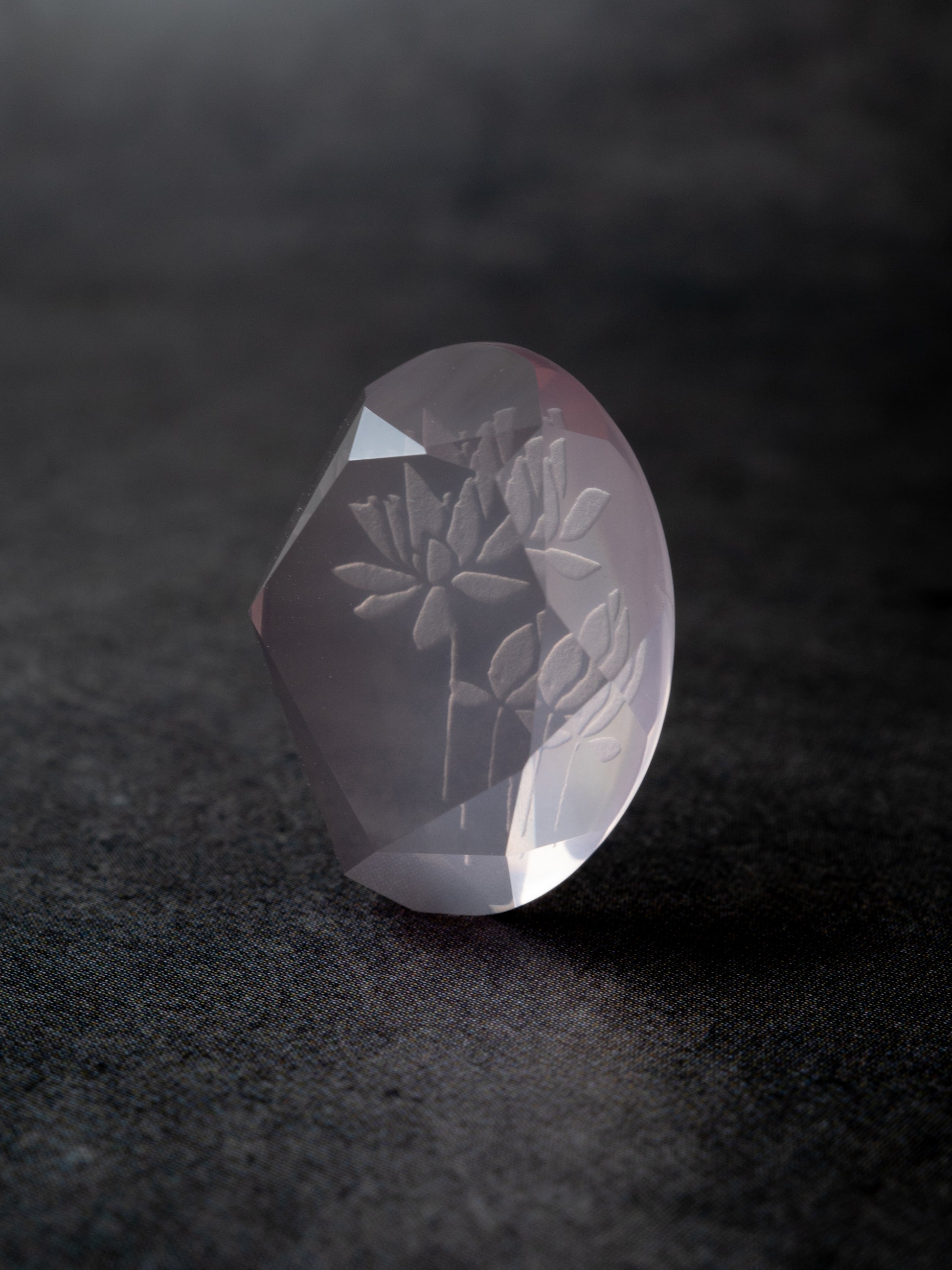 《 mirage 》とは「蜃気楼」という意味。裏面に施したカービングの模様が、カットの仕方次第で、あるいは見る角度によって如何様にも見え方が変わる。その "まやかし" によって本来の図案とは違う幻影が見える様子はまるで蜃気楼のようです。