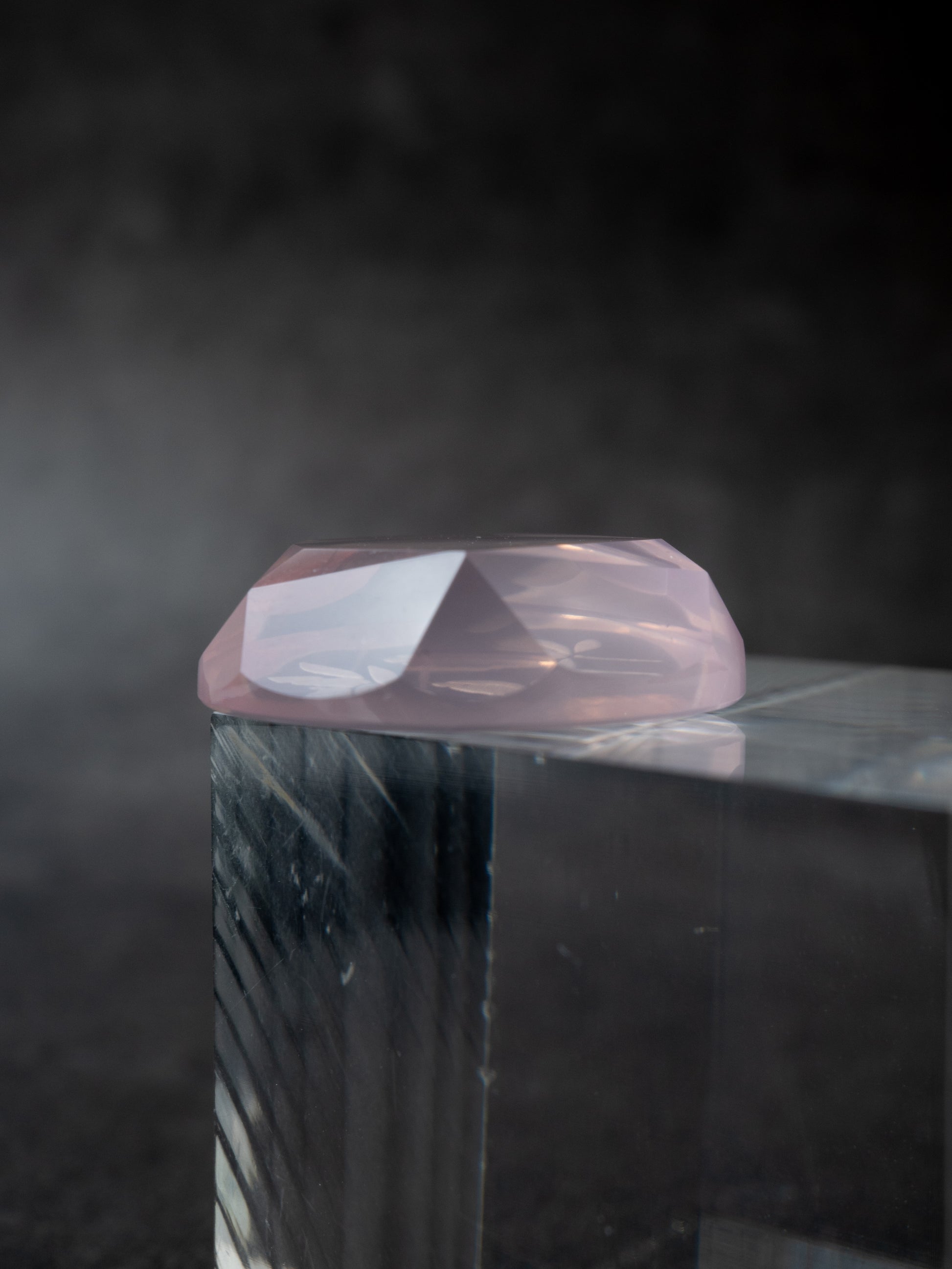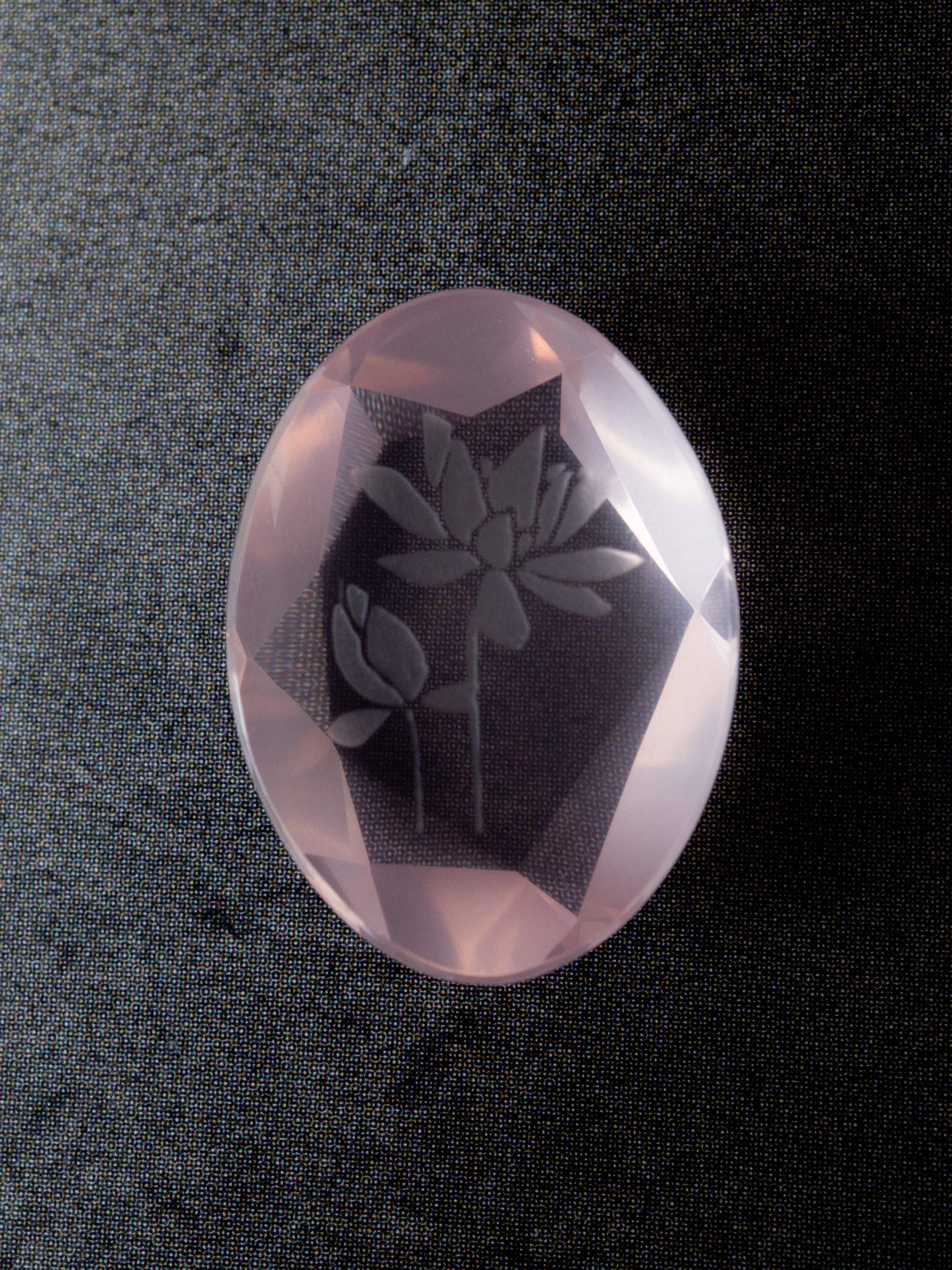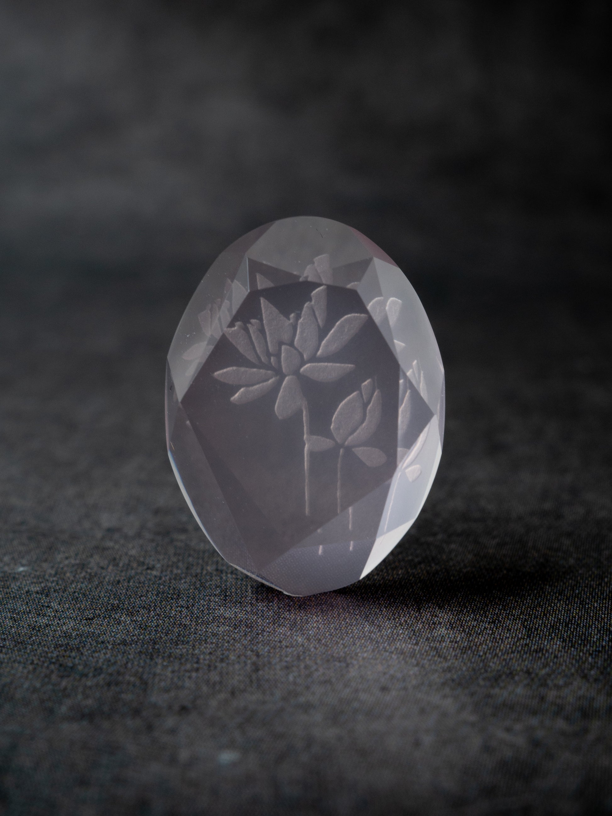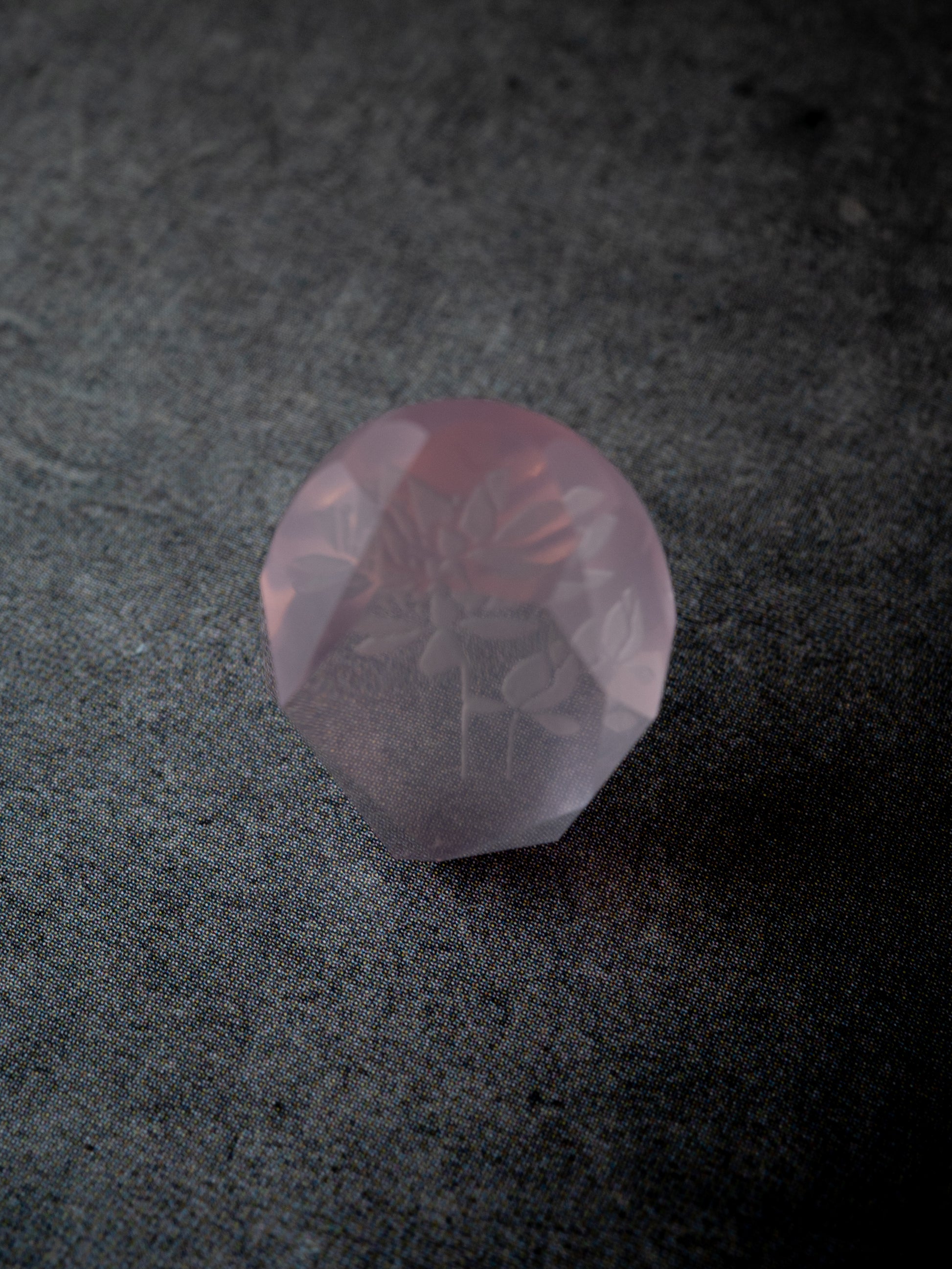《 mirage 》とは「蜃気楼」という意味。裏面に施したカービングの模様が、カットの仕方次第で、あるいは見る角度によって如何様にも見え方が変わる。その "まやかし" によって本来の図案とは違う幻影が見える様子はまるで蜃気楼のようです。