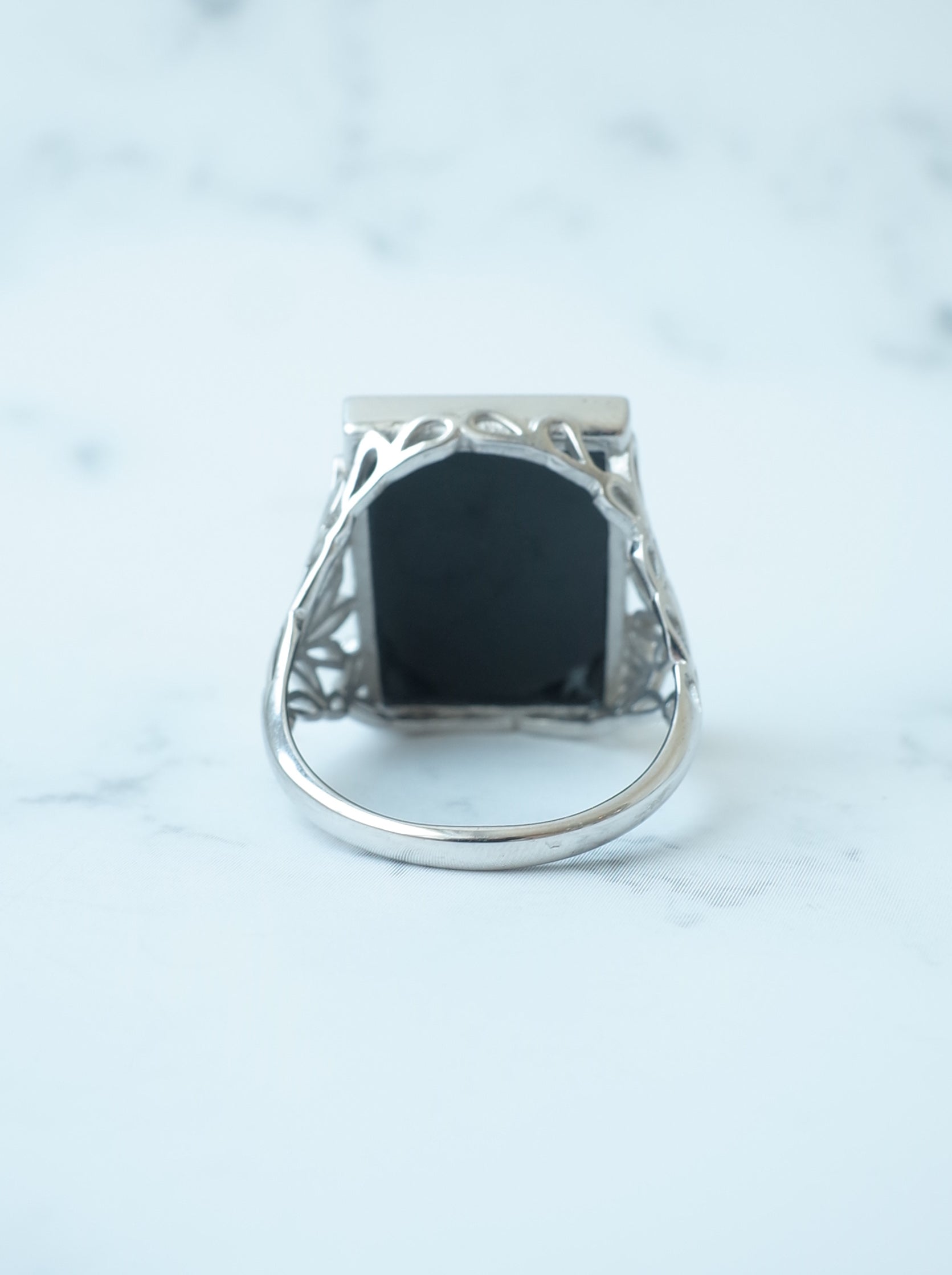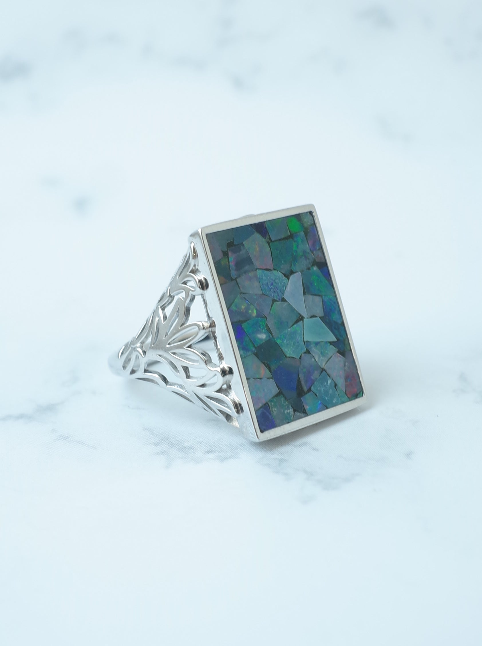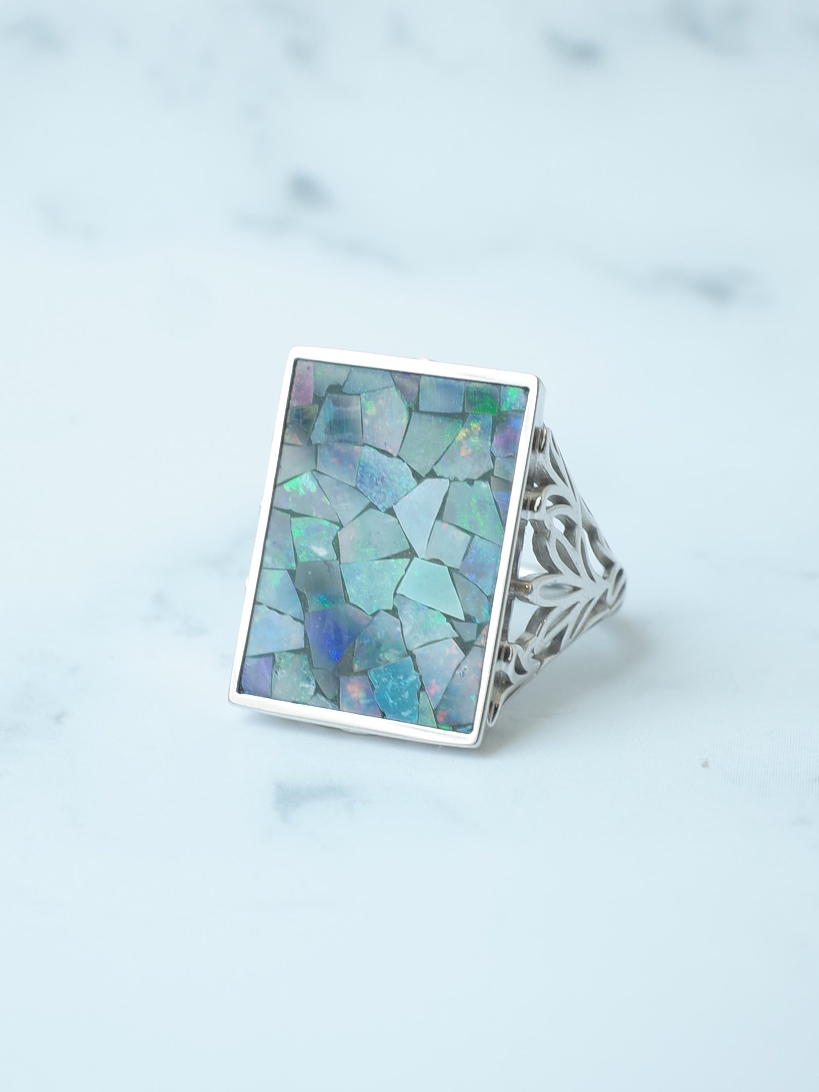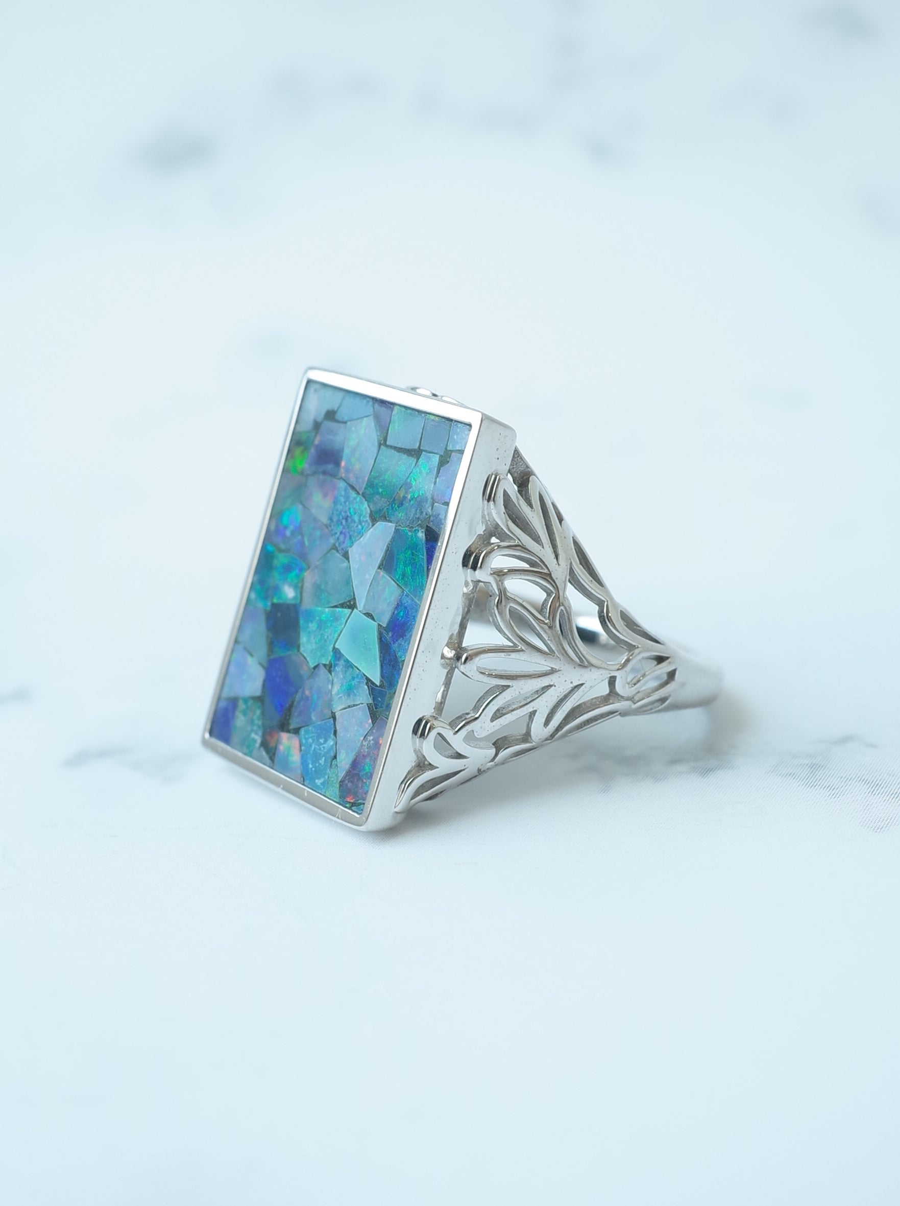 アガパンサスの花を透かし模様にして中石を支えるように広げた『 AGAPANTHUS』。使用している石は、まるで教会のステンドグラスを思わせるようなモザイクオパールです。指輪を動かす度にオパールの遊色効果が煌めく様子がとても魅力的な一点です。