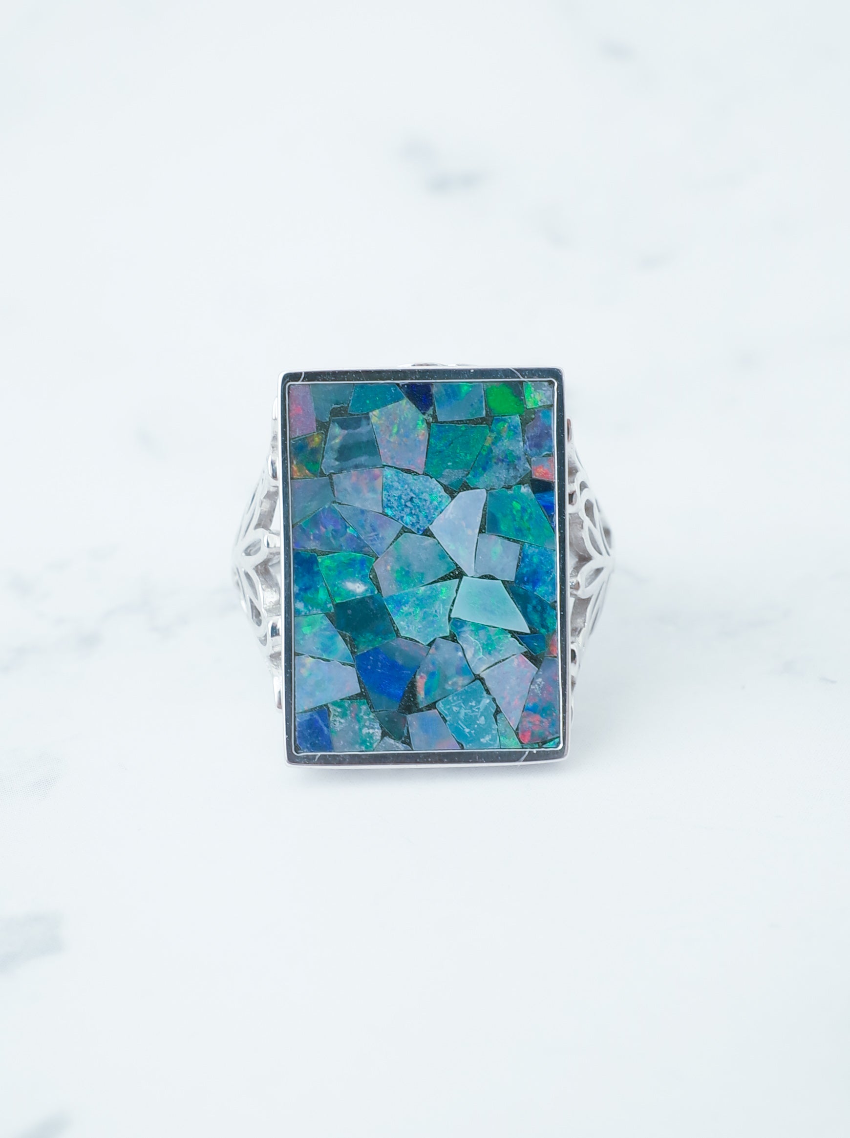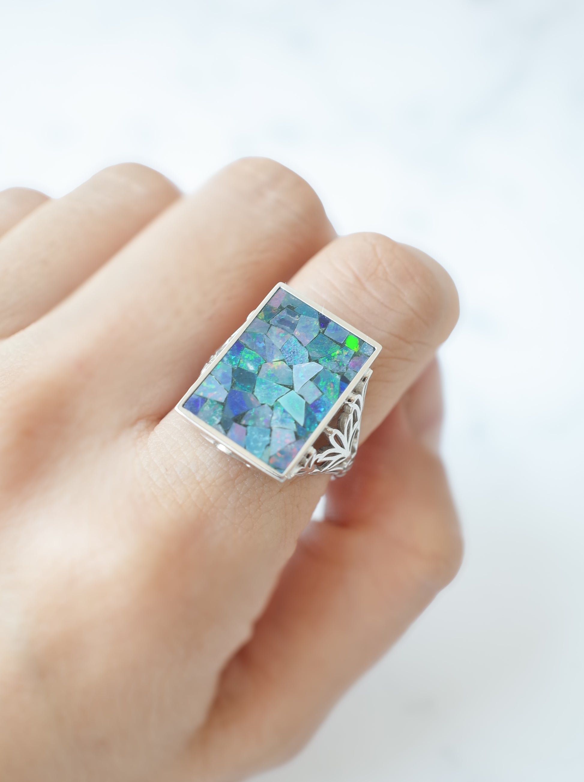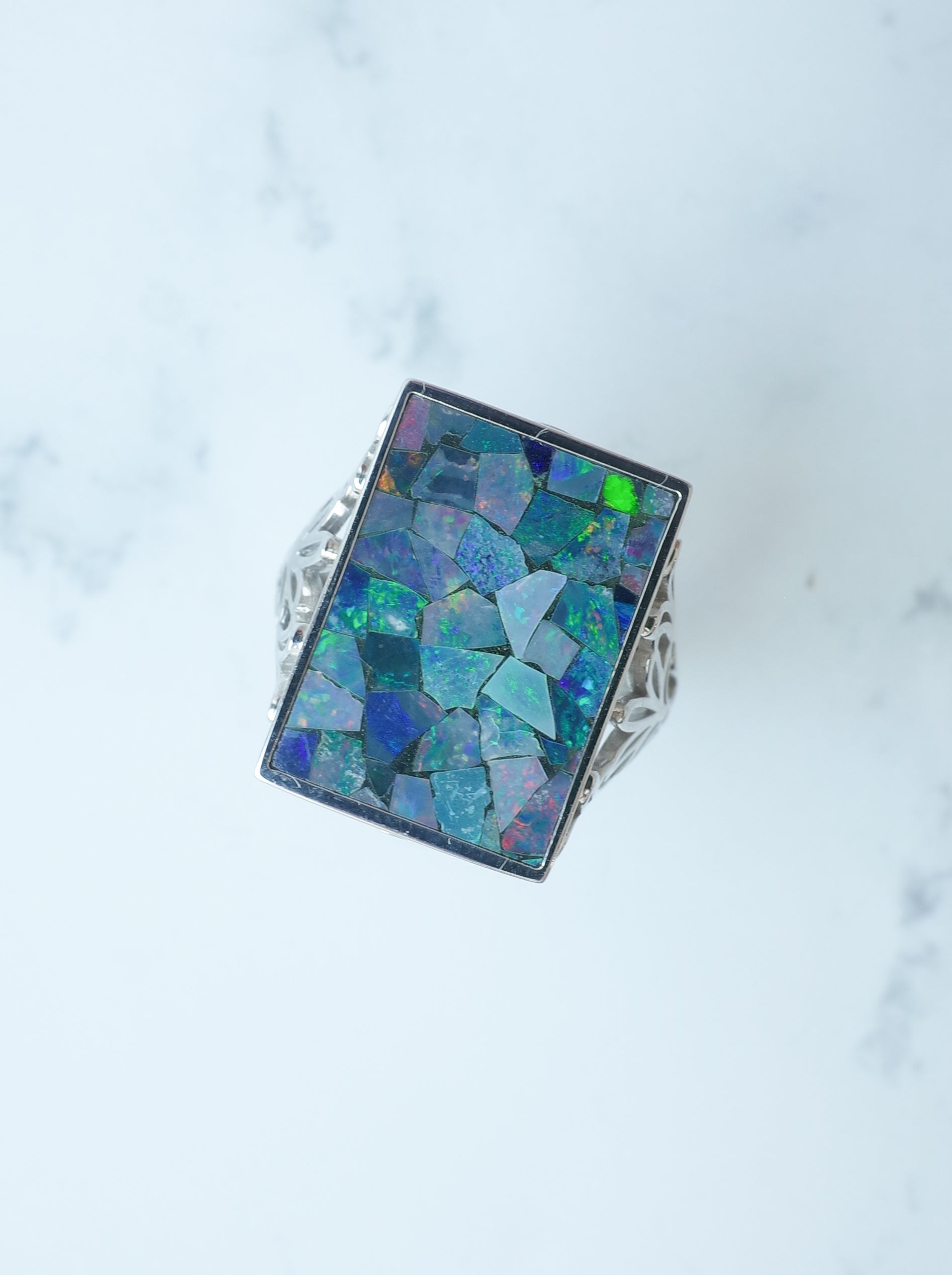 ※ モザイクオパールは黒色のブラックカルセドニーをベースに、天然のオパールをモザイク状に貼り合わせたダブレットストーンです。それぞれに個体差ございますので、最後の写真を参考にご覧くださいませ。イメージはほぼ変わりませんが、お選びいただくことは出来ませんのであらかじめご了承ください。