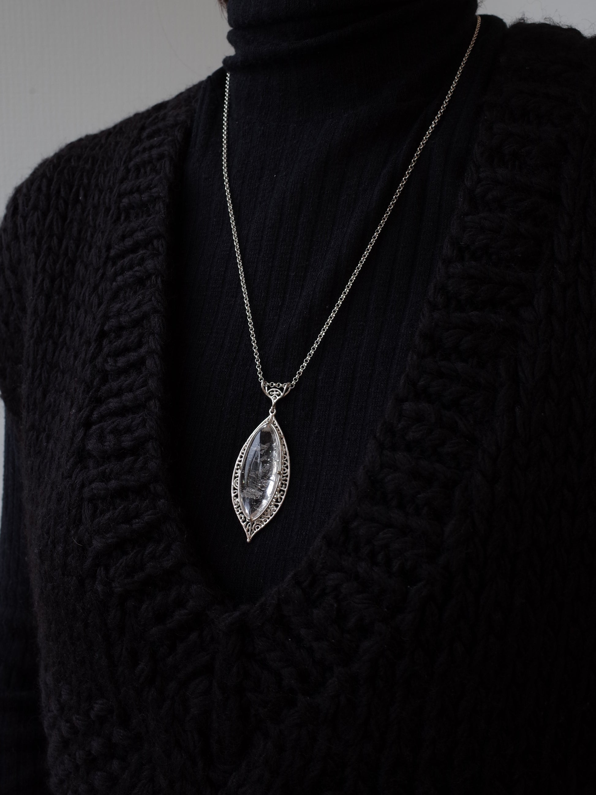 まるで優しい雨が降っているような美しさが魅力のネガティブクリスタルインクォーツ。心が研ぎ澄まされるような高い透明度で、ずっと眺めていたくなるような、鉱物としての魅力が満載のペンダントです。「ネガティブクリスタルインクォーツ」とは、和名を「負晶水晶」「虚晶水晶」と言い、内部に「小さな空間」や「空洞」が存在している水晶をさします。