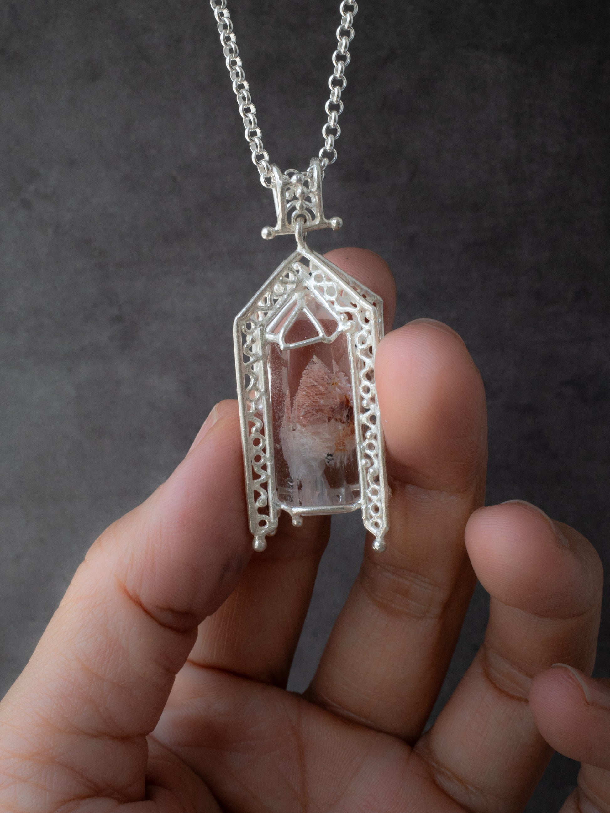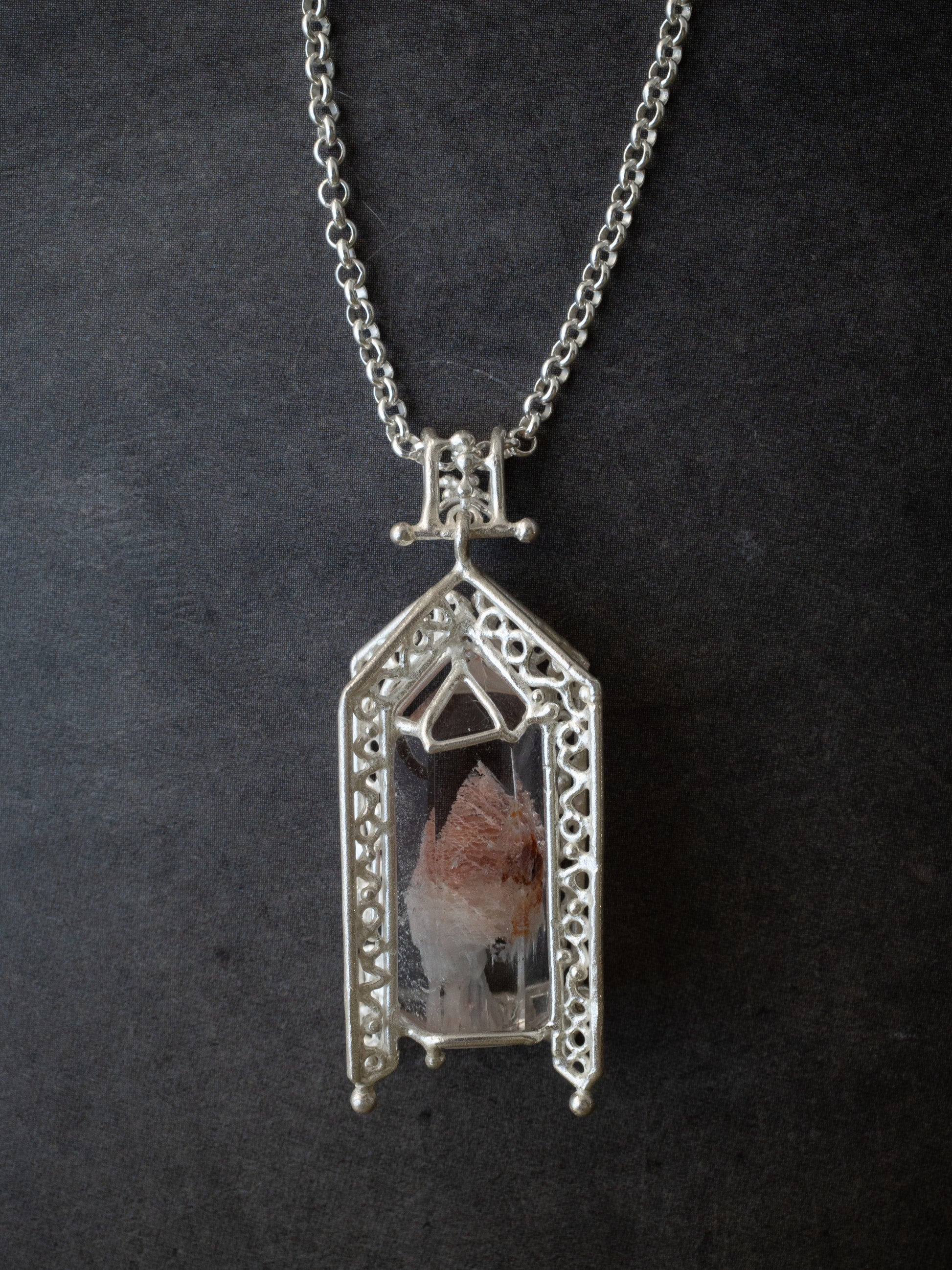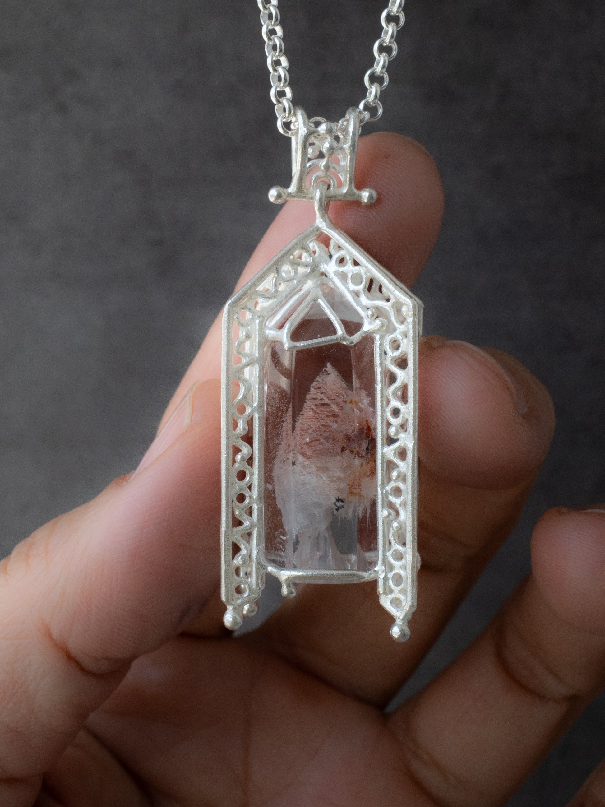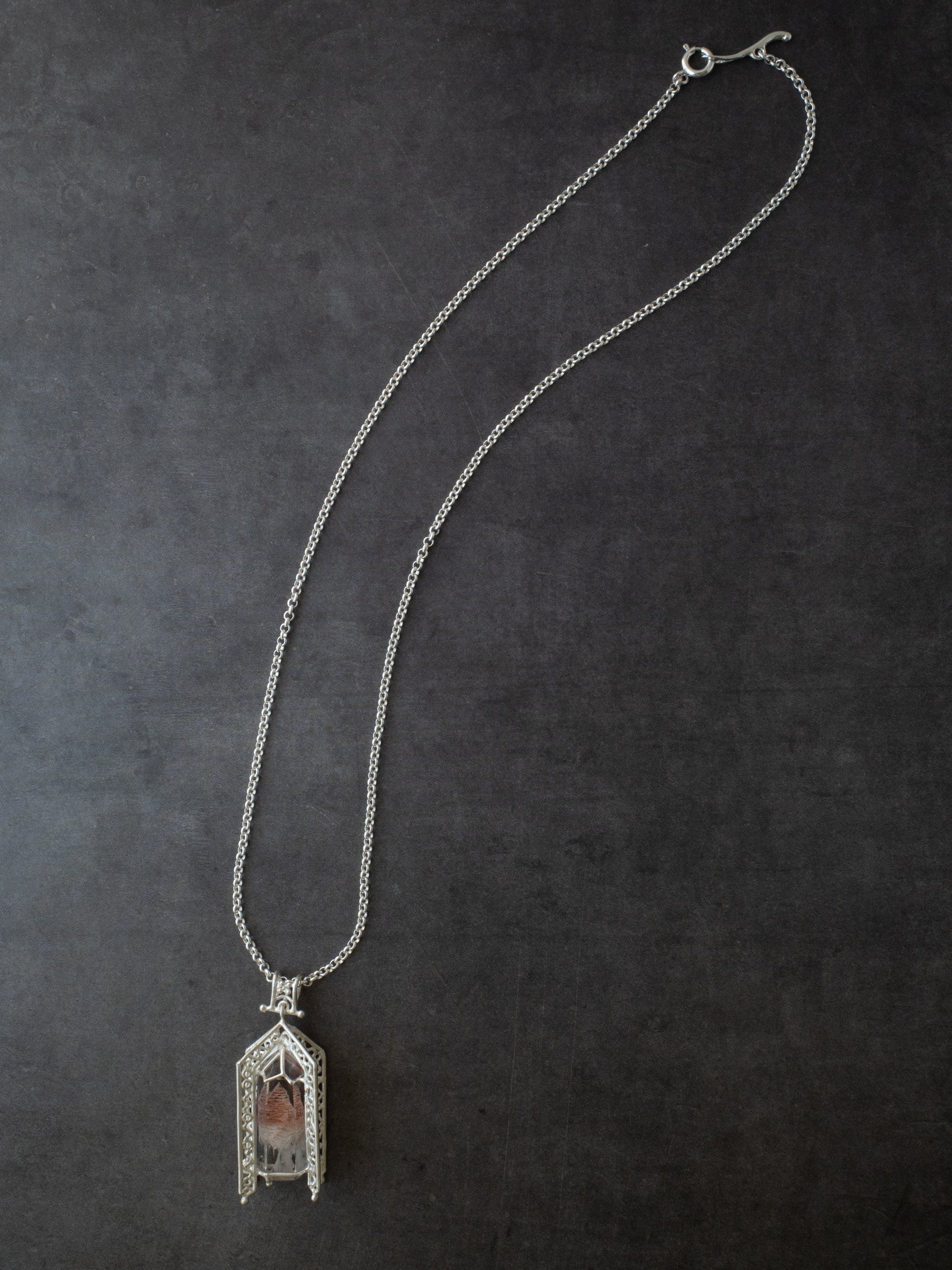 水晶の内部に、山のような層が浮かび上がるファントムクォーツをのシルバーペンダント。まるで神殿のような形に仕立てられたデザインは、お守りのような雰囲気があります。