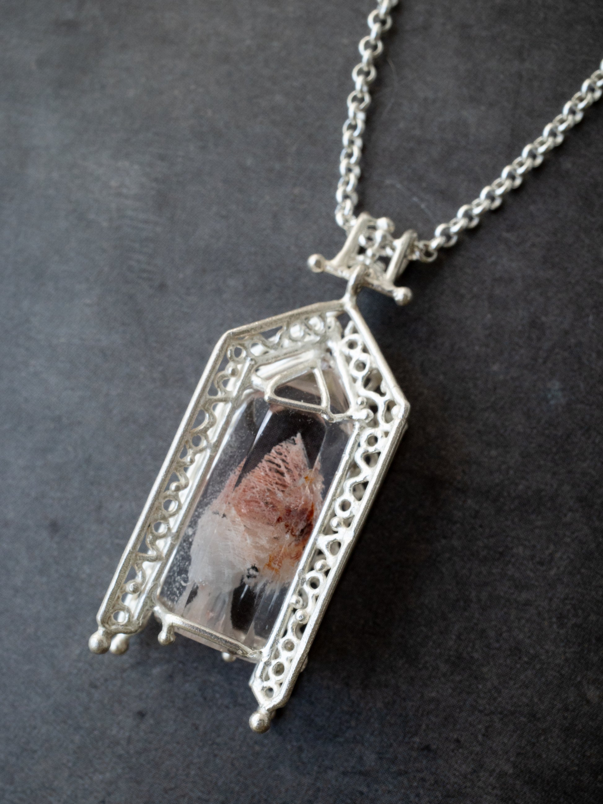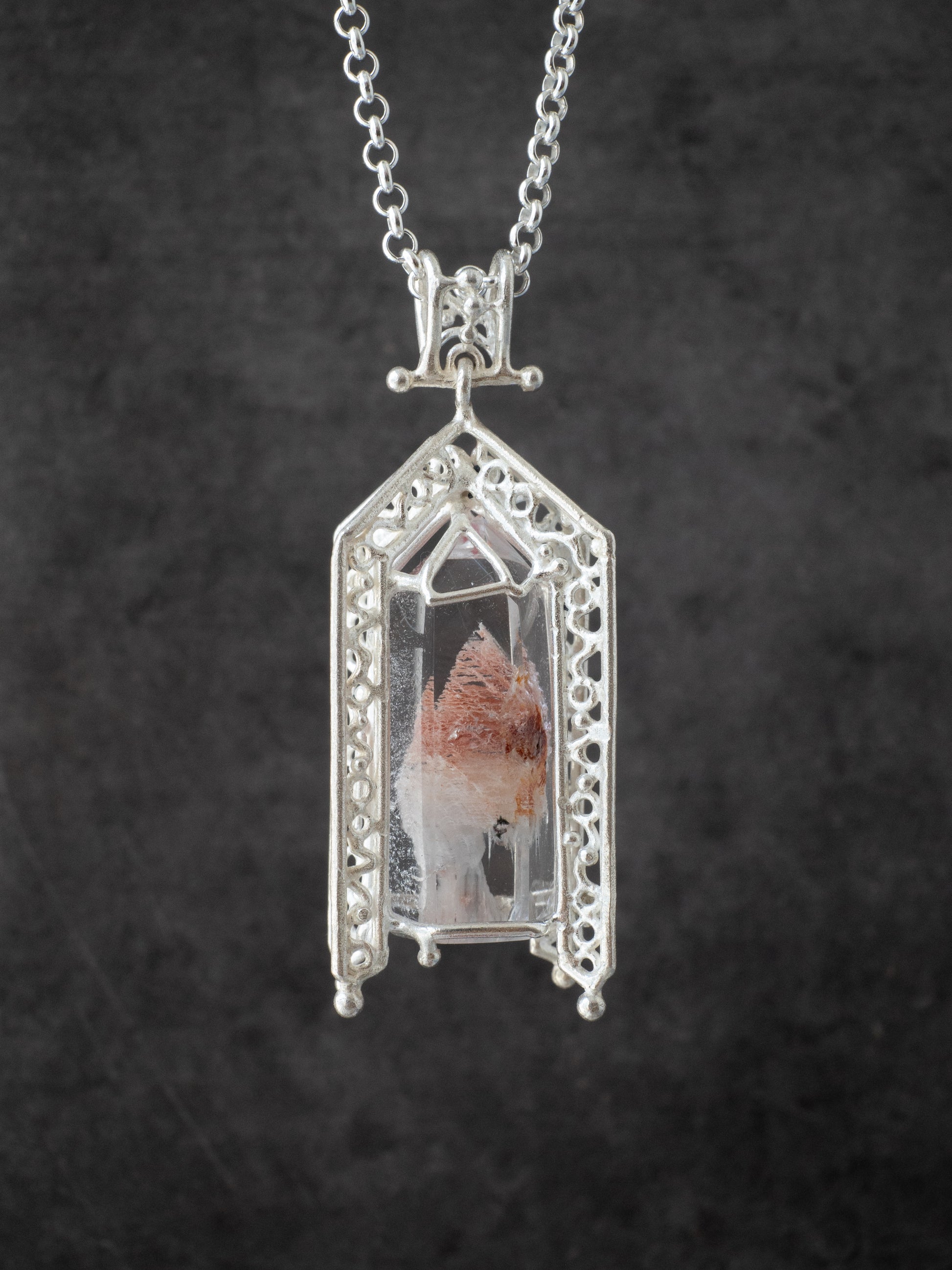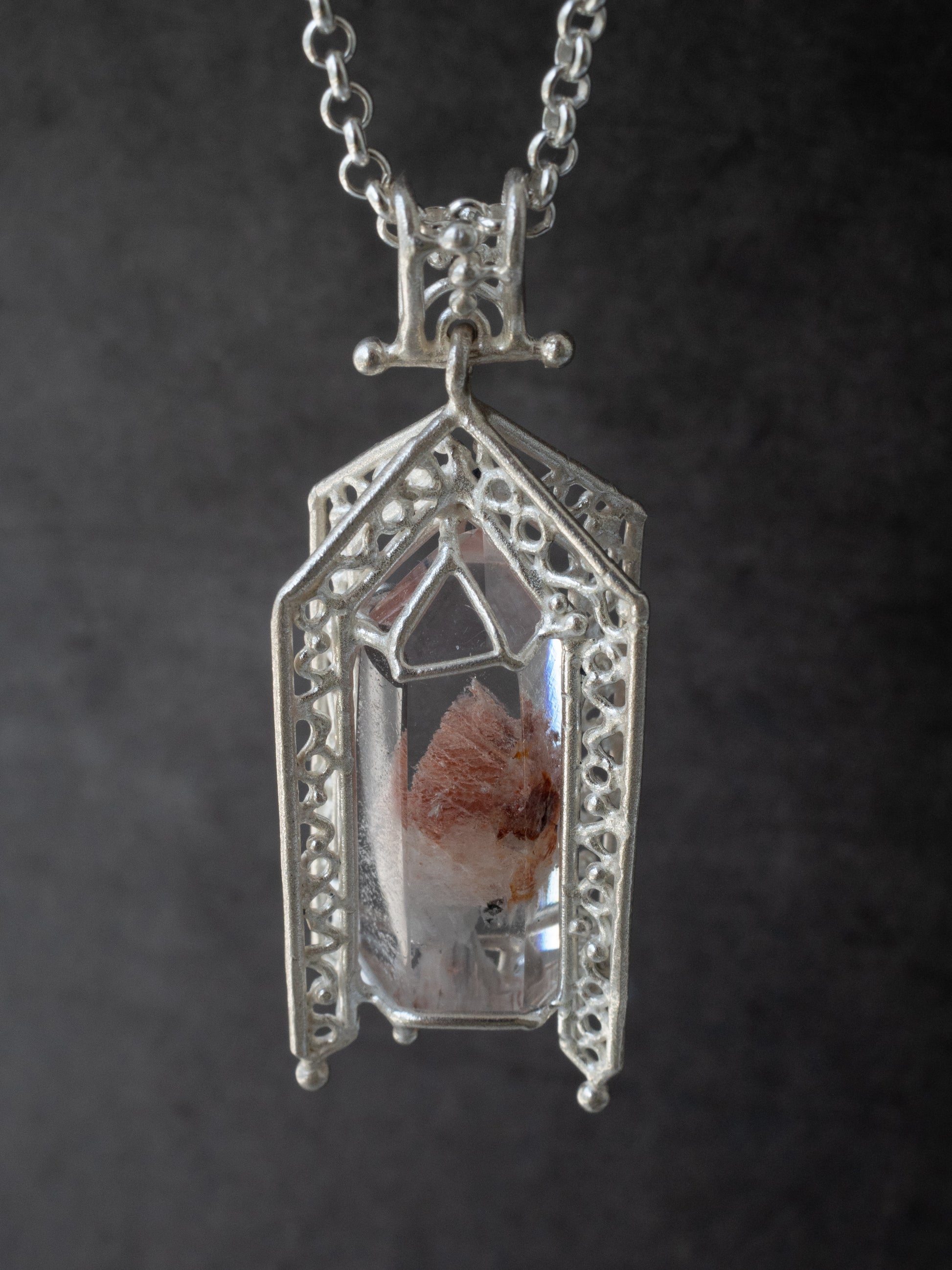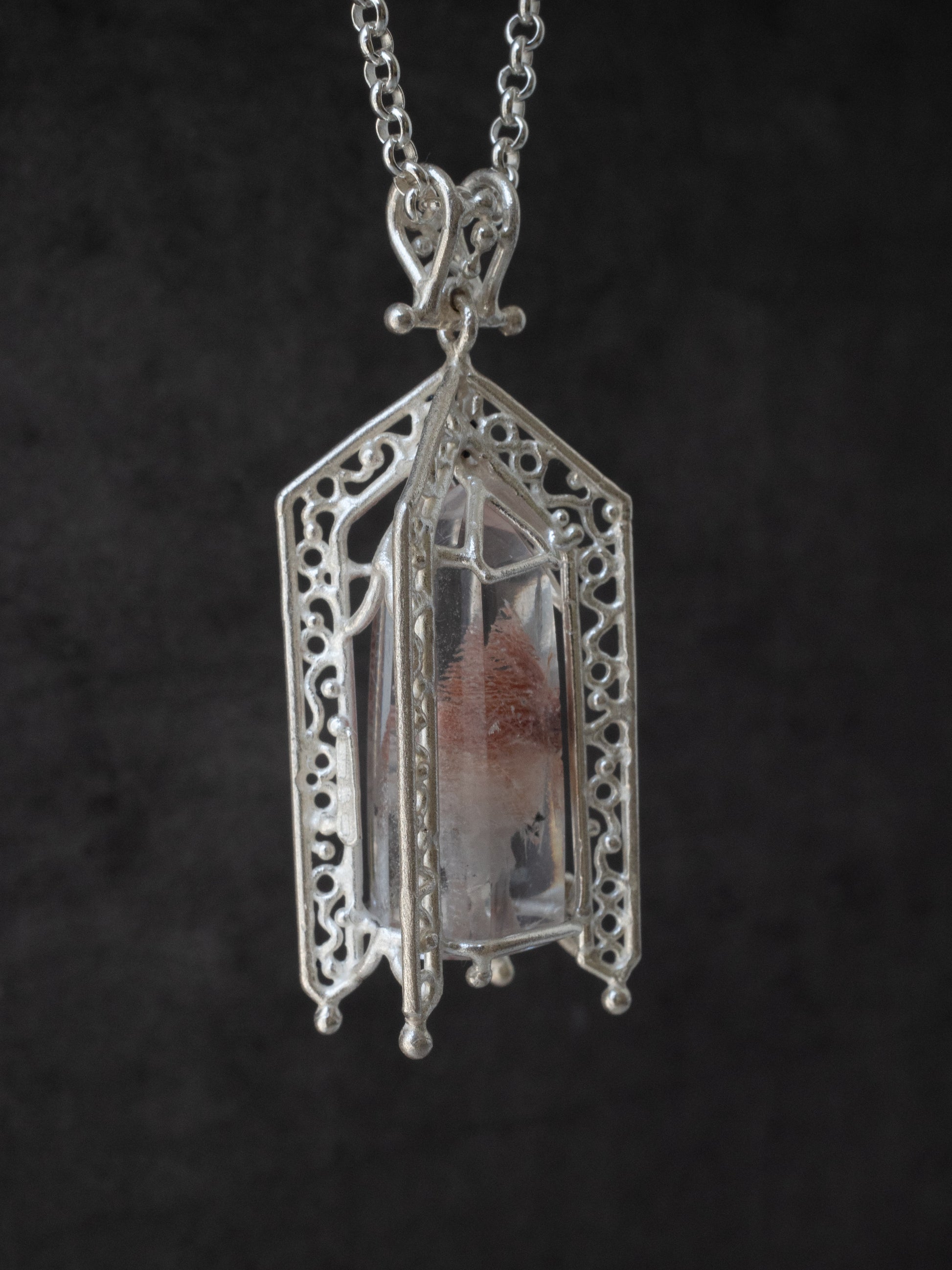水晶の内部に、山のような層が浮かび上がるファントムクォーツをのシルバーペンダント。まるで神殿のような形に仕立てられたデザインは、お守りのような雰囲気があります。
