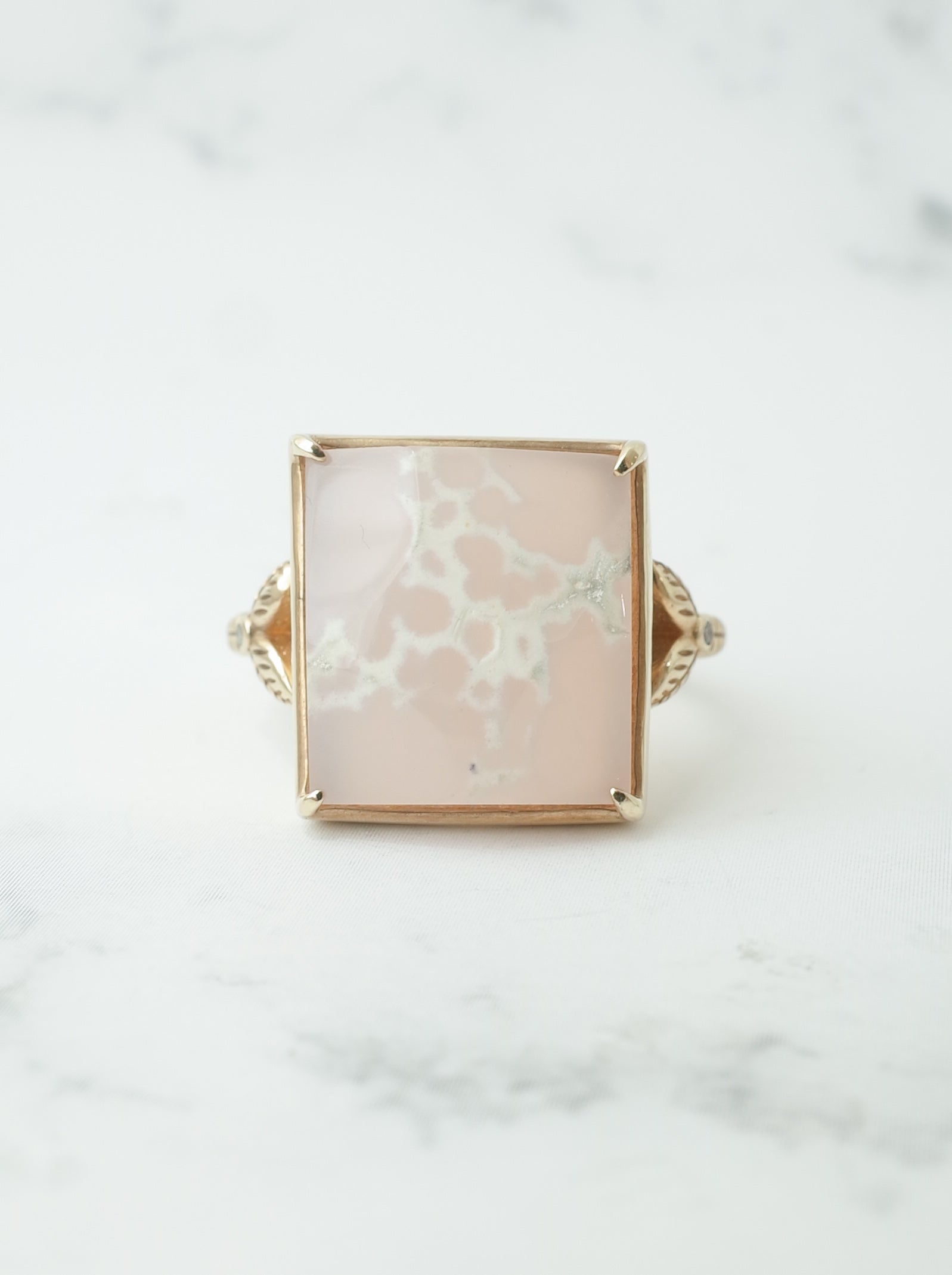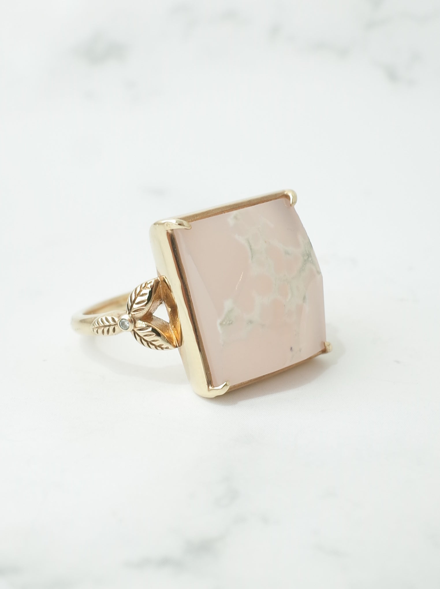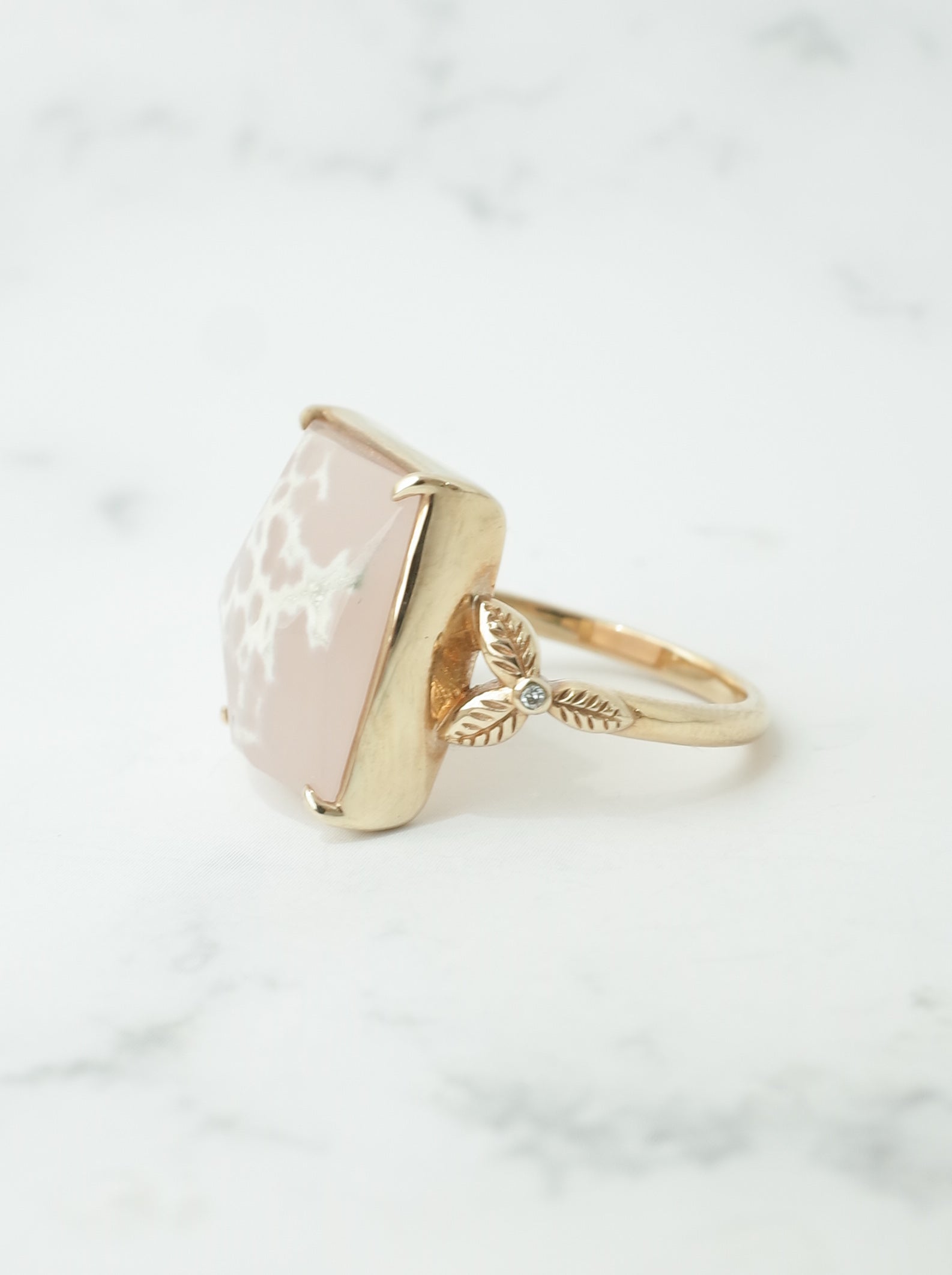 自然に出来上がった模様を、そのまま切り取るようにカットしたピンクカルセドニー。桜のような淡いピンクも魅力的です。石を花のように見立てて、サイドには三つ葉のモチーフを合わせました。