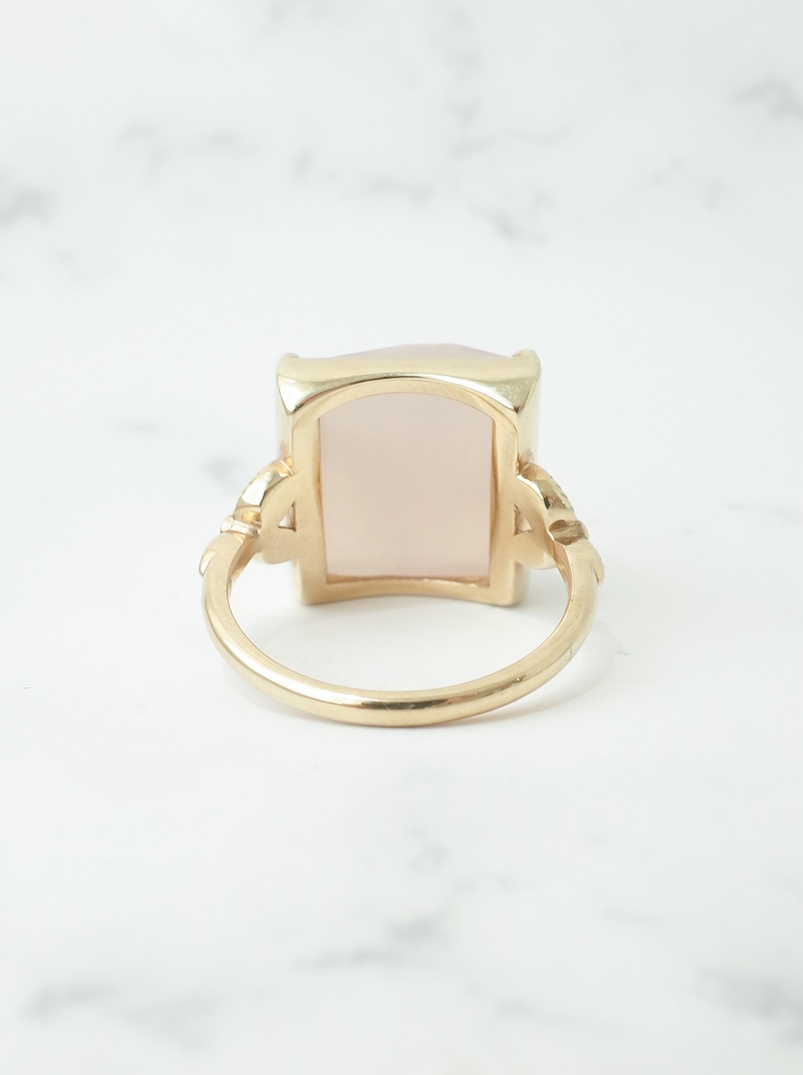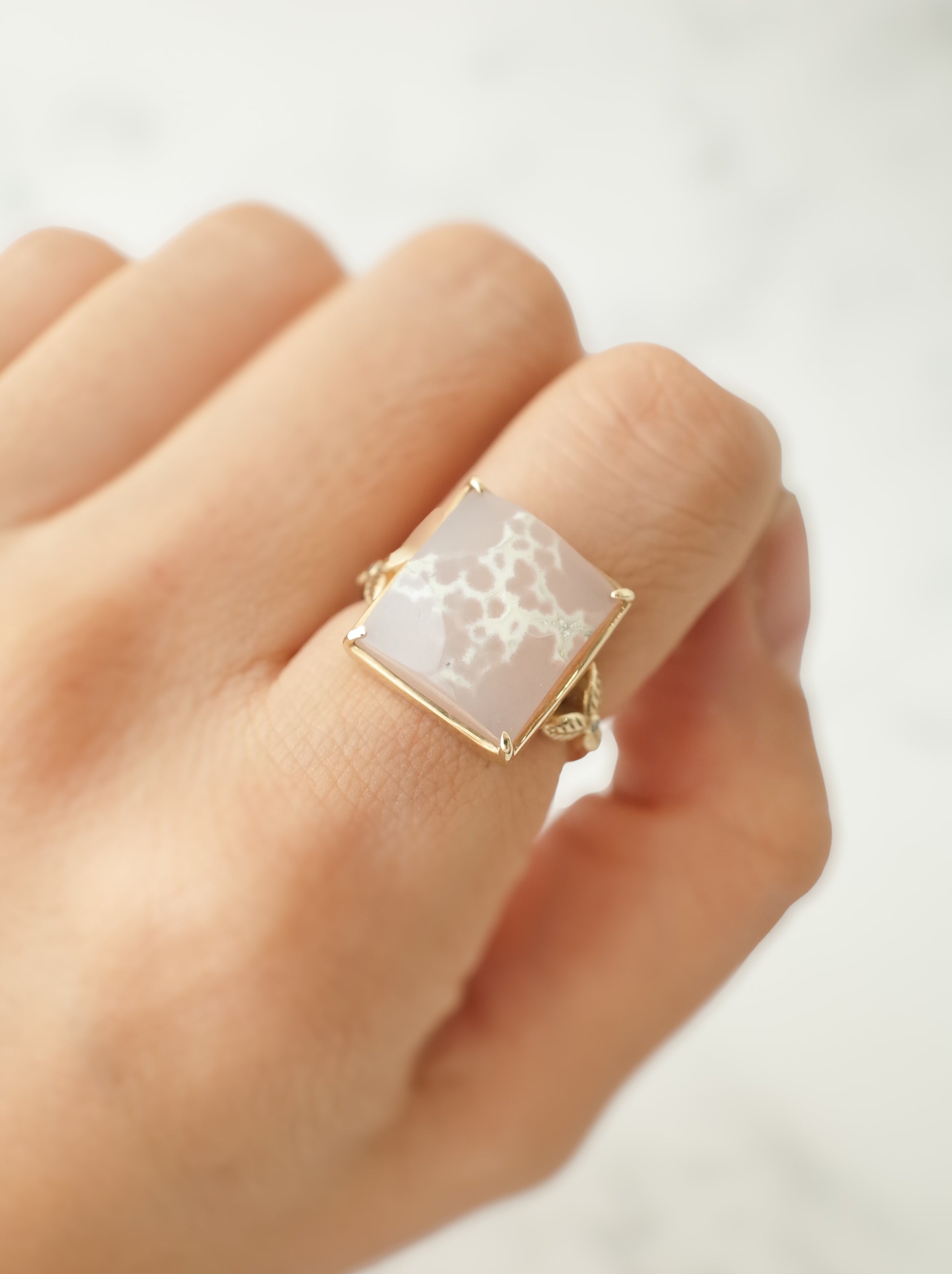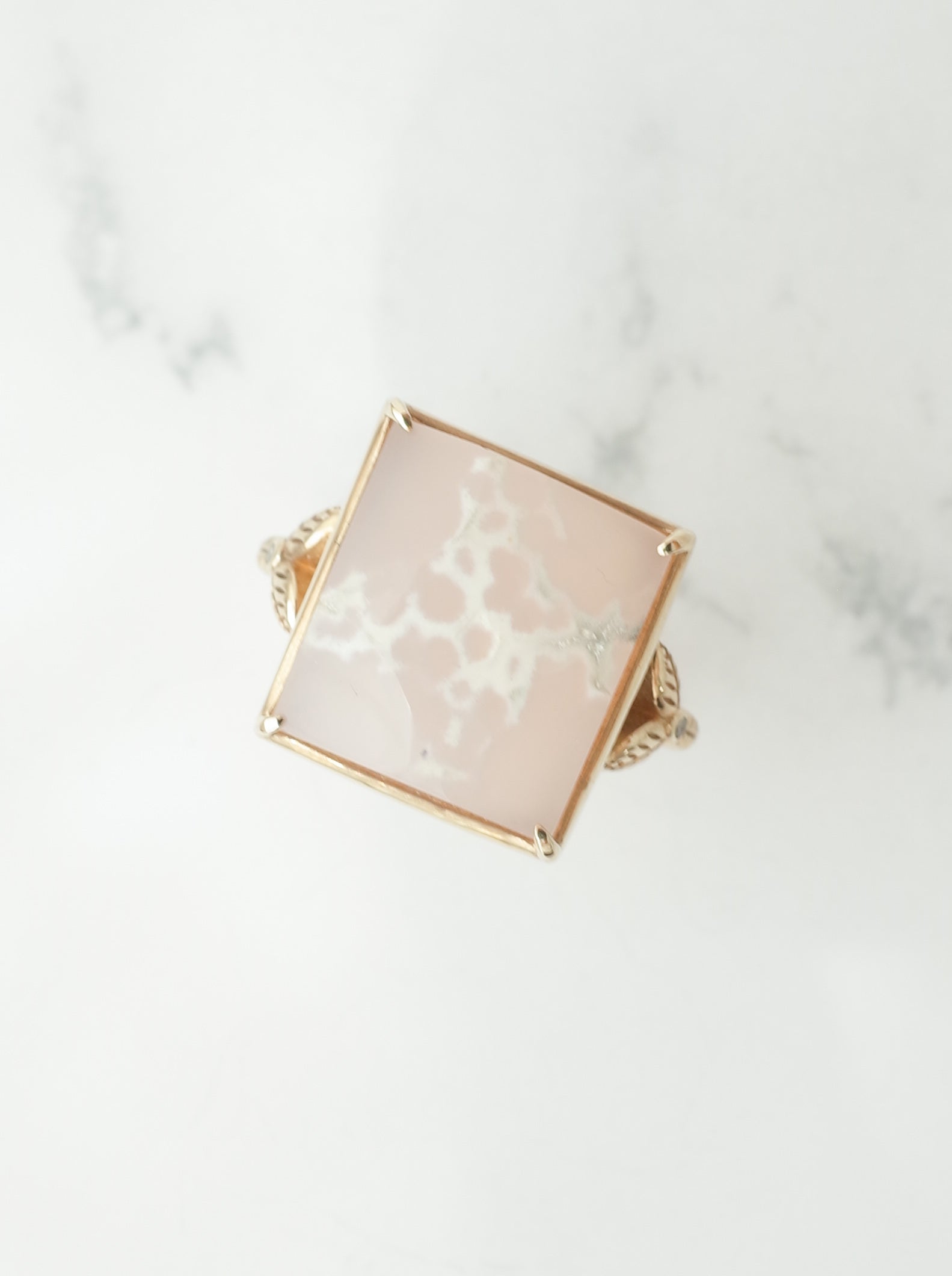 自然に出来上がった模様を、そのまま切り取るようにカットしたピンクカルセドニー。桜のような淡いピンクも魅力的です。石を花のように見立てて、サイドには三つ葉のモチーフを合わせました。