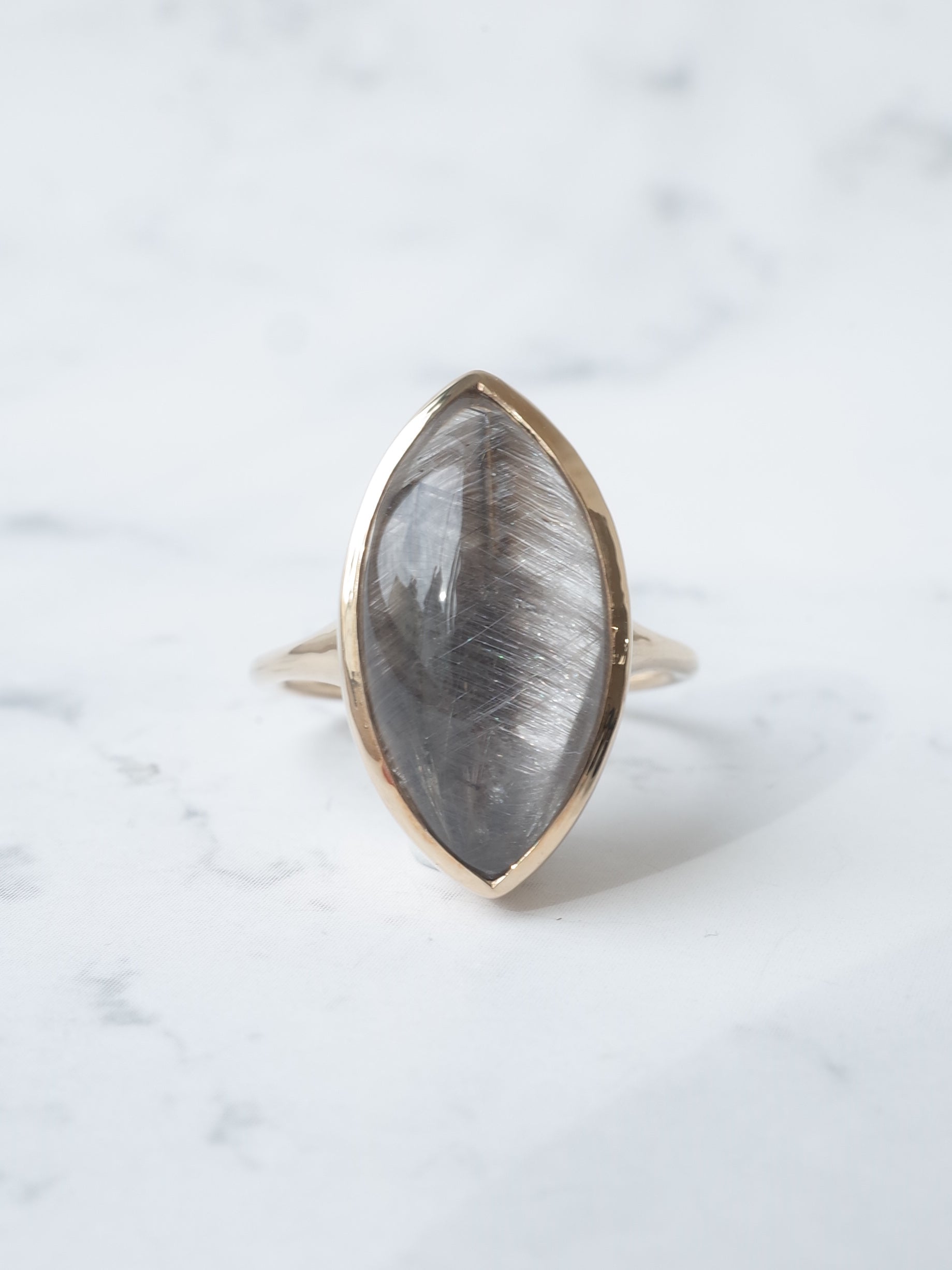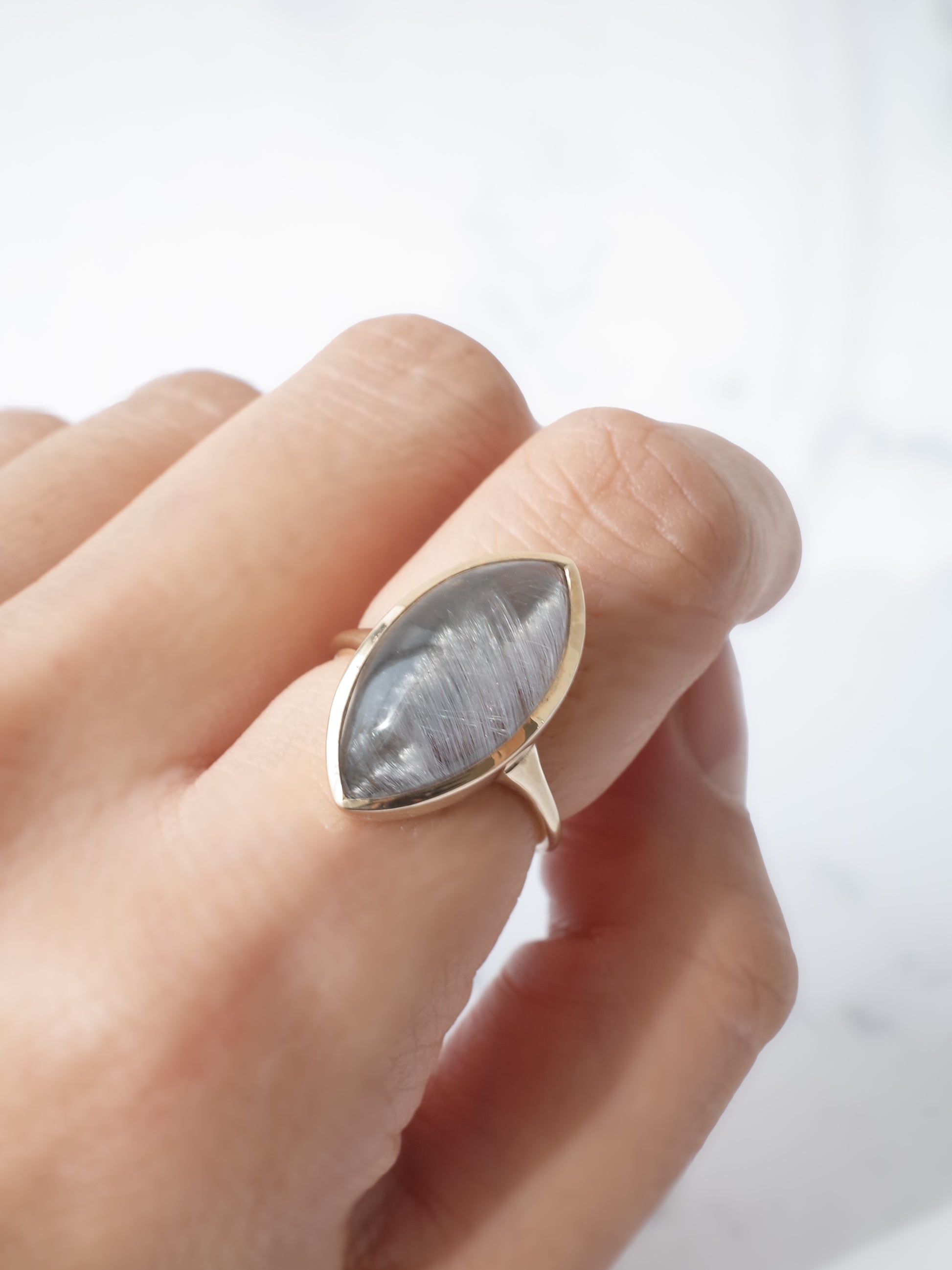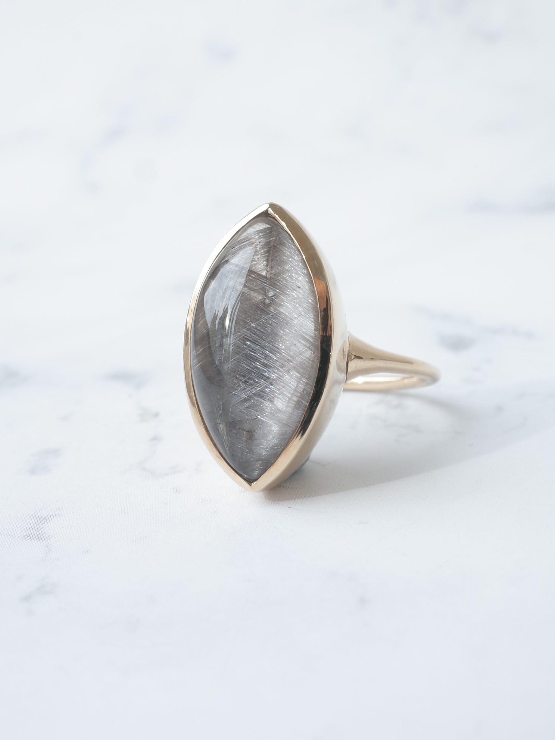 ルチルクォーツの中でも銀色のプラチナカラーとキャッツアイ効果を持つものは『プラチナルチル』と呼ばれています。一般的に知られたゴールドカラーに比べると産出自体が少なく、リッチでありながら華やかすぎないクールな光沢が魅力です。落ち着いた色合いで、様々な装いに合わせやすい点もお勧めです。