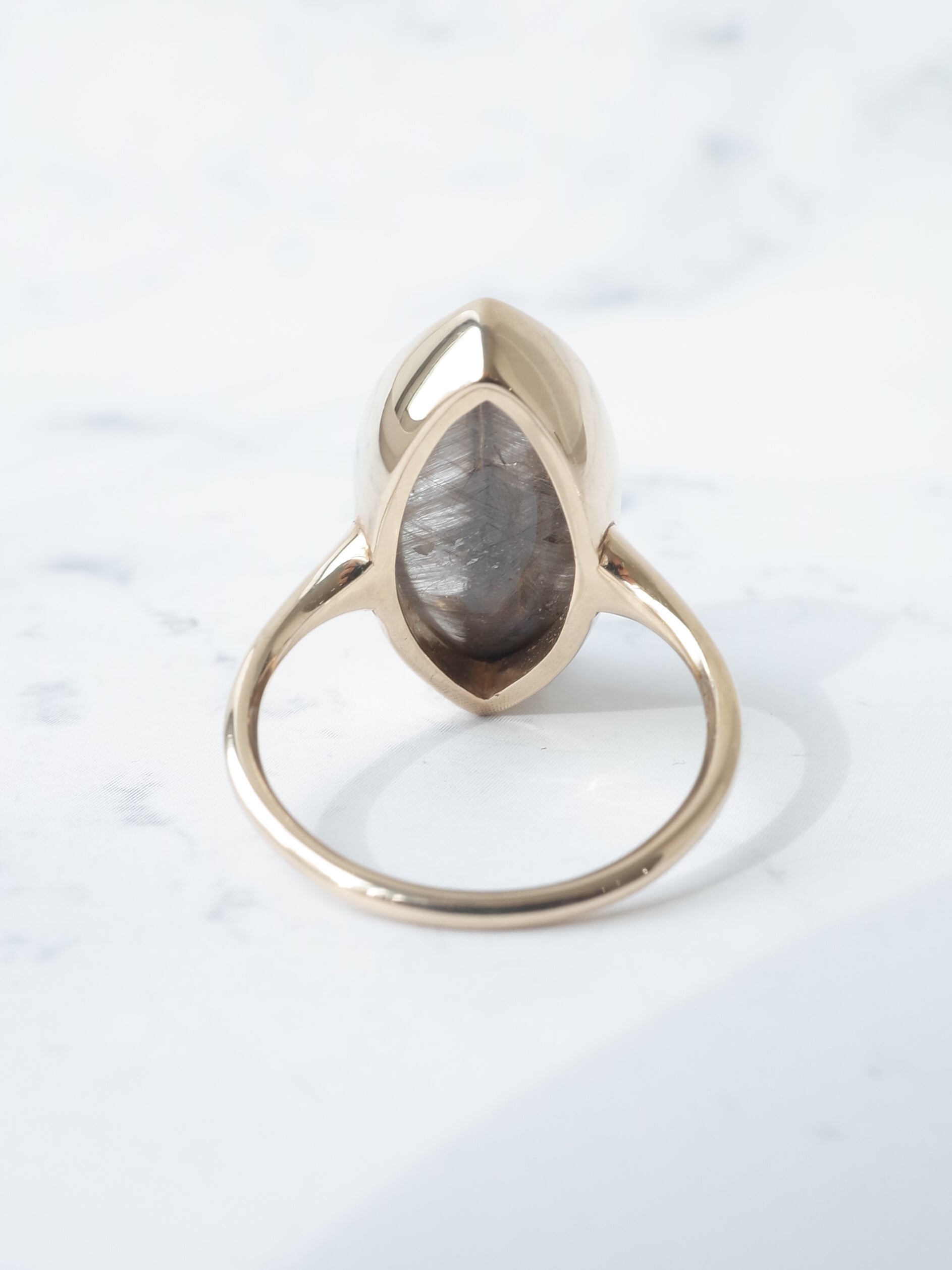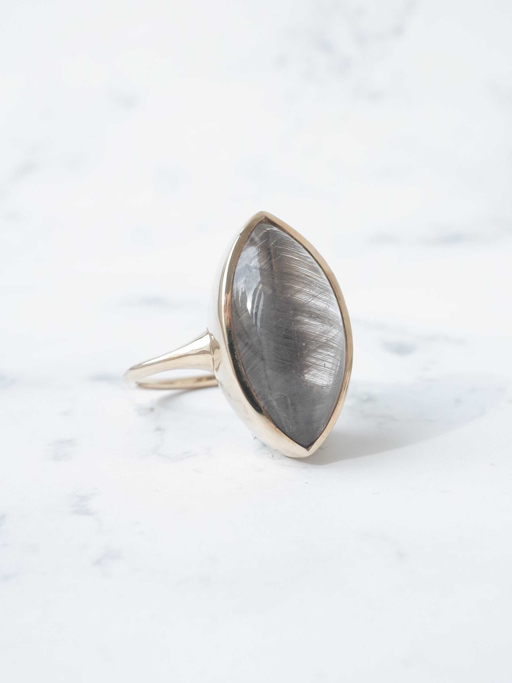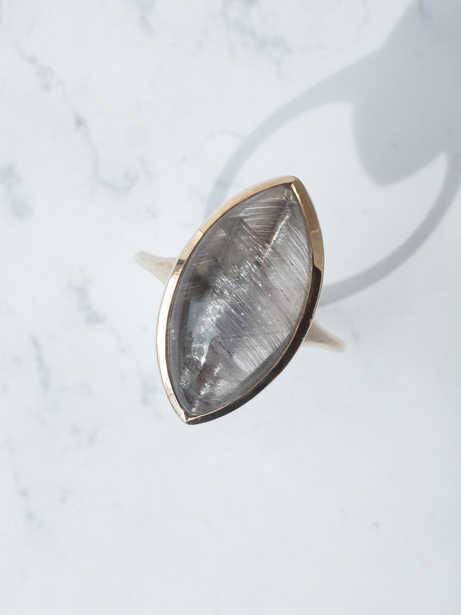 ルチルクォーツの中でも銀色のプラチナカラーとキャッツアイ効果を持つものは『プラチナルチル』と呼ばれています。一般的に知られたゴールドカラーに比べると産出自体が少なく、リッチでありながら華やかすぎないクールな光沢が魅力です。落ち着いた色合いで、様々な装いに合わせやすい点もお勧めです。