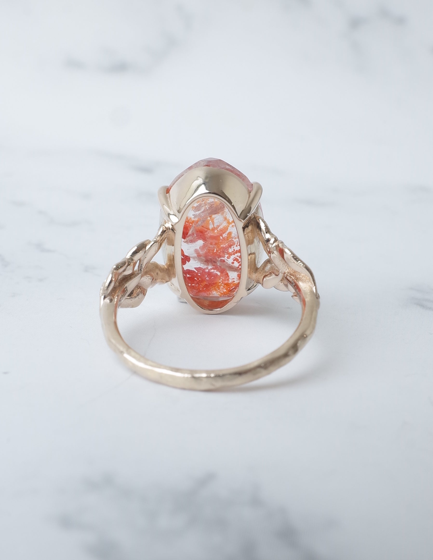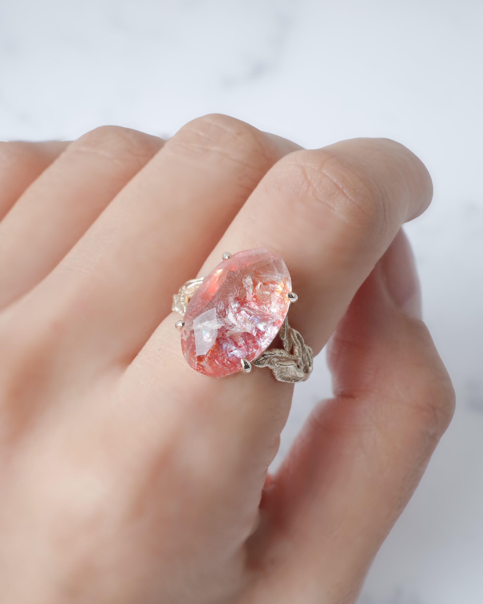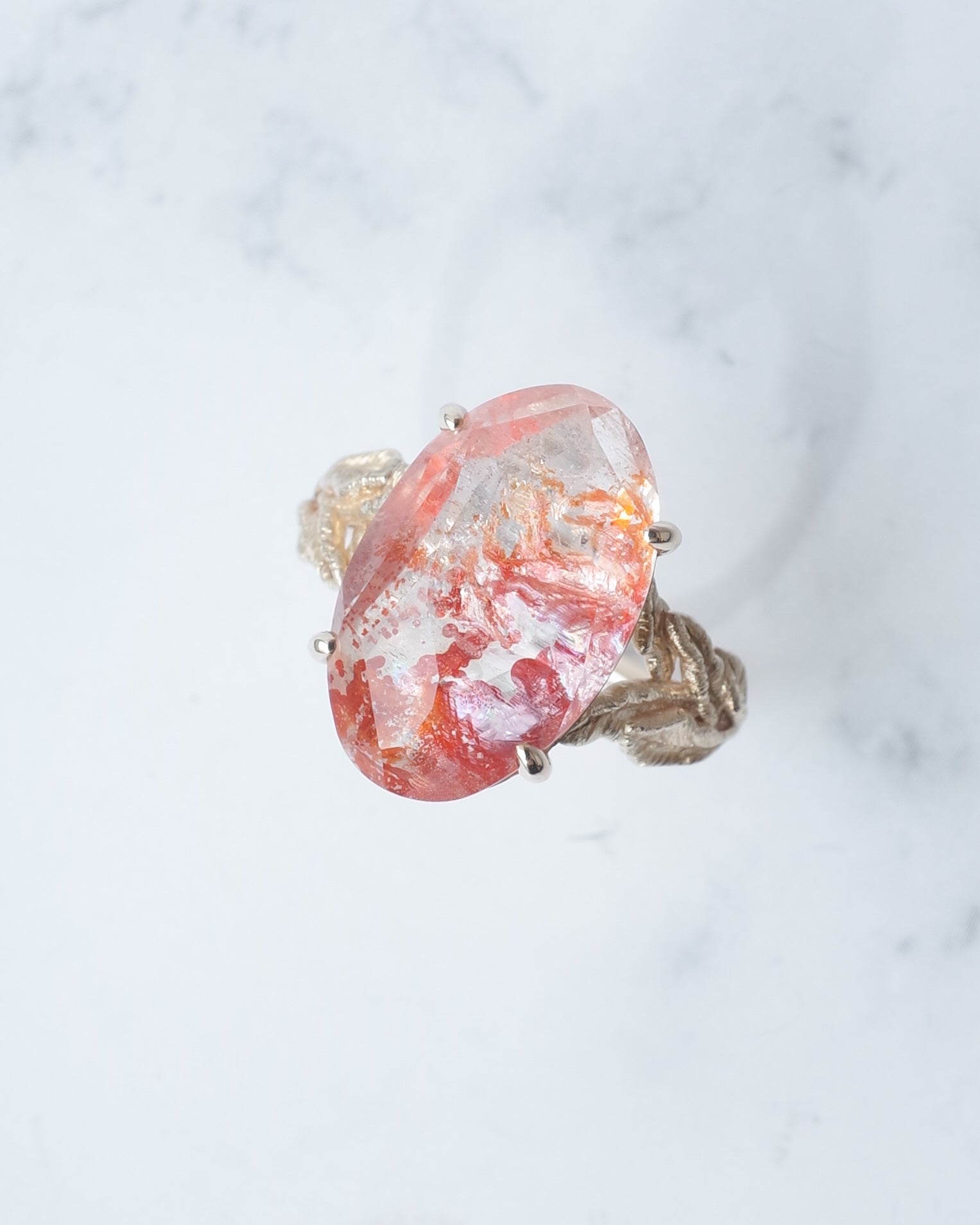 クリアな水晶の中に、差し色のように入る赤と黄色が魅力的なオーロラクォーツは、赤い部分がヘマタイト、黄色い部分がリモナイトというインクルージョンです。ランダムなカットによる内部反射により、見る角度によって様々な表情を見せてくれます。