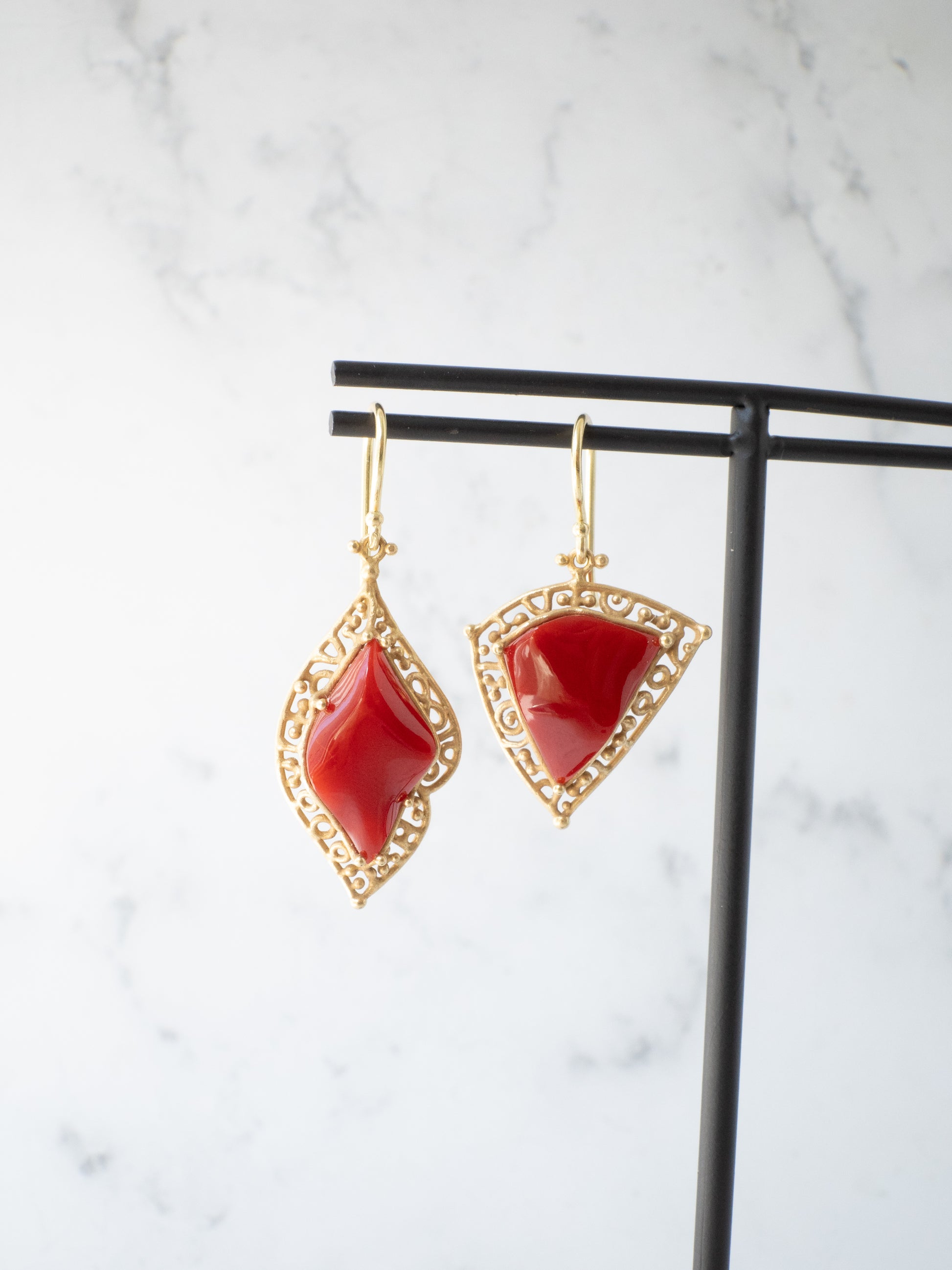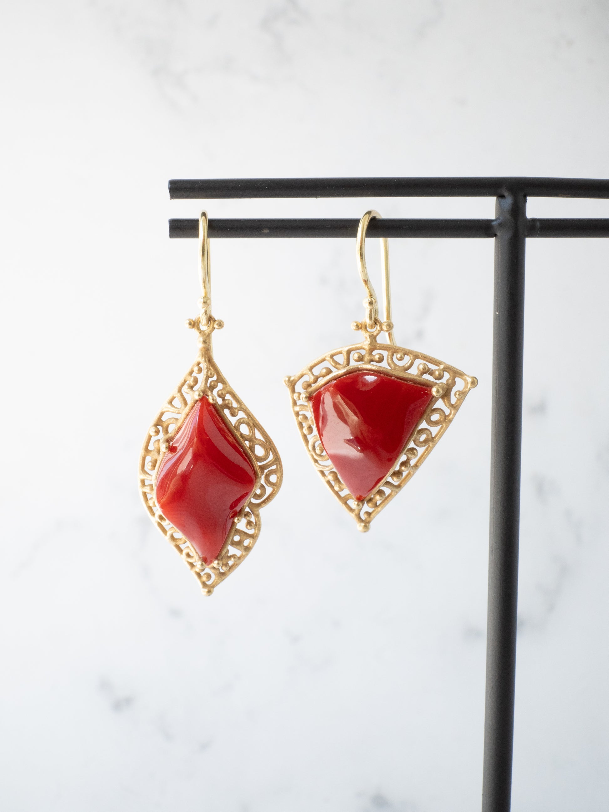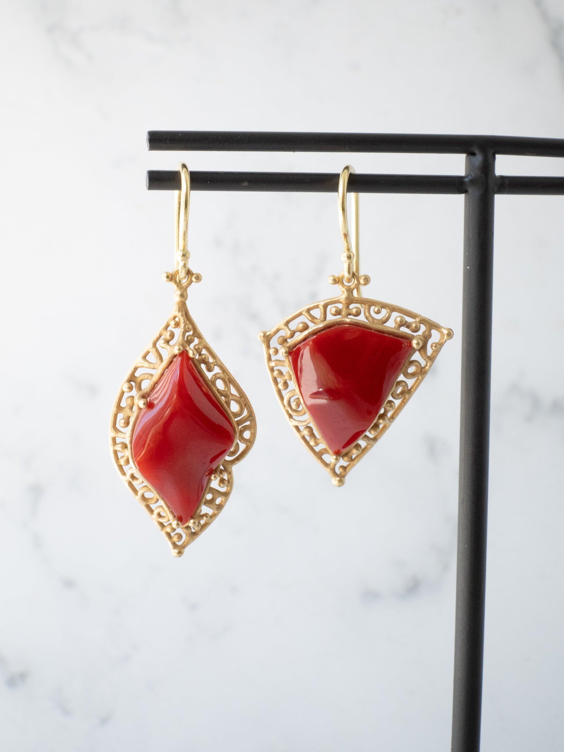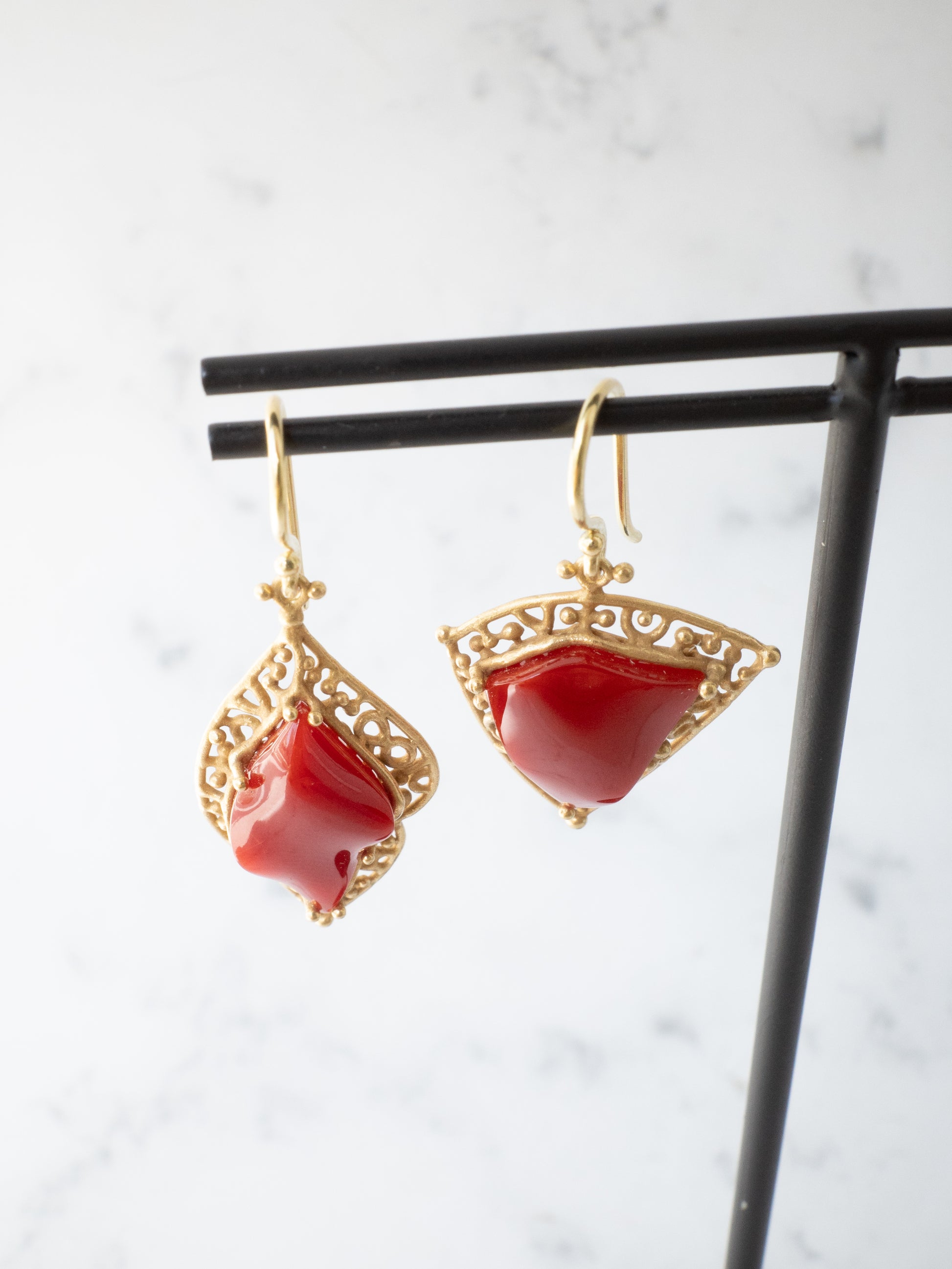 合わせたフレームには K18イエローゴールドに燻をかけたマット仕上げ。落ち着いたゴールドの質感が赤珊瑚の深い色を引き立てています。