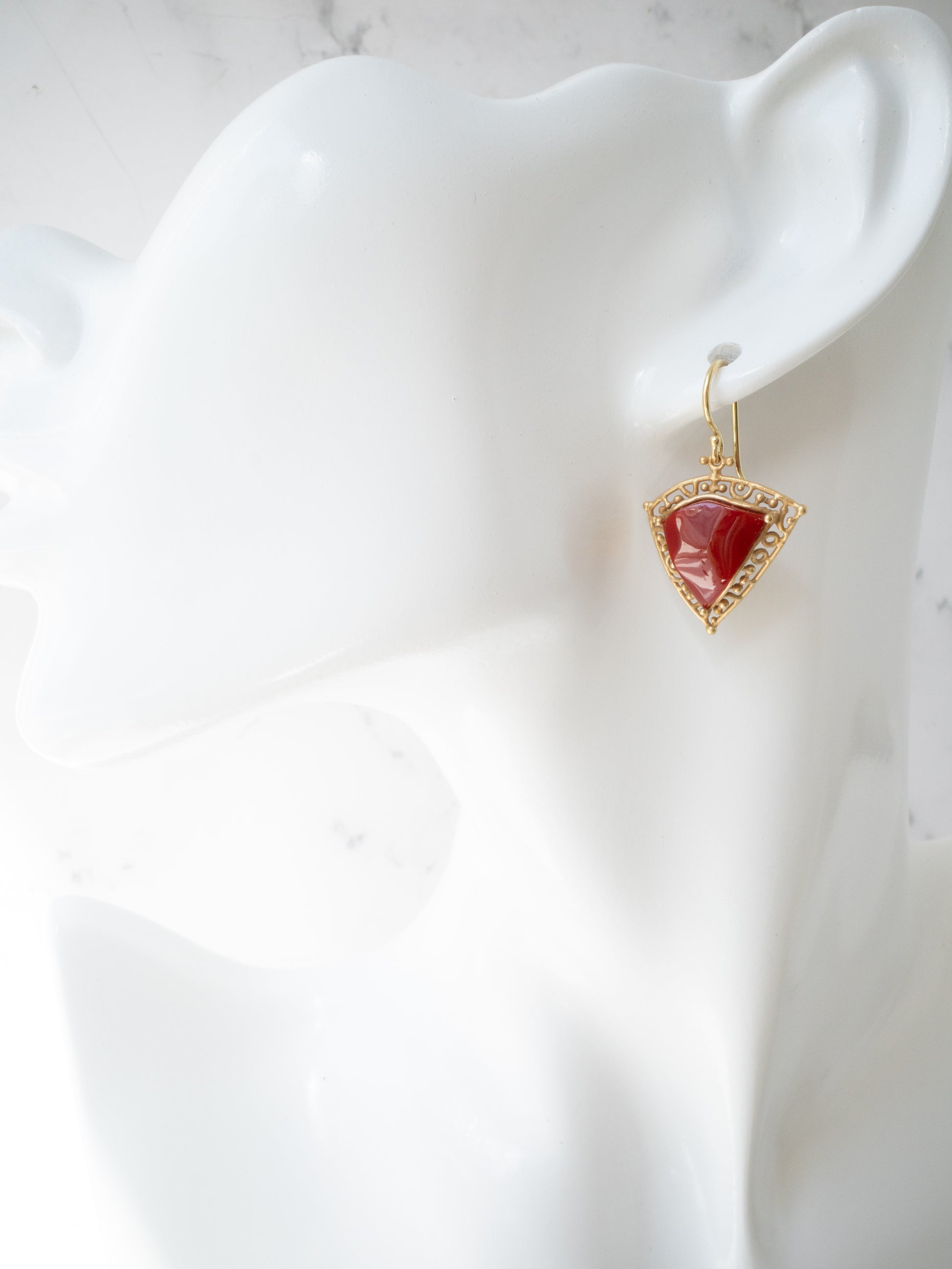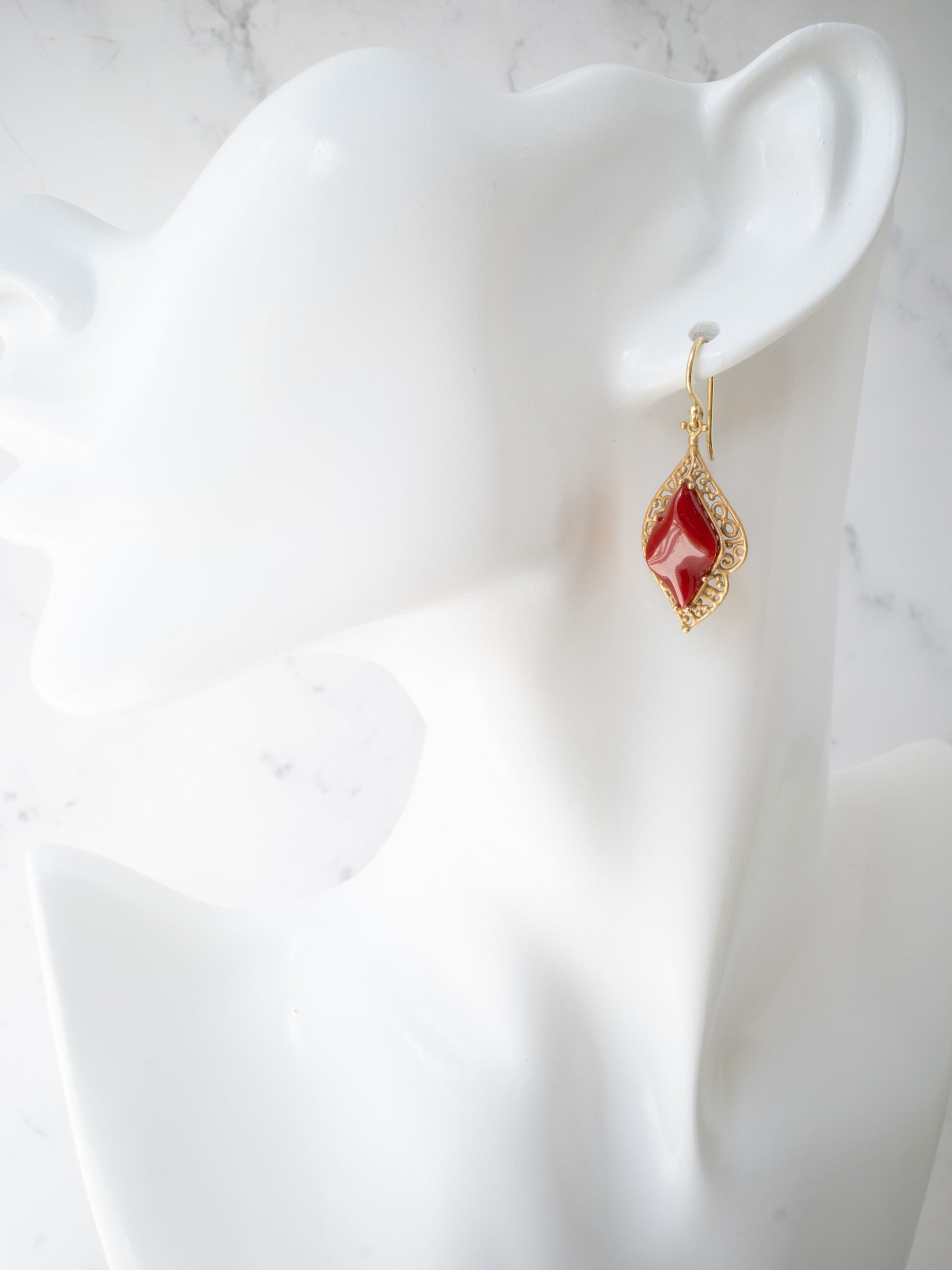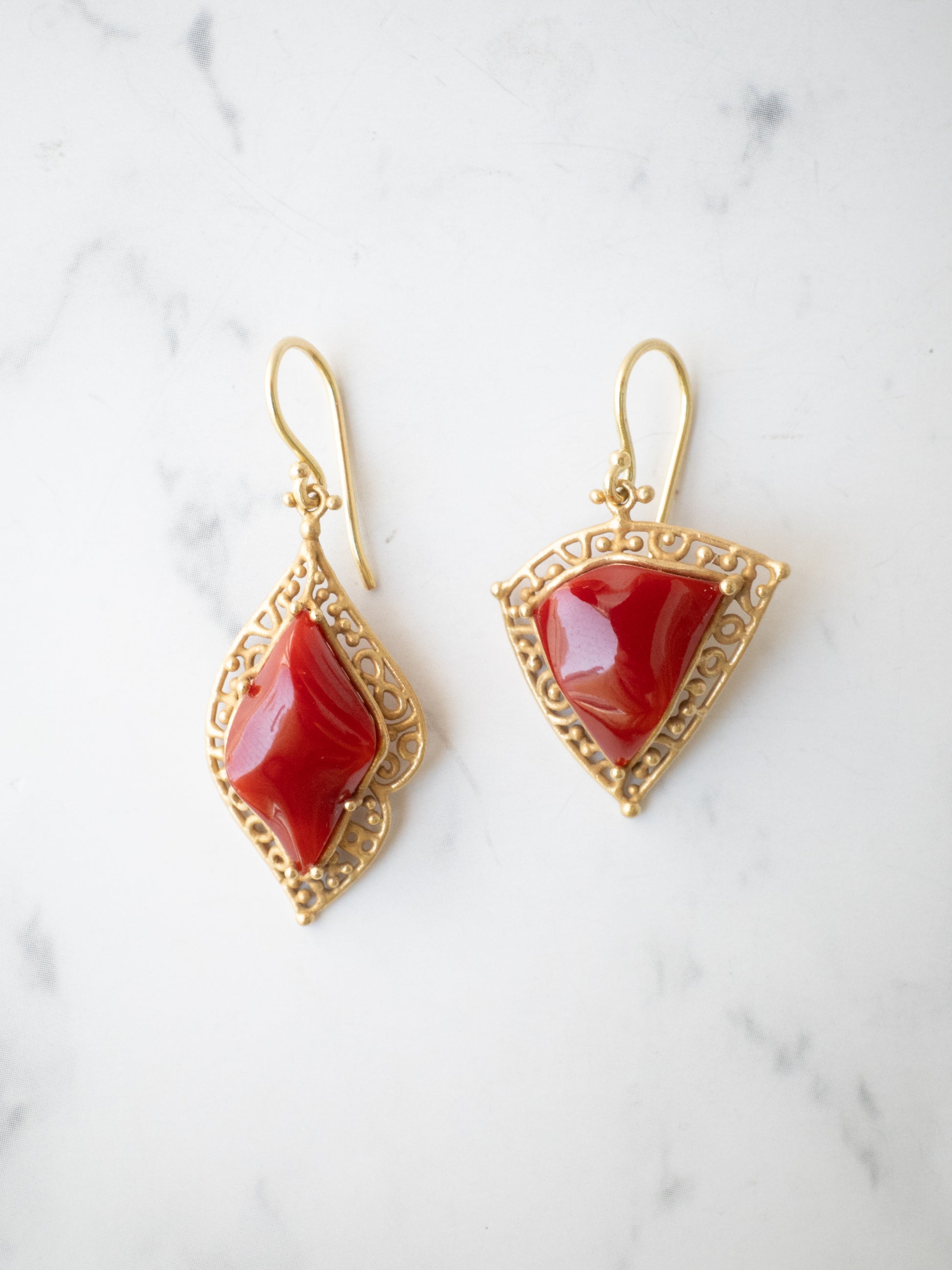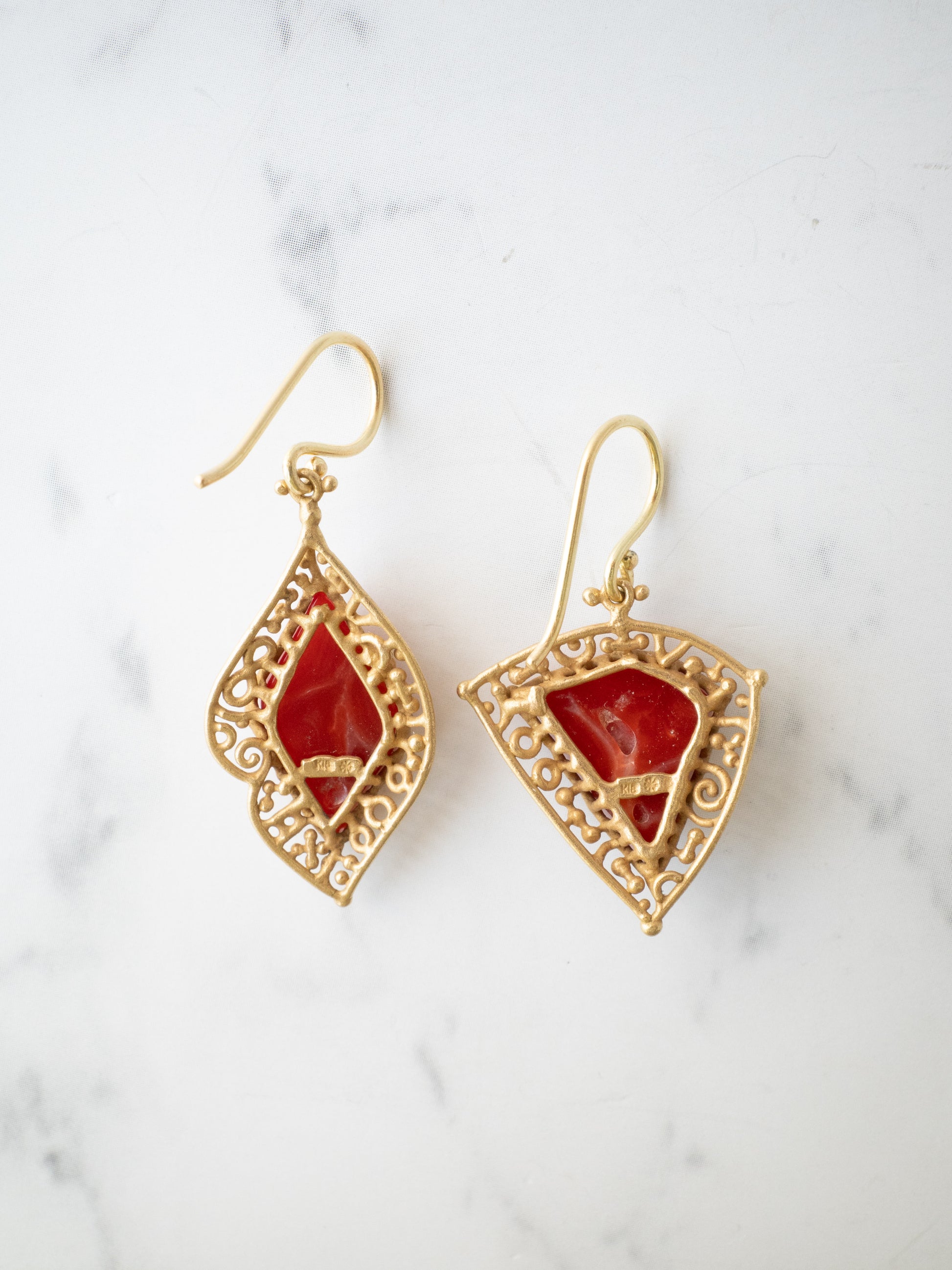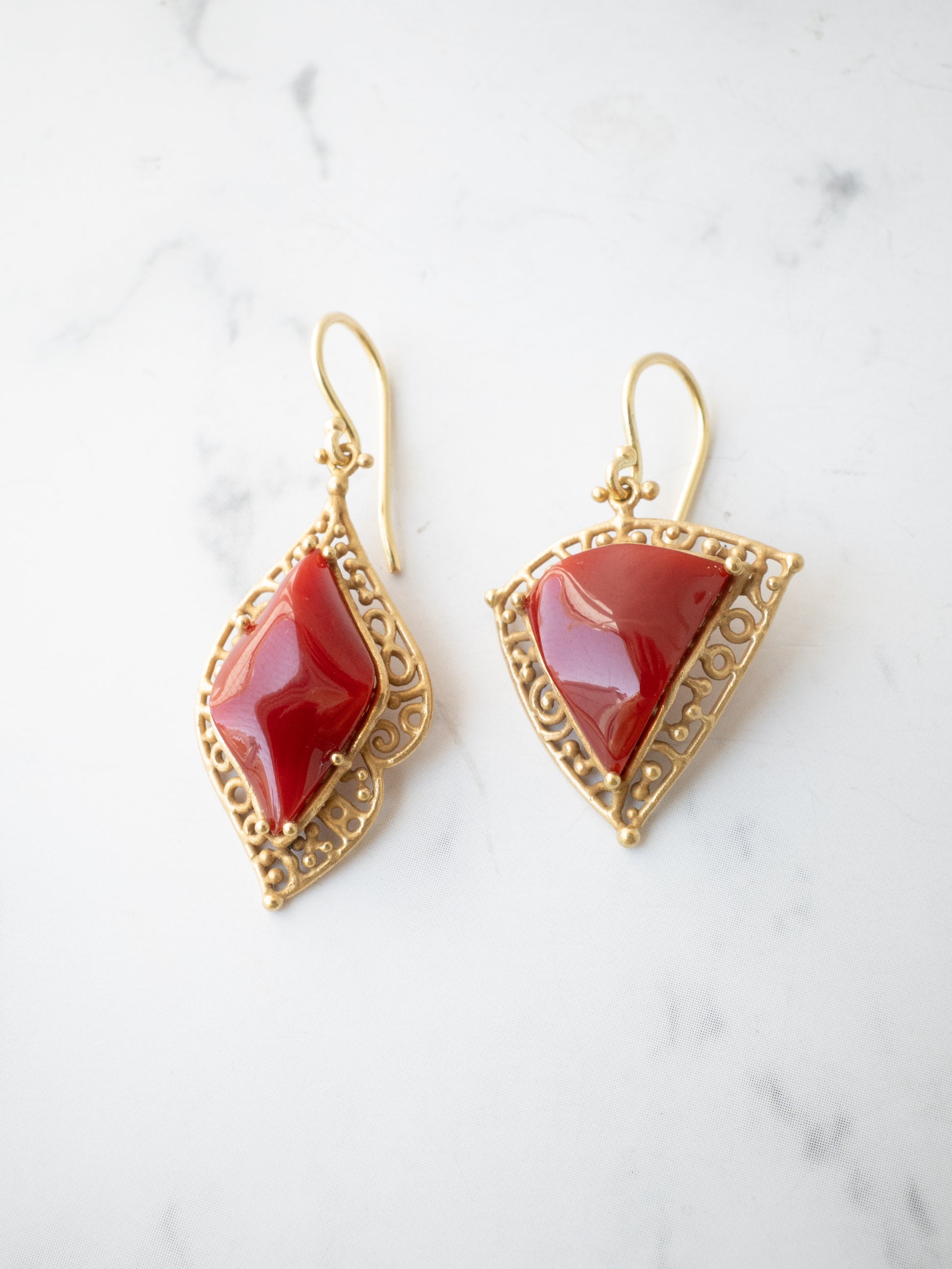 合わせたフレームには K18イエローゴールドに燻をかけたマット仕上げ。落ち着いたゴールドの質感が赤珊瑚の深い色を引き立てています。