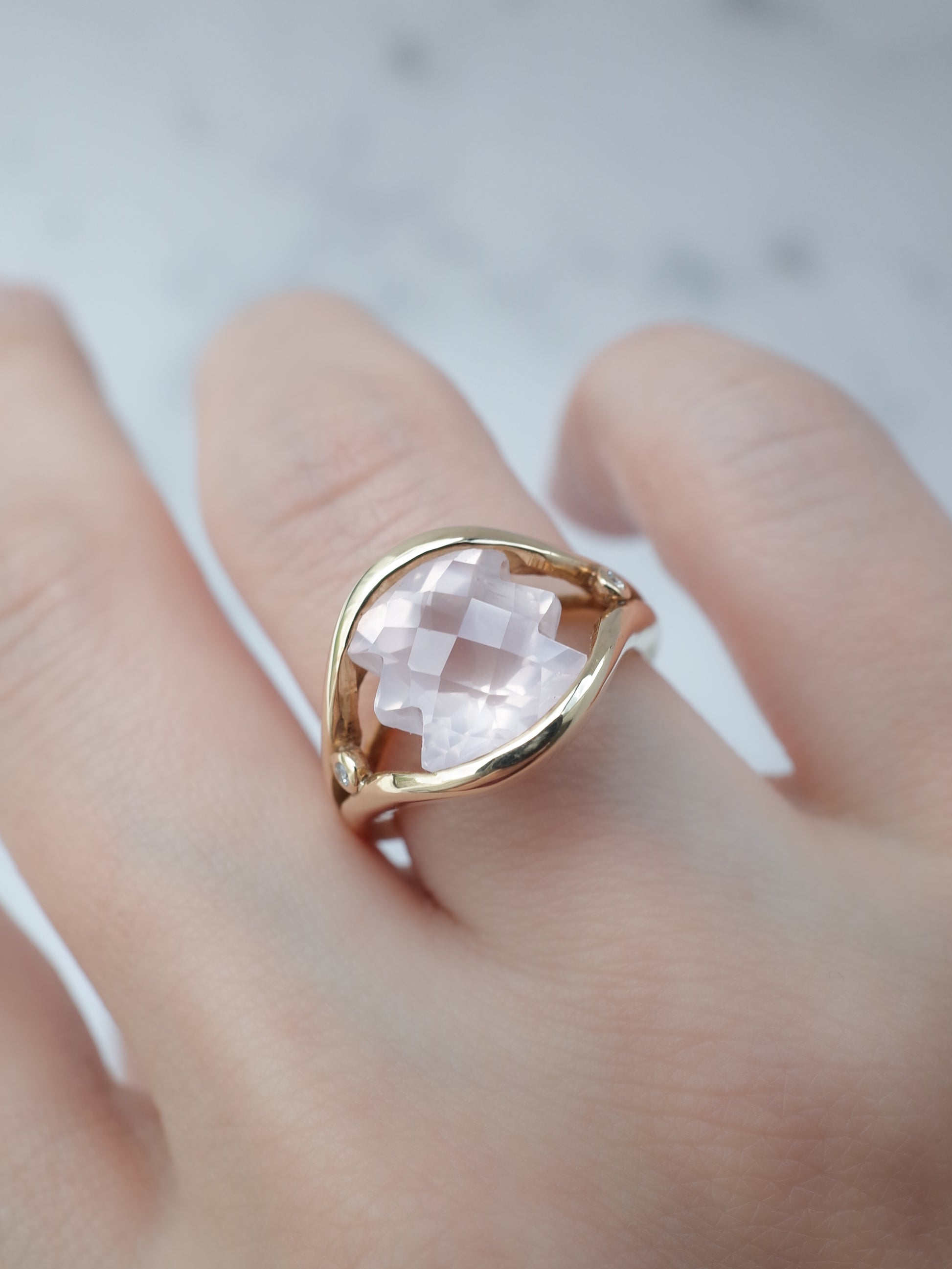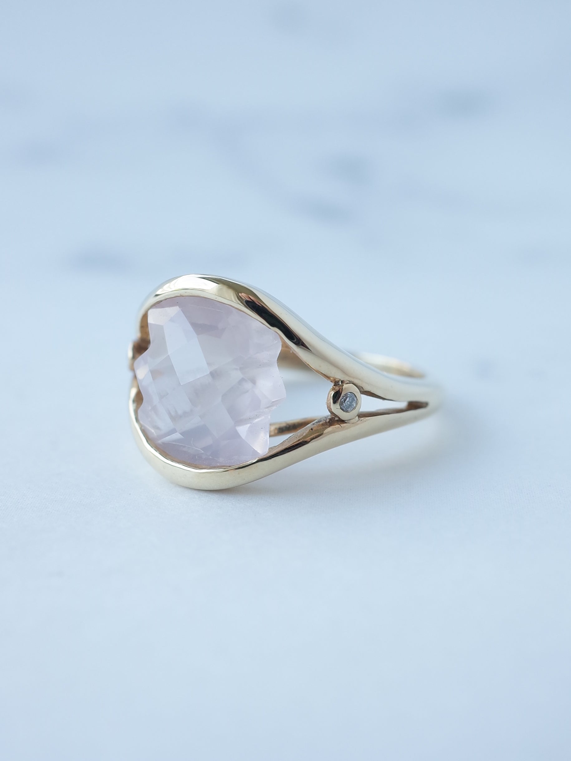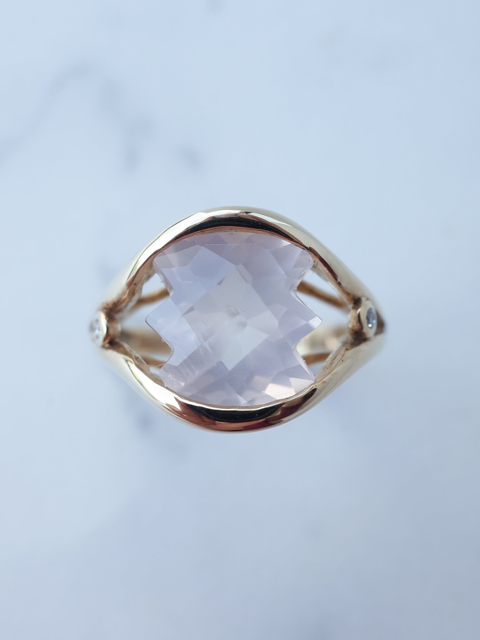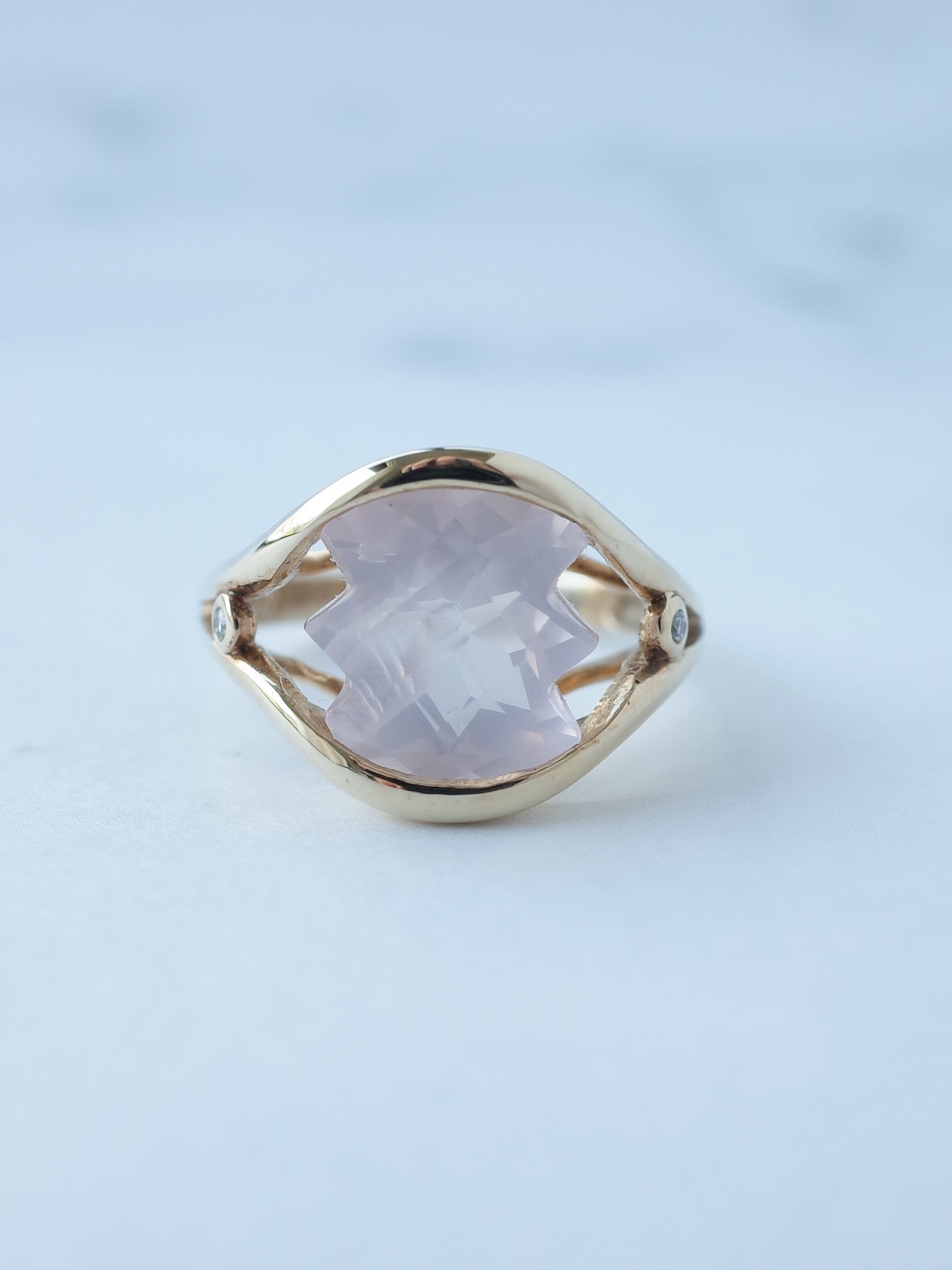 両端がギザギザに切り込まれた珍しいカットのローズクォーツ。表面はチェッカーカットが施され、面白い石のシルエットをより引き立たせてくれています。