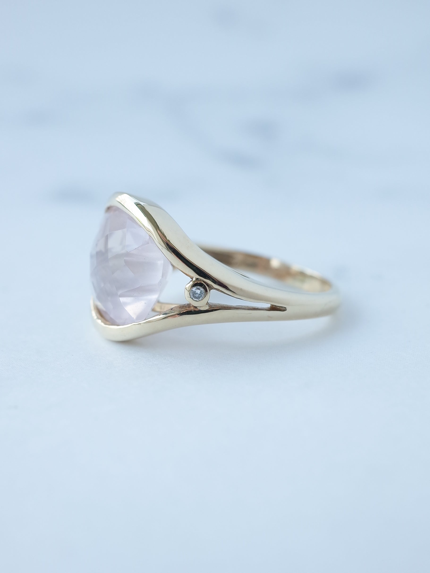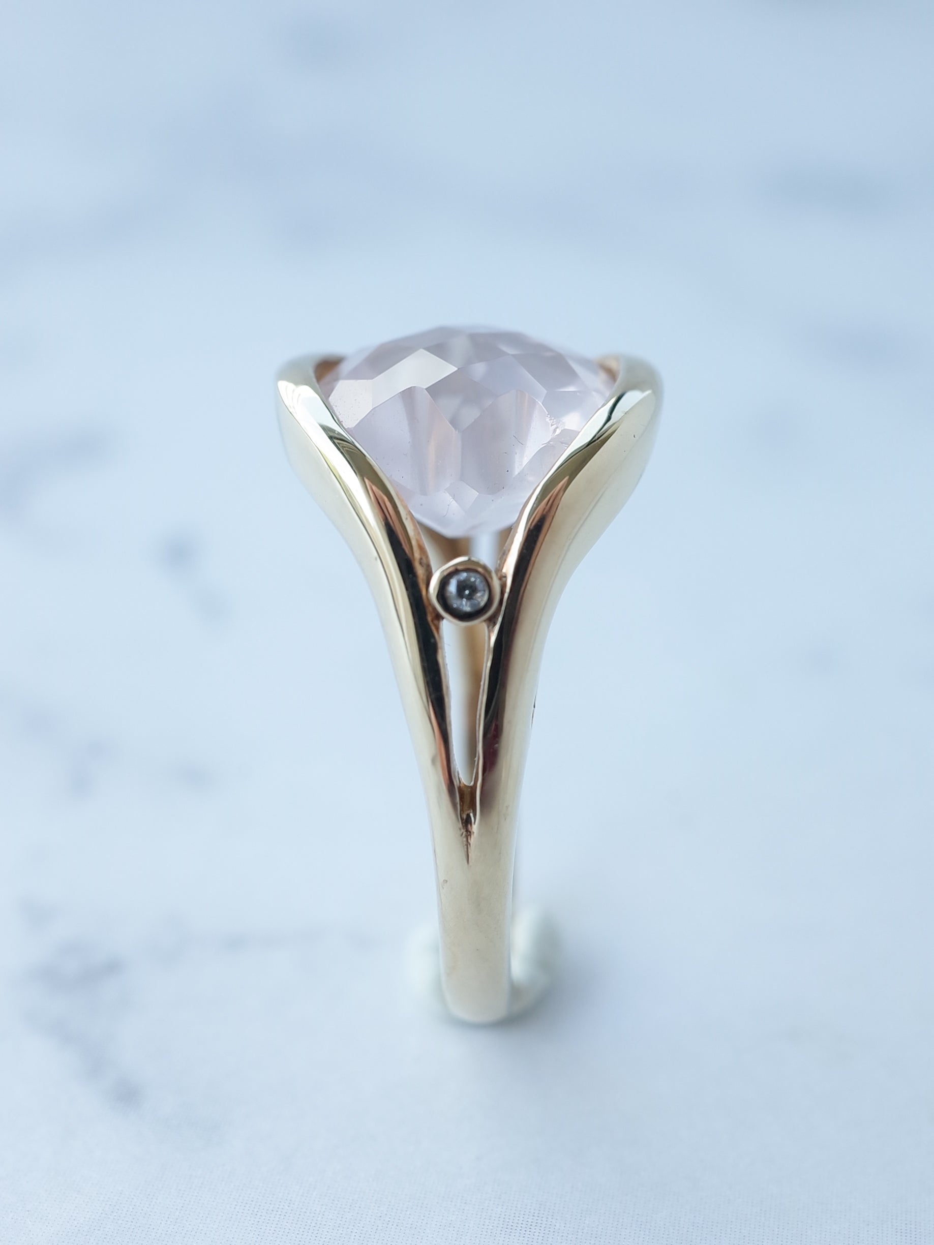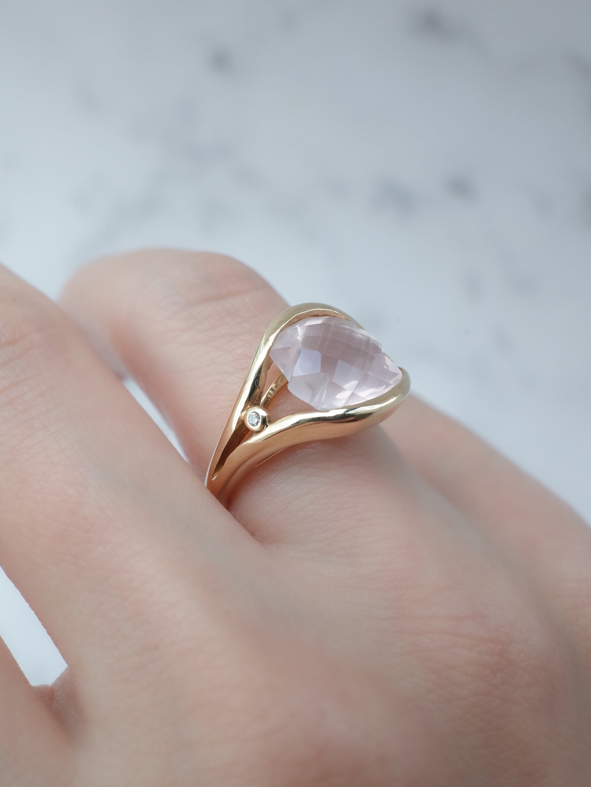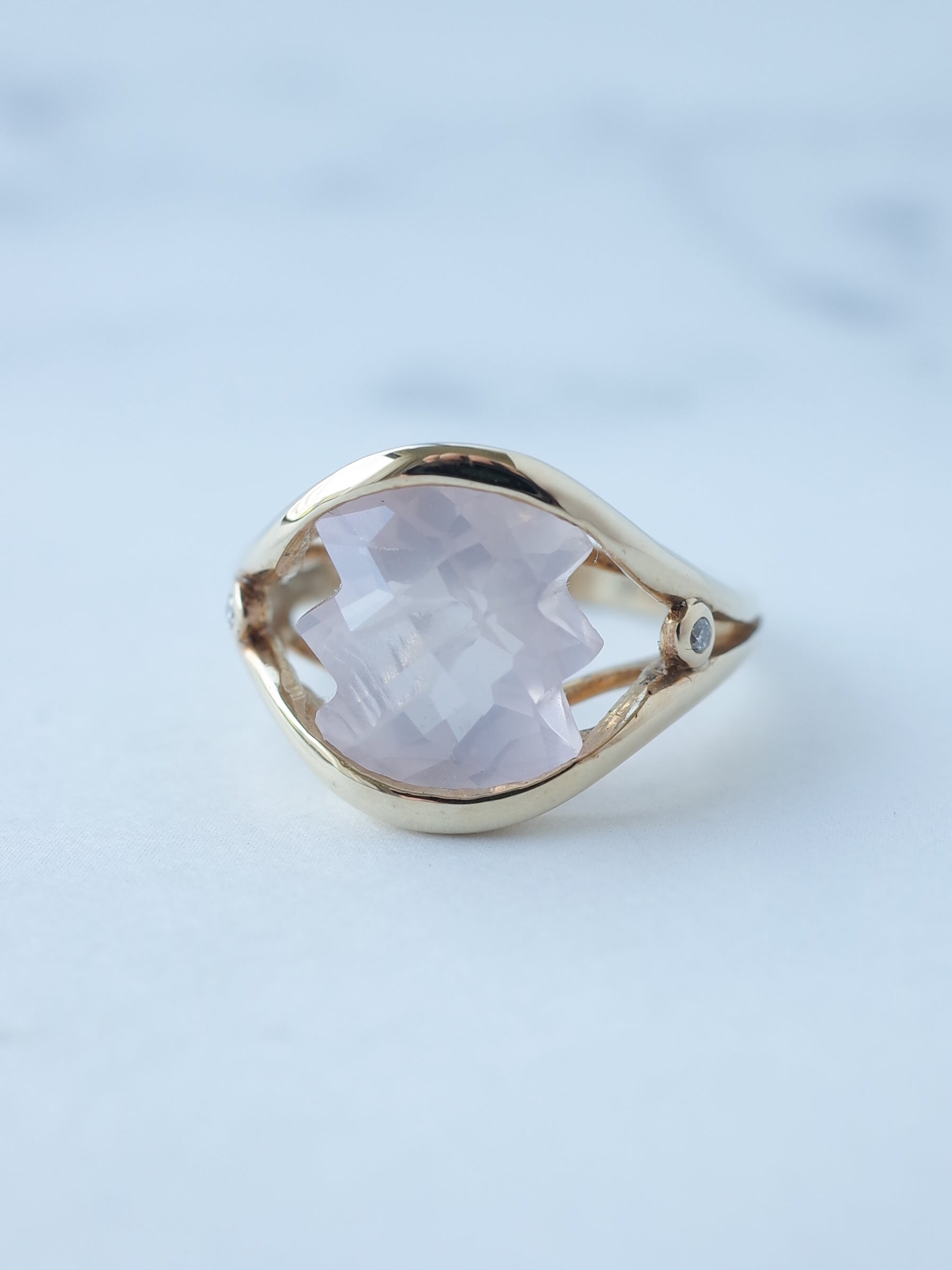 両端がギザギザに切り込まれた珍しいカットのローズクォーツ。表面はチェッカーカットが施され、面白い石のシルエットをより引き立たせてくれています。