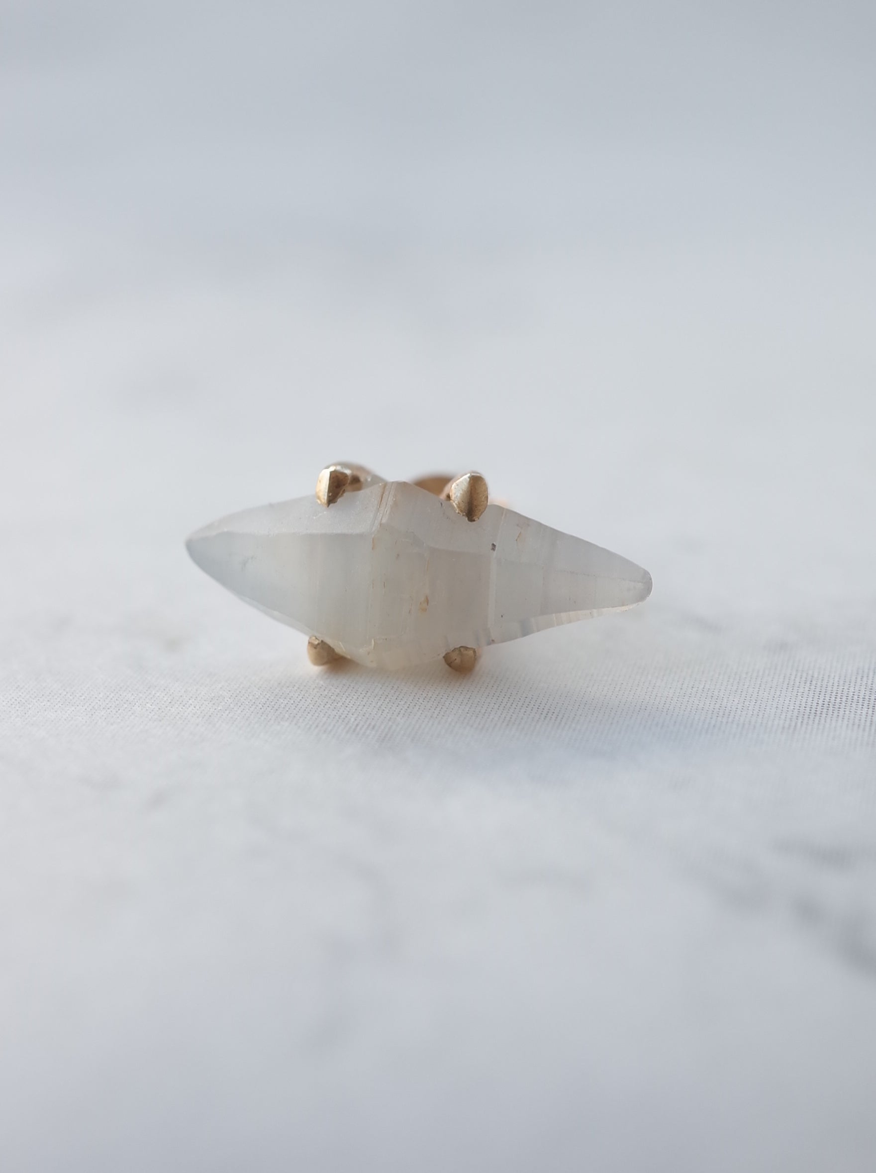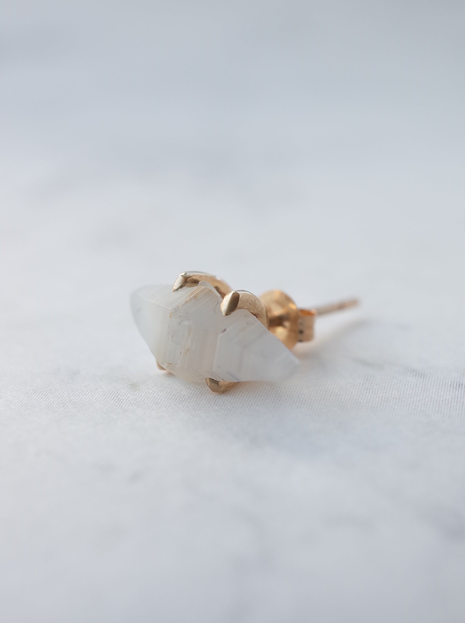 サファイアの結晶原石を使ったポストタイプのピアスです。両端が尖った美しいフォルムの結晶。自然が創り出した造形にも関わらず、ファッションスタイルの一つにもなっている『スタッド(鋲)』のような印象があり、クールさとナチュラルさを兼ね備えた魅力の一点です。