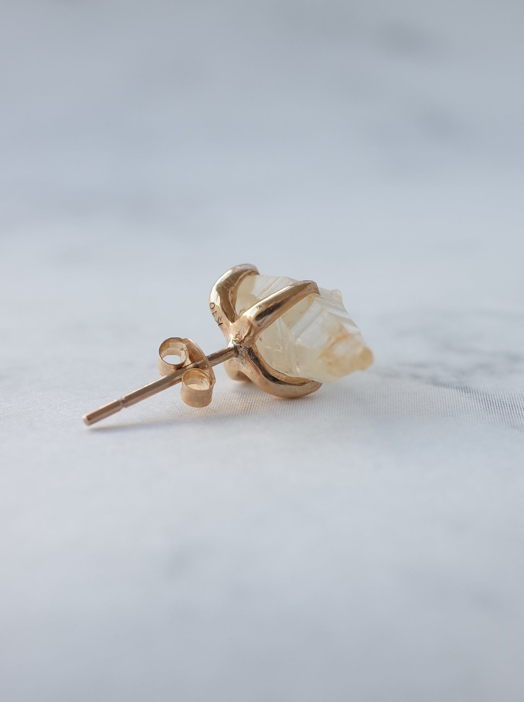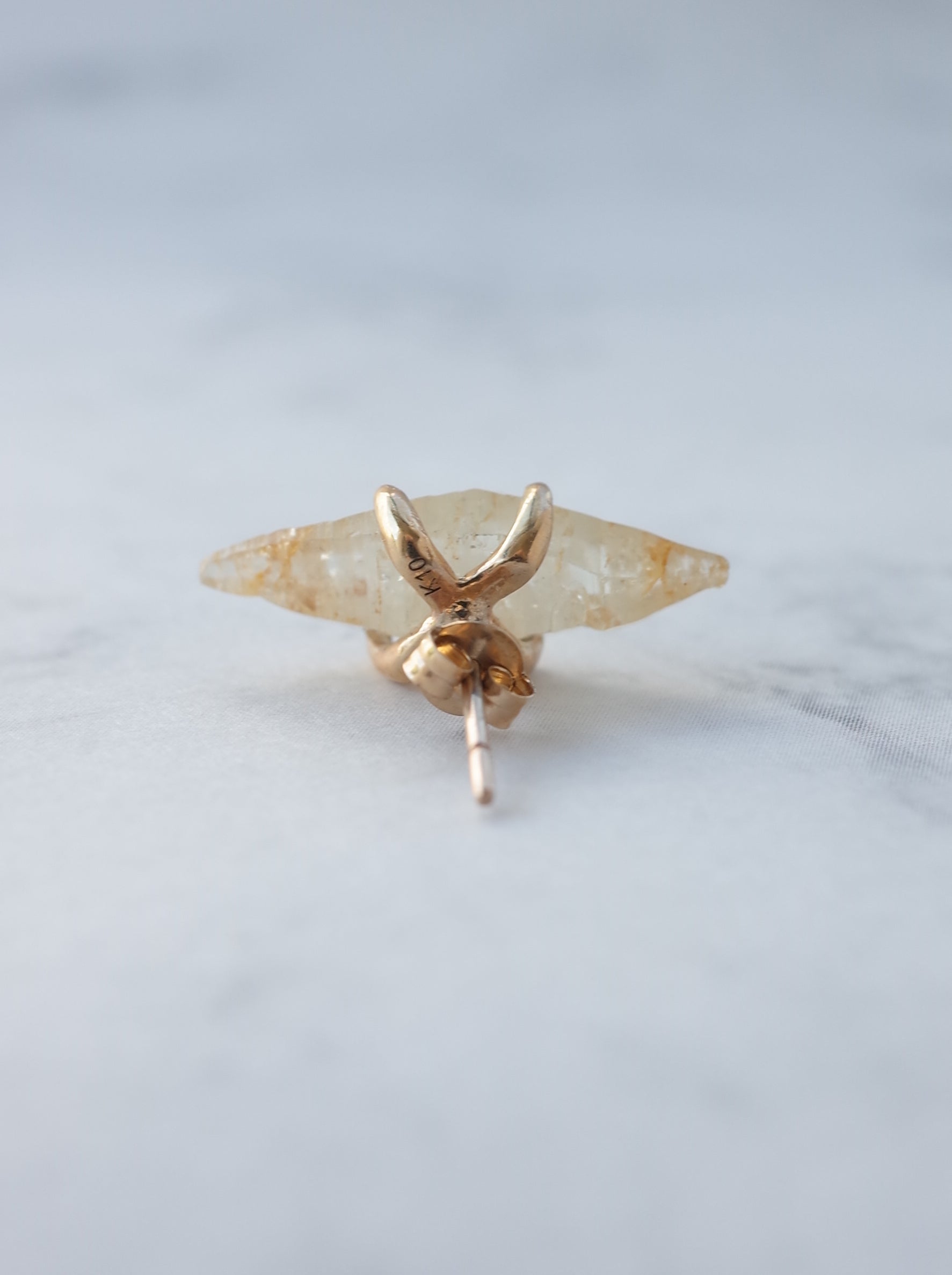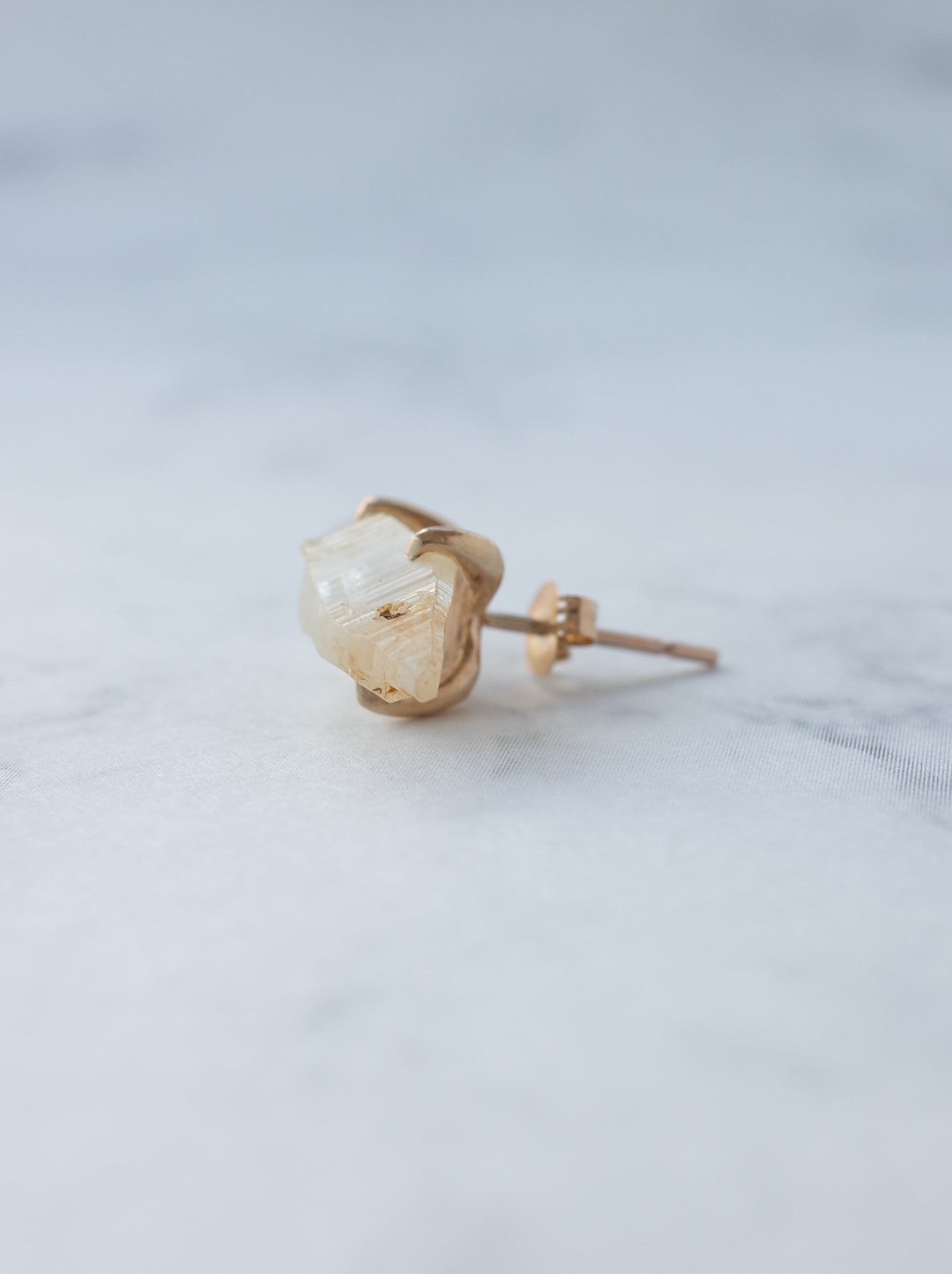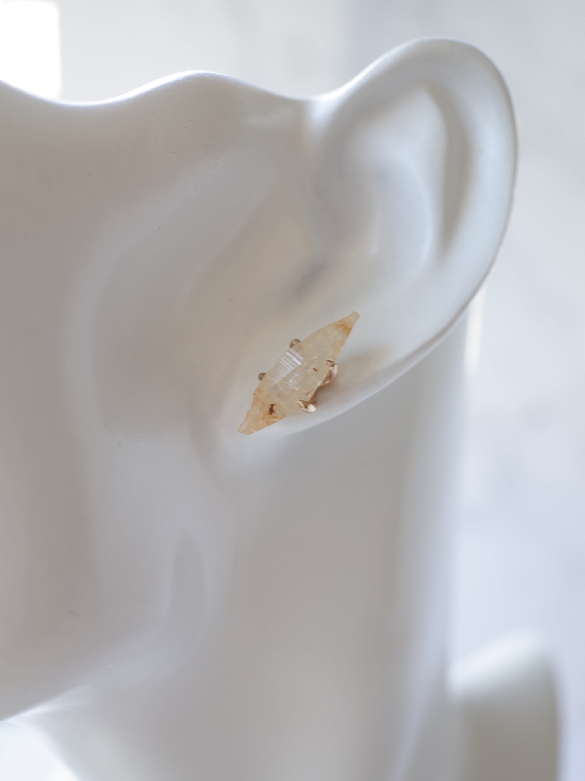 サファイアの結晶原石を使ったポストタイプのピアスです。両端が尖った美しいフォルムの結晶。自然が創り出した造形にも関わらず、ファッションスタイルの一つにもなっている『スタッド(鋲)』のような印象があり、クールさとナチュラルさを兼ね備えた魅力の一点です。スリランカ産らしい非加熱のナチュラルカラーも合わせてお楽しみください。