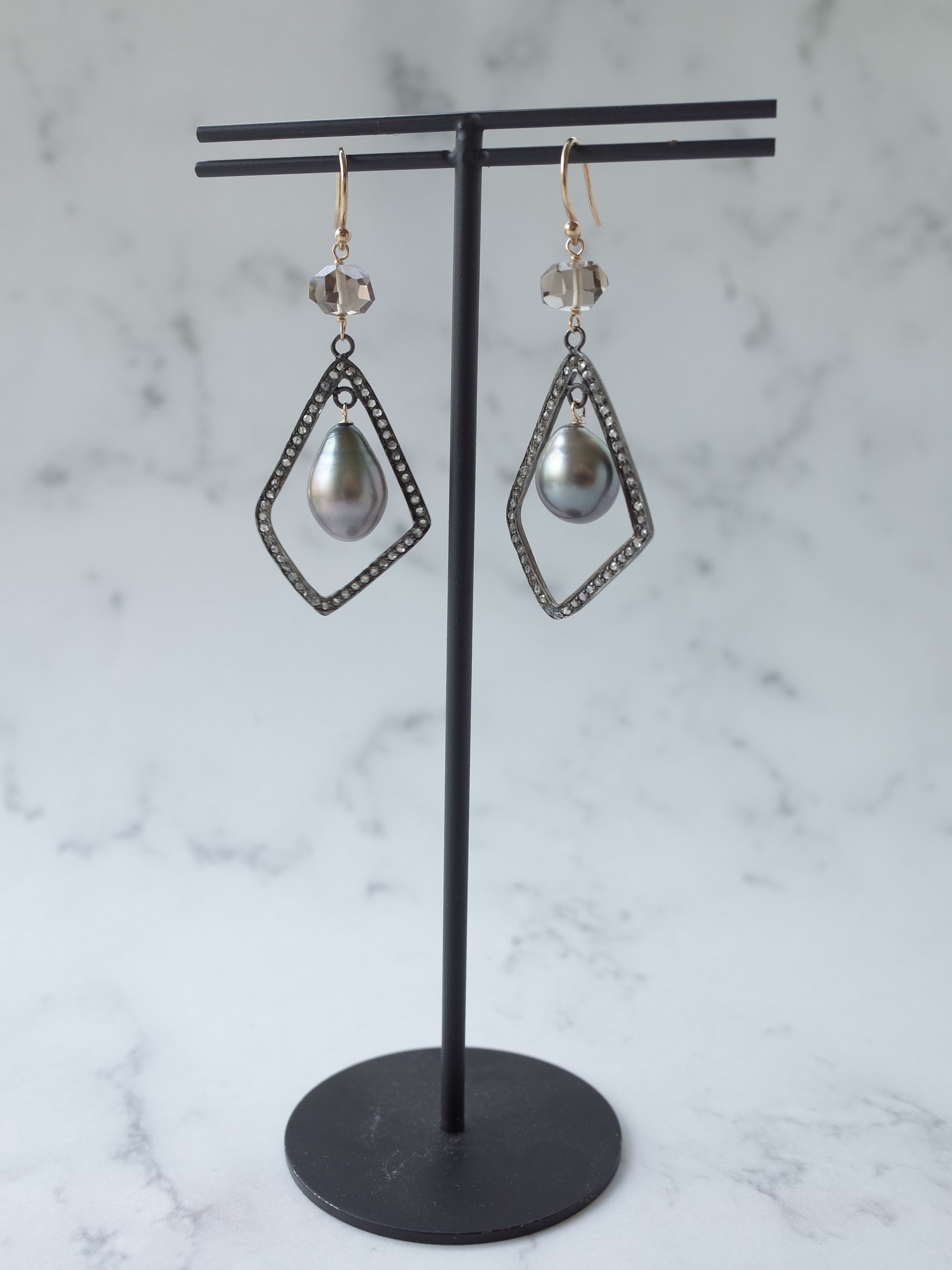 ダイヤモンドを散りばめたフープの中心に南洋パールをあしらったクールなピアス。非対称な雰囲気なフープに合わせて、敢えてパールの形状も不揃いにしました。
