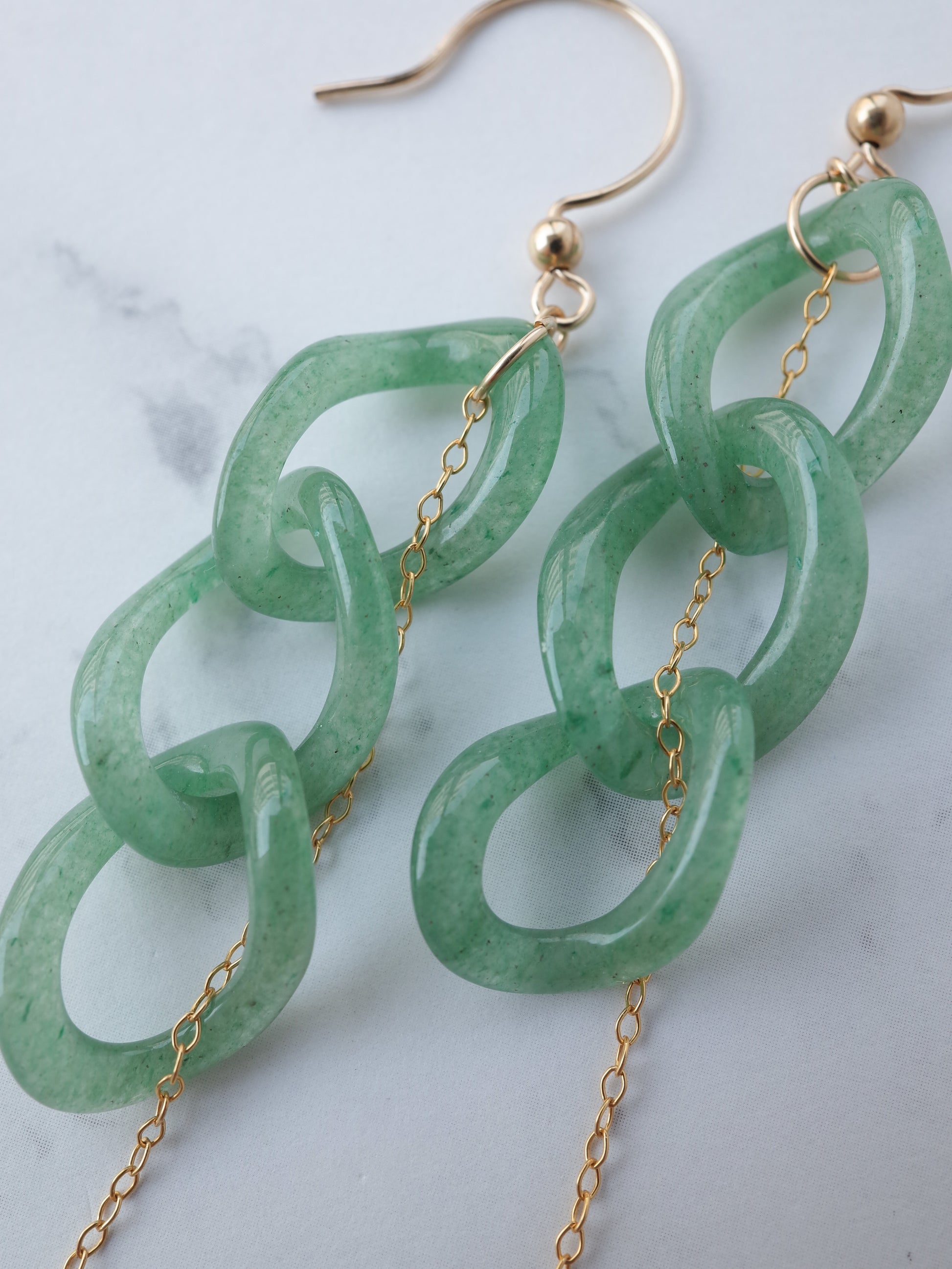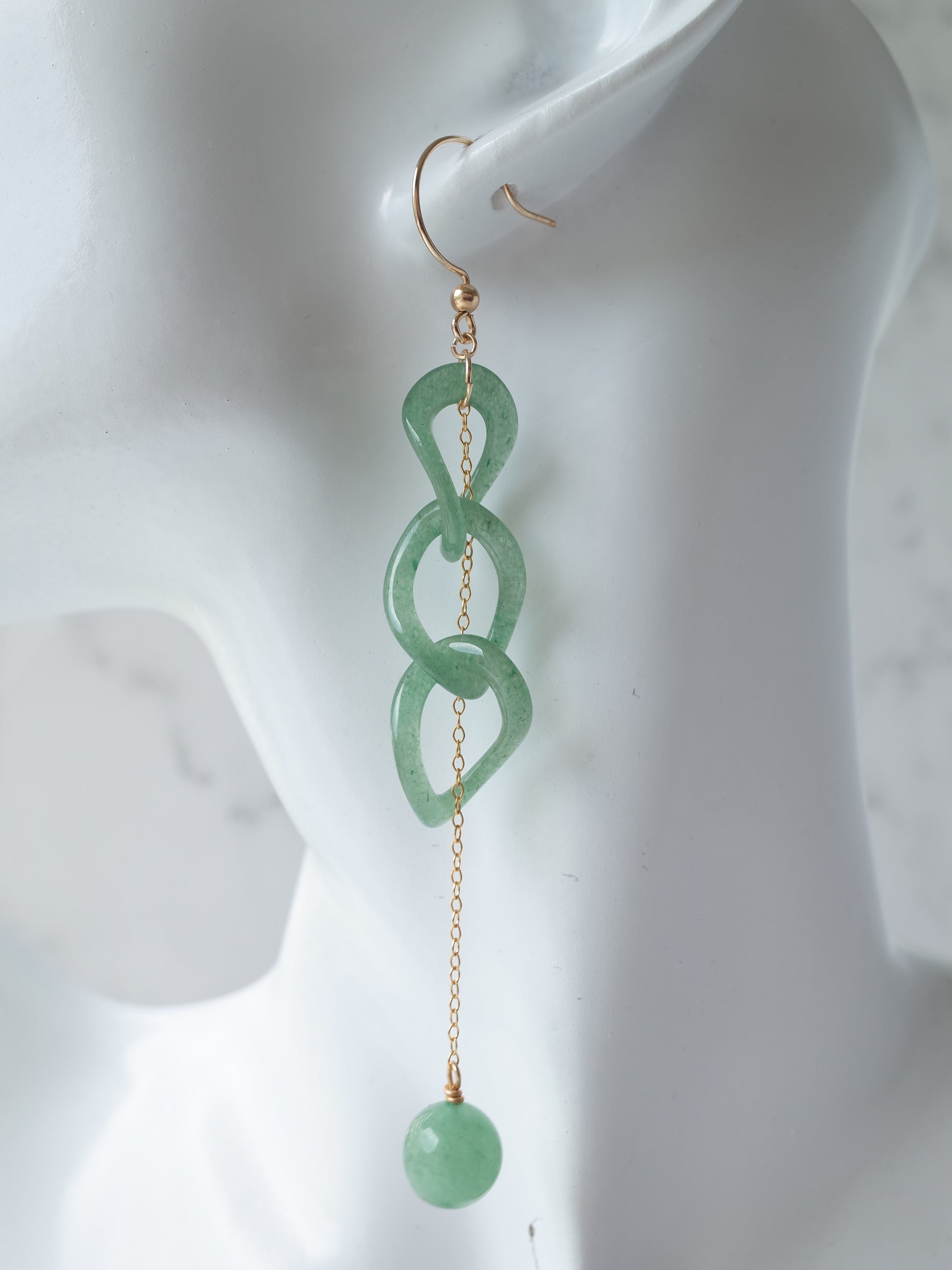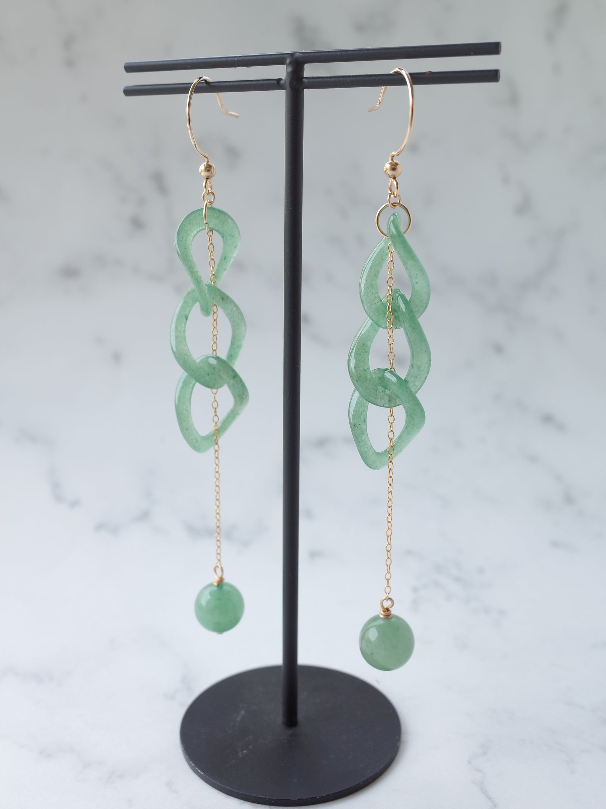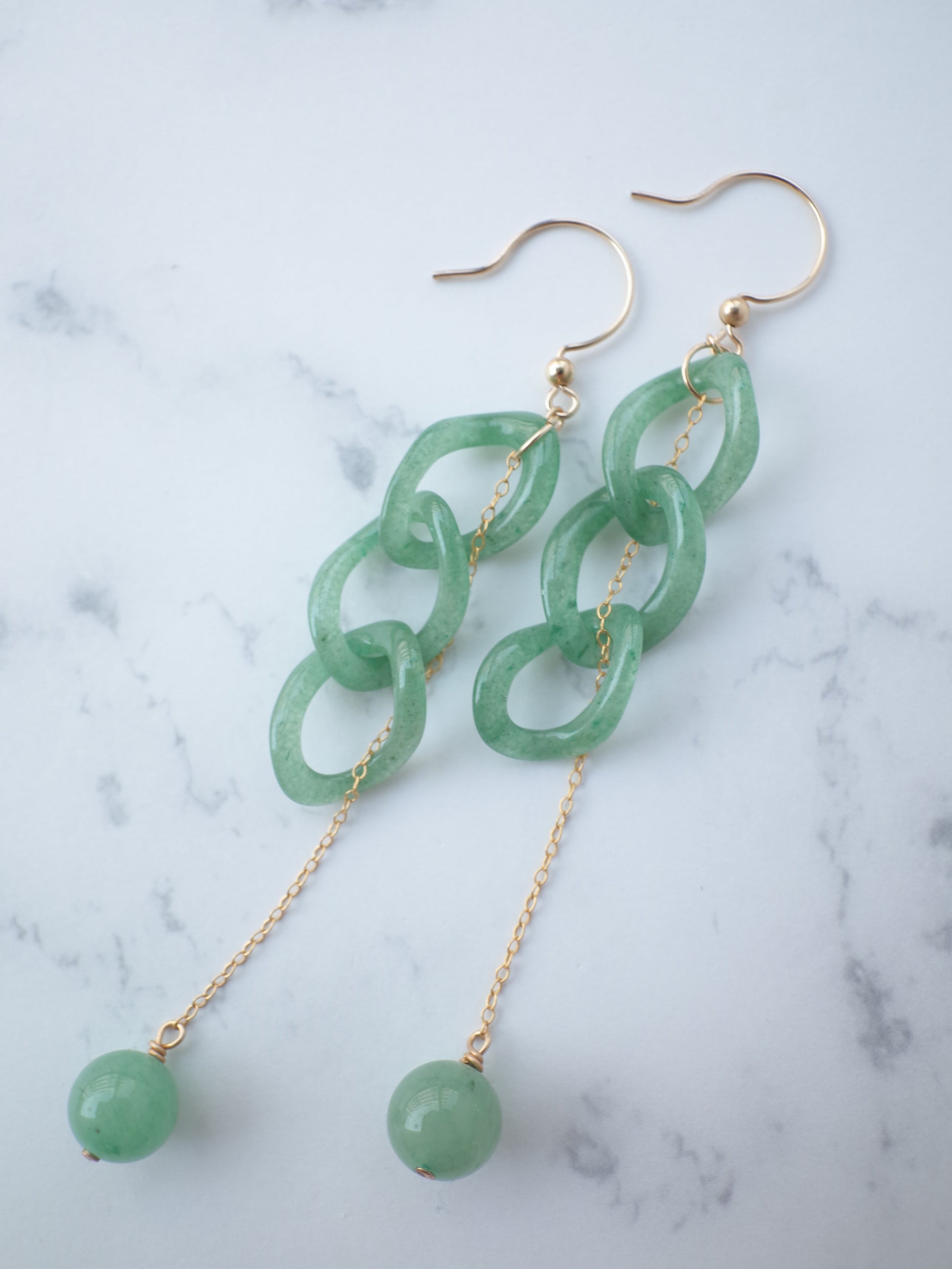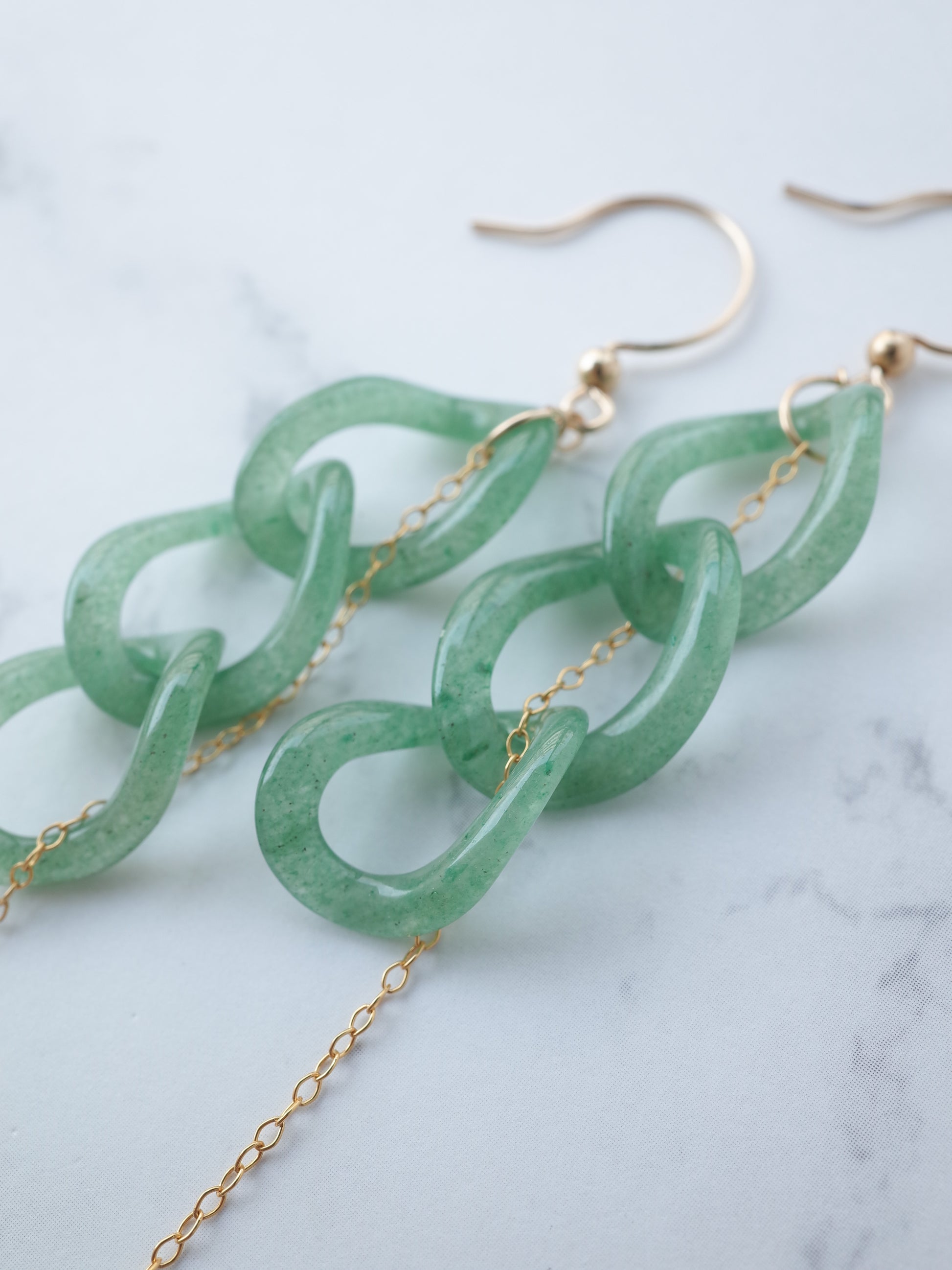 こちらは天然石をつなげた状態で彫り出した『石のチェーン』を使用したピアスです。独立した一つづつの輪をつなげているのではなく、一つの原石から繋がった状態で彫り出す高度な彫刻技法です。同じ素材の丸玉を合わせて、素材を活かしたピアスに仕立てました。是非職人の高い技術を、日々の装いの中の取り入れてみてください。