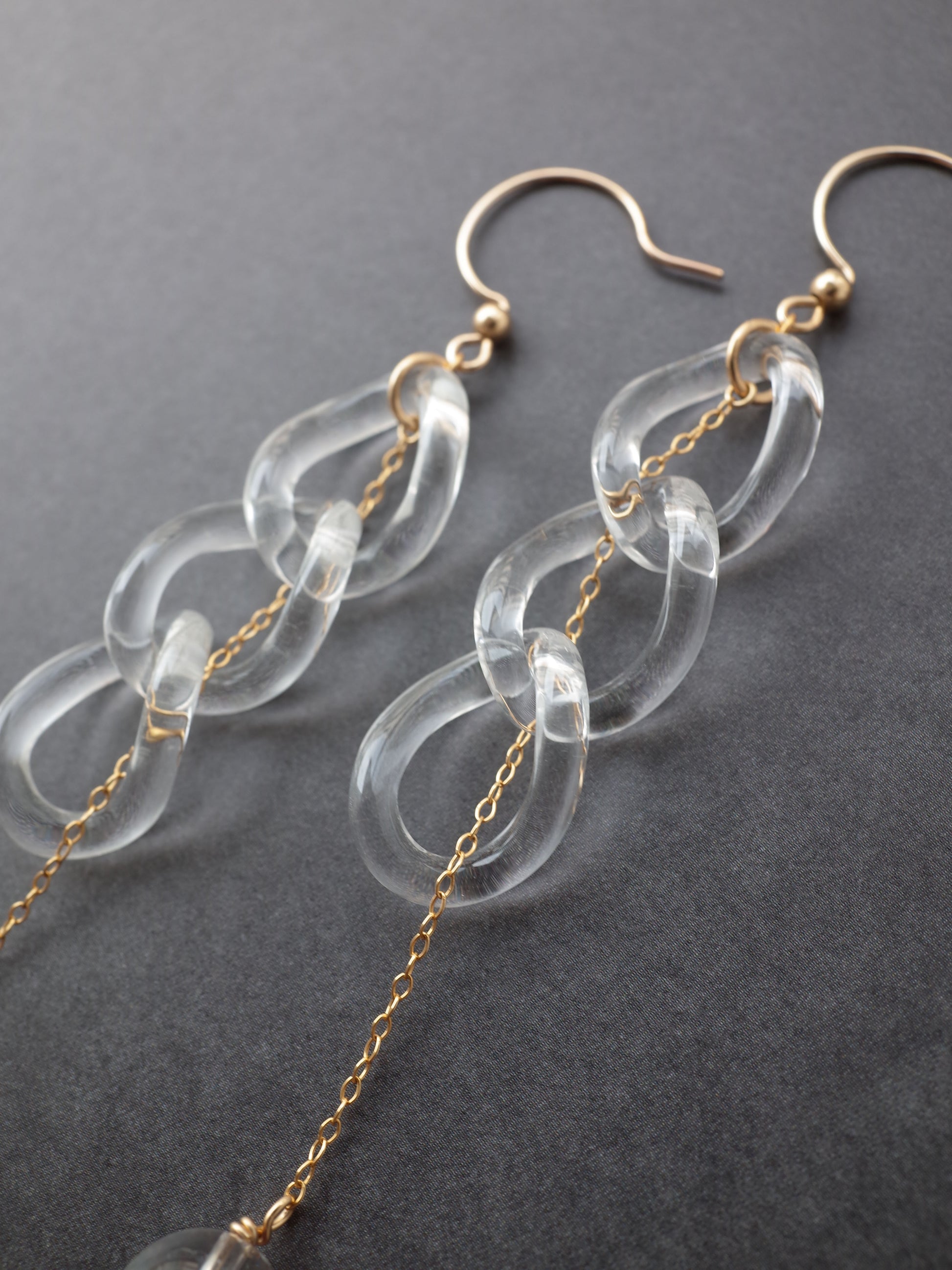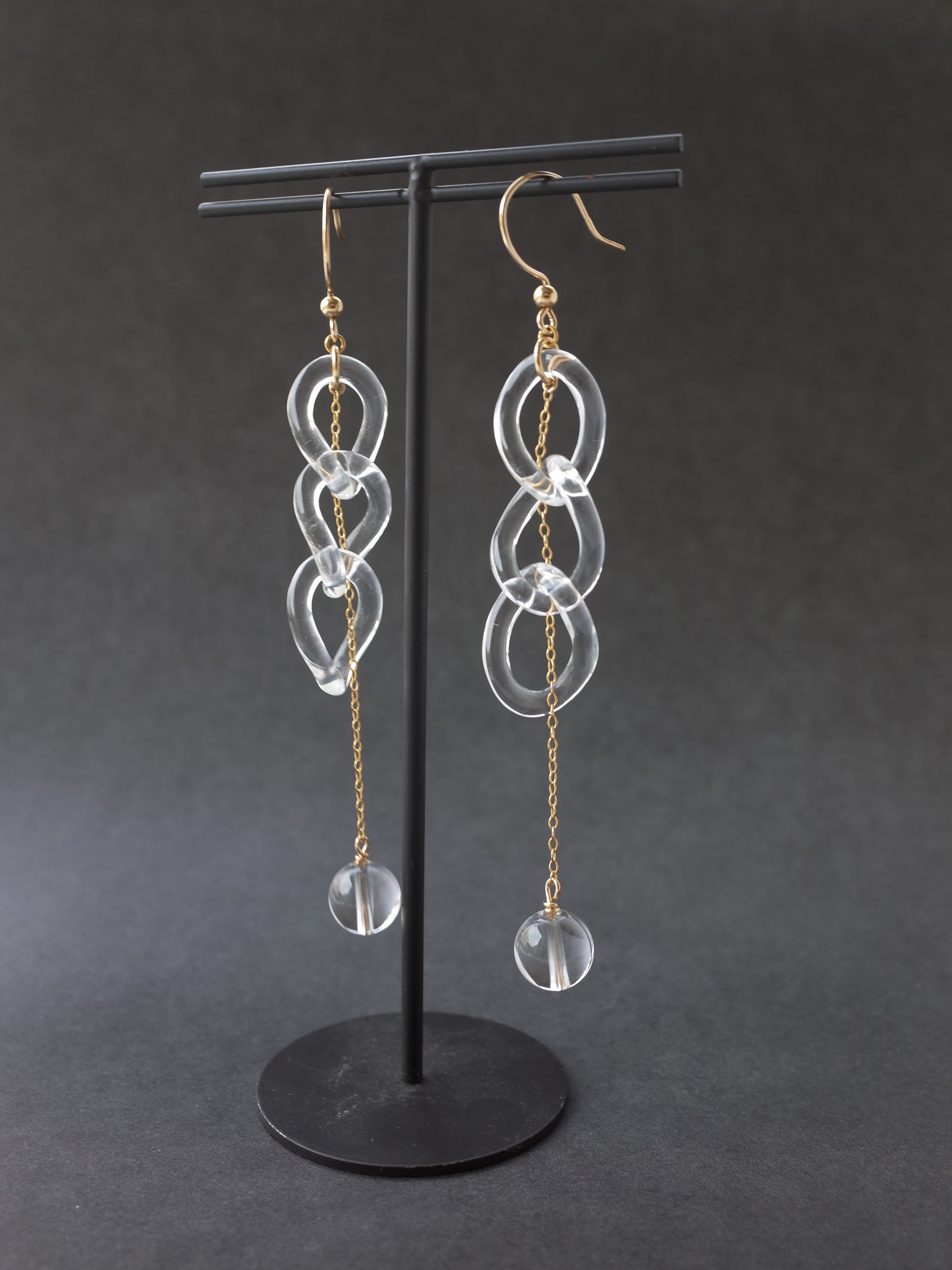 こちらは石をつなげた状態で彫り出した『石のチェーン』を使用したピアスです。独立した一つづつの輪をつなげているのではなく、一つの原石から繋がった状態で彫り出す高度な彫刻技法です。同じ素材の丸玉を合わせて、素材を活かしたピアスに仕立てました。是非職人の高い技術を、日々の装いの中の取り入れてみてください。