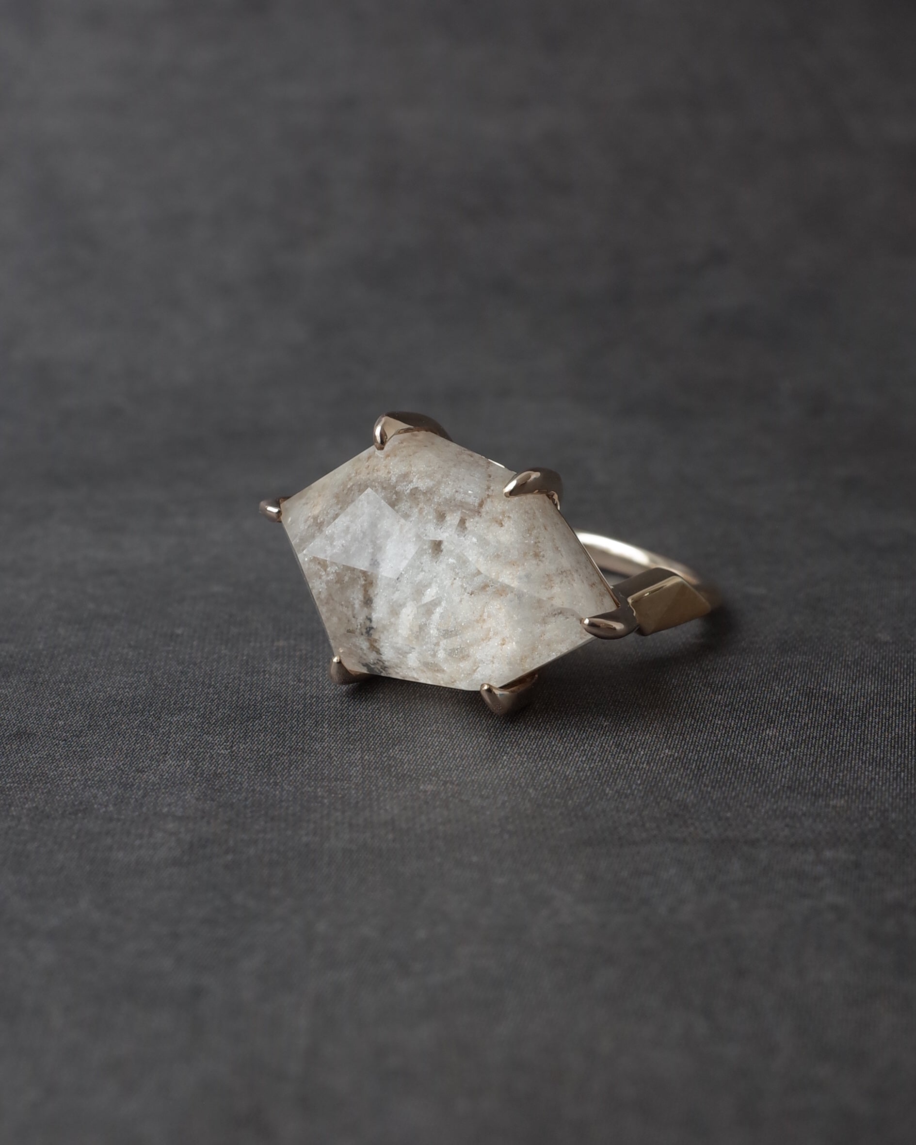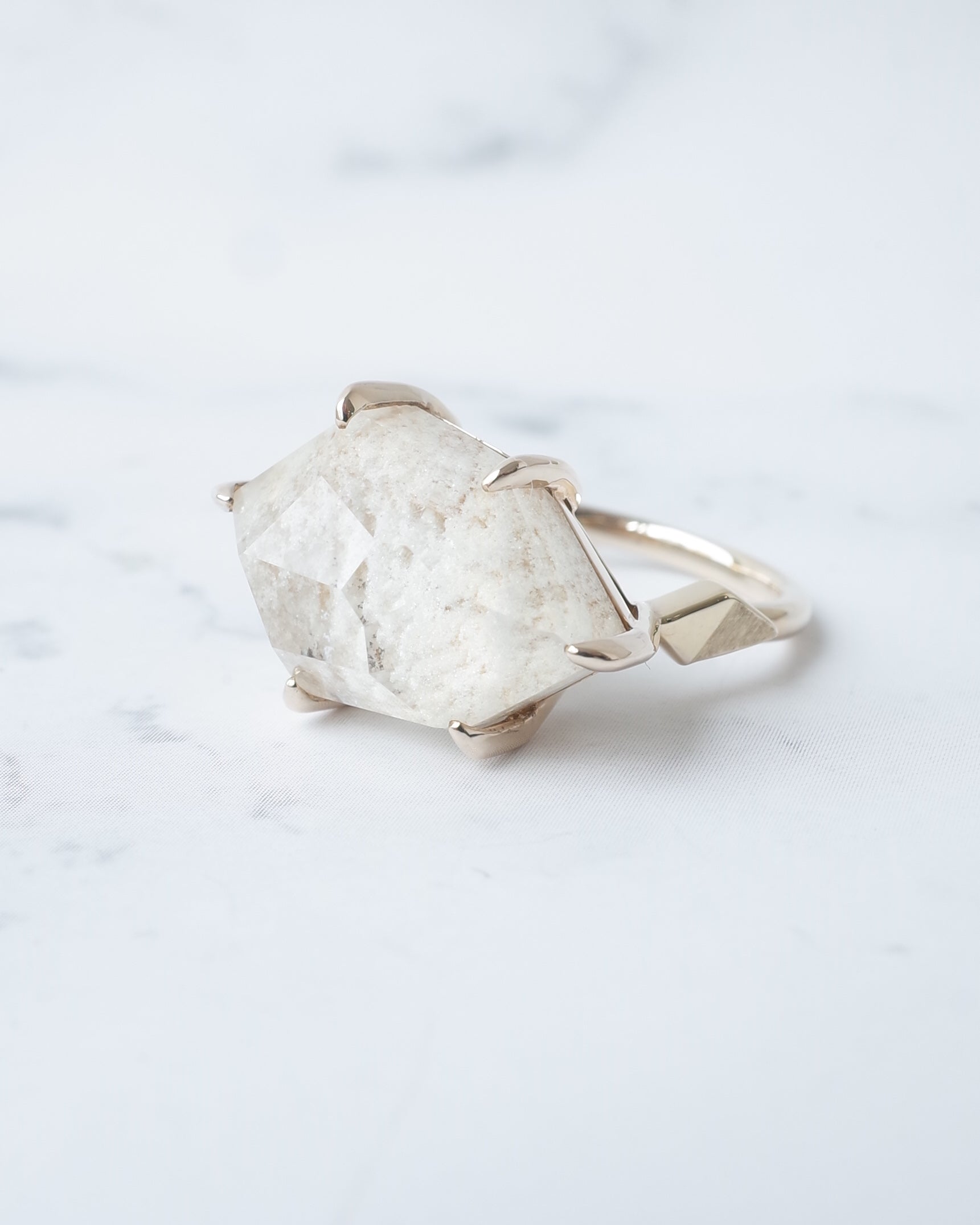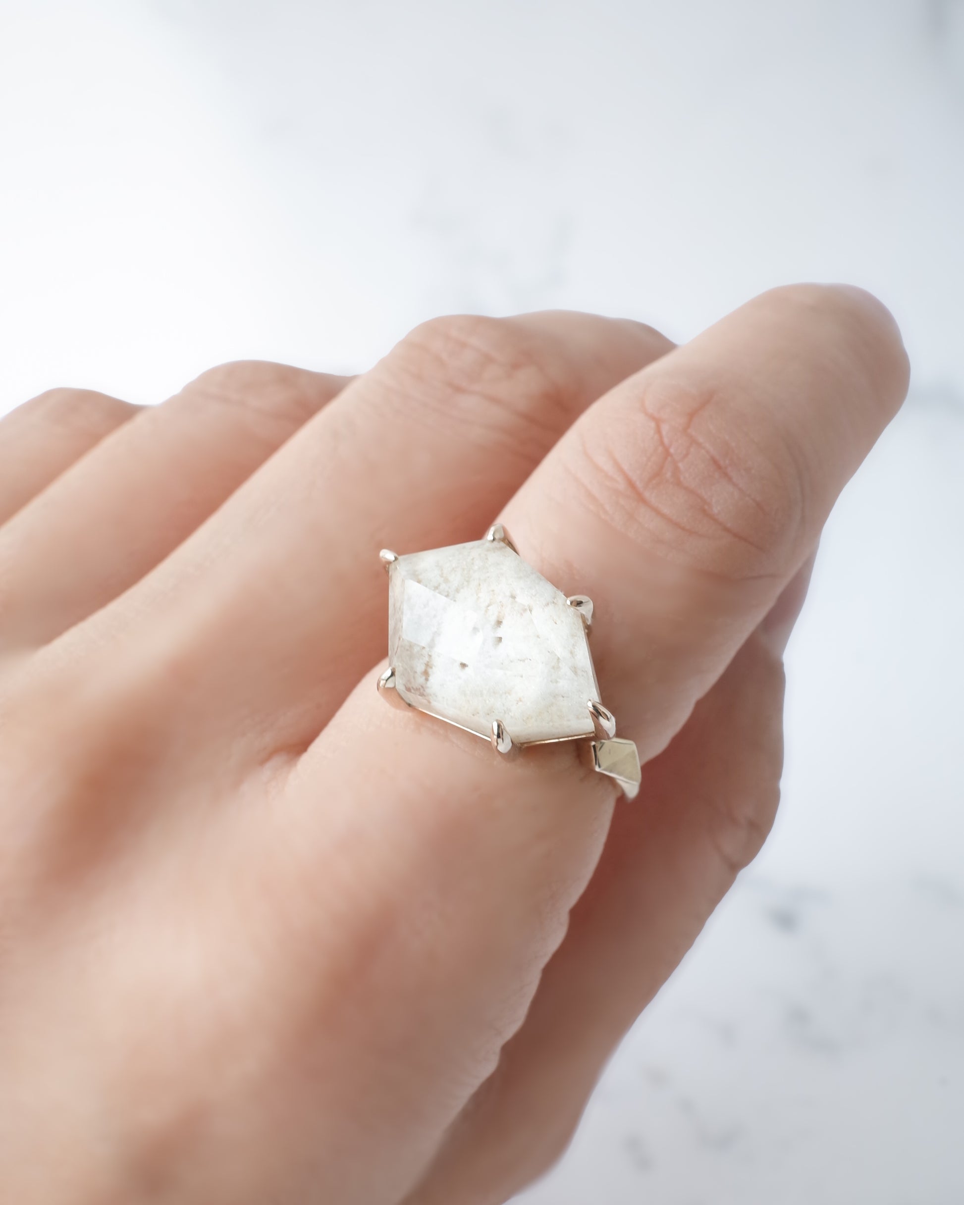 真っ白なホワイトガーデンクォーツを、ランダムなアウトラインで切り取ったスタイリッシュなリングです。