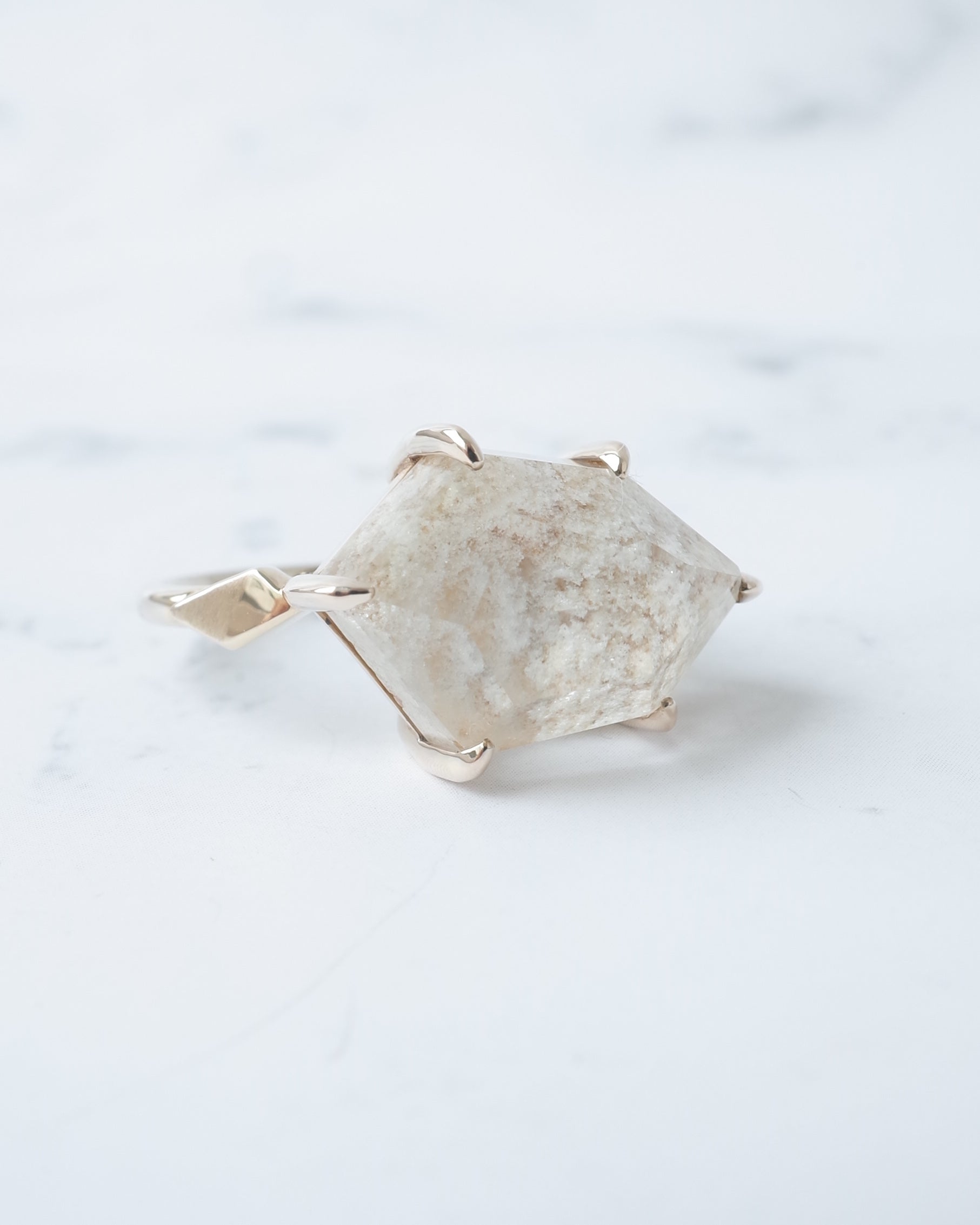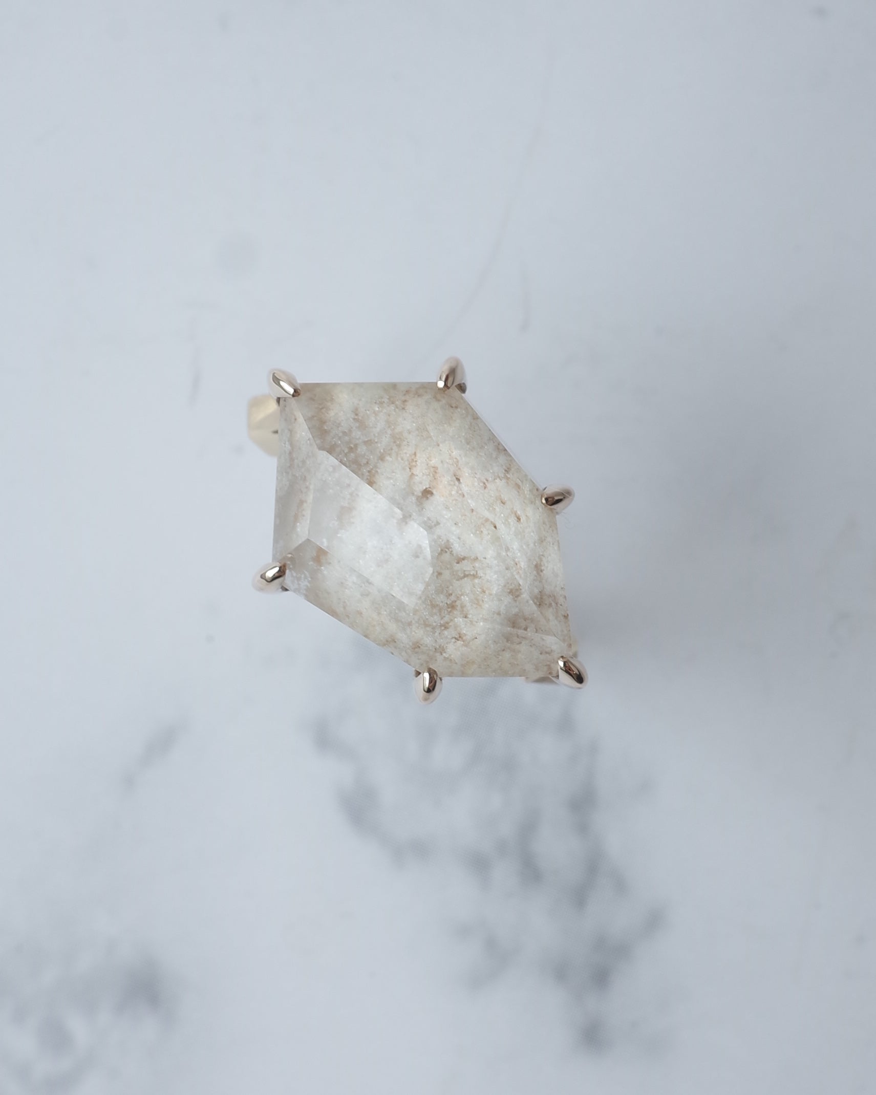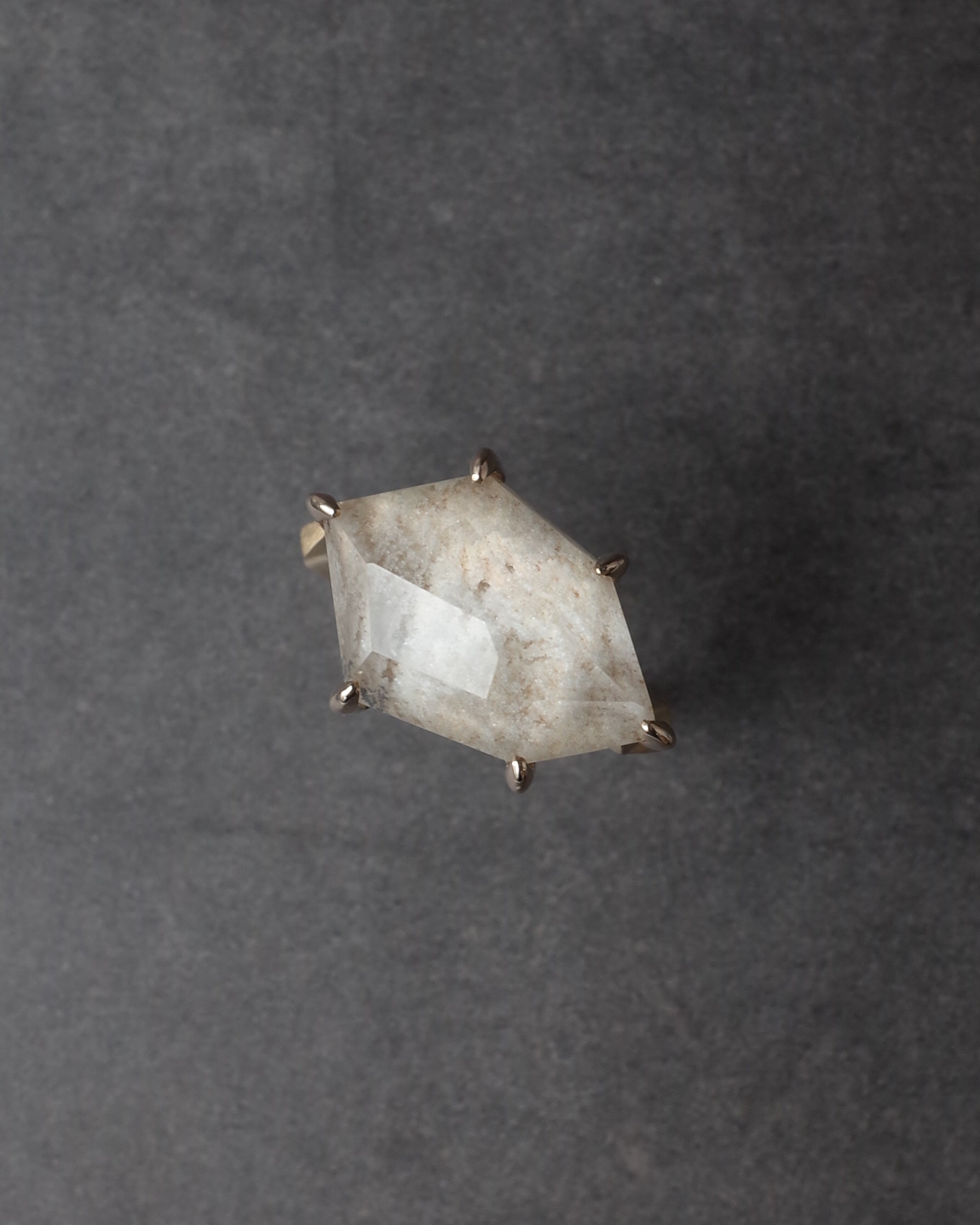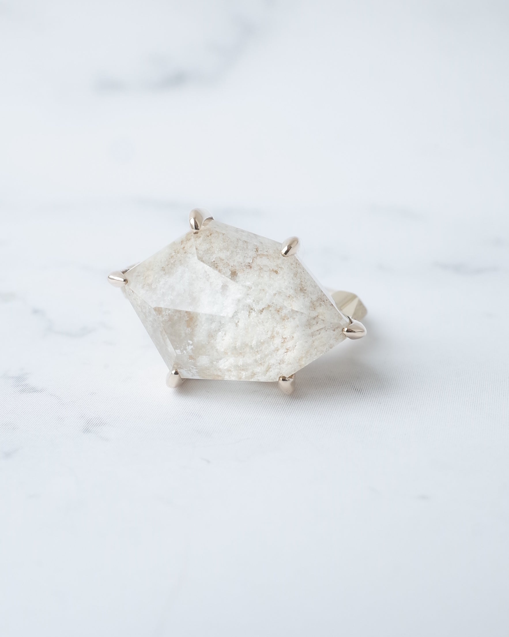 真っ白なホワイトガーデンクォーツを、ランダムなアウトラインで切り取ったスタイリッシュなリングです。